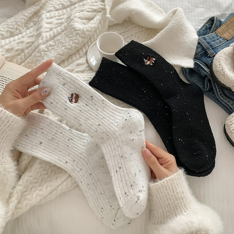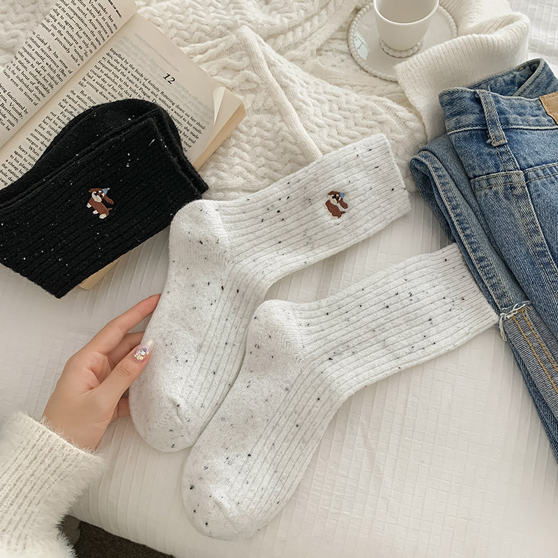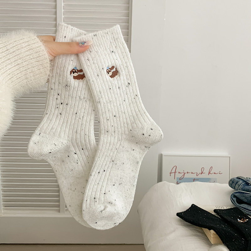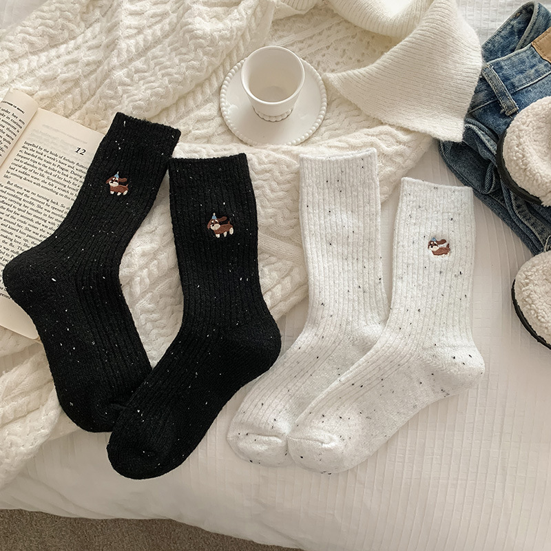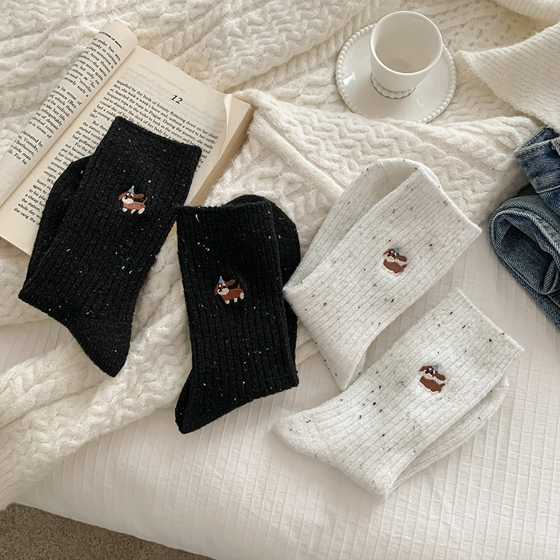 양말 여성의 가을과 겨울 새로운 한국 Ins 여성 양말 냄비 원사 양모 중간 크기 양말 귀여운 강아지 자수 작은 동물