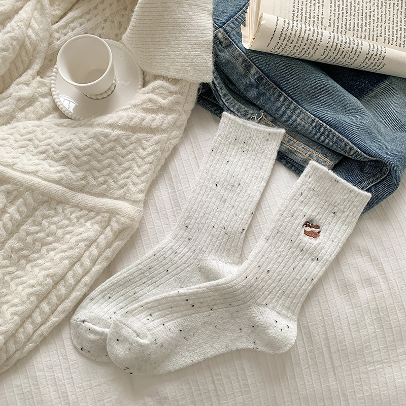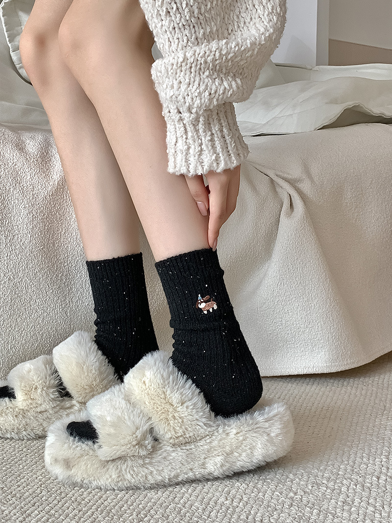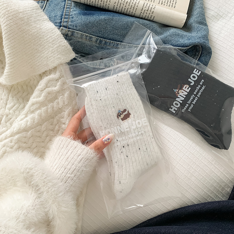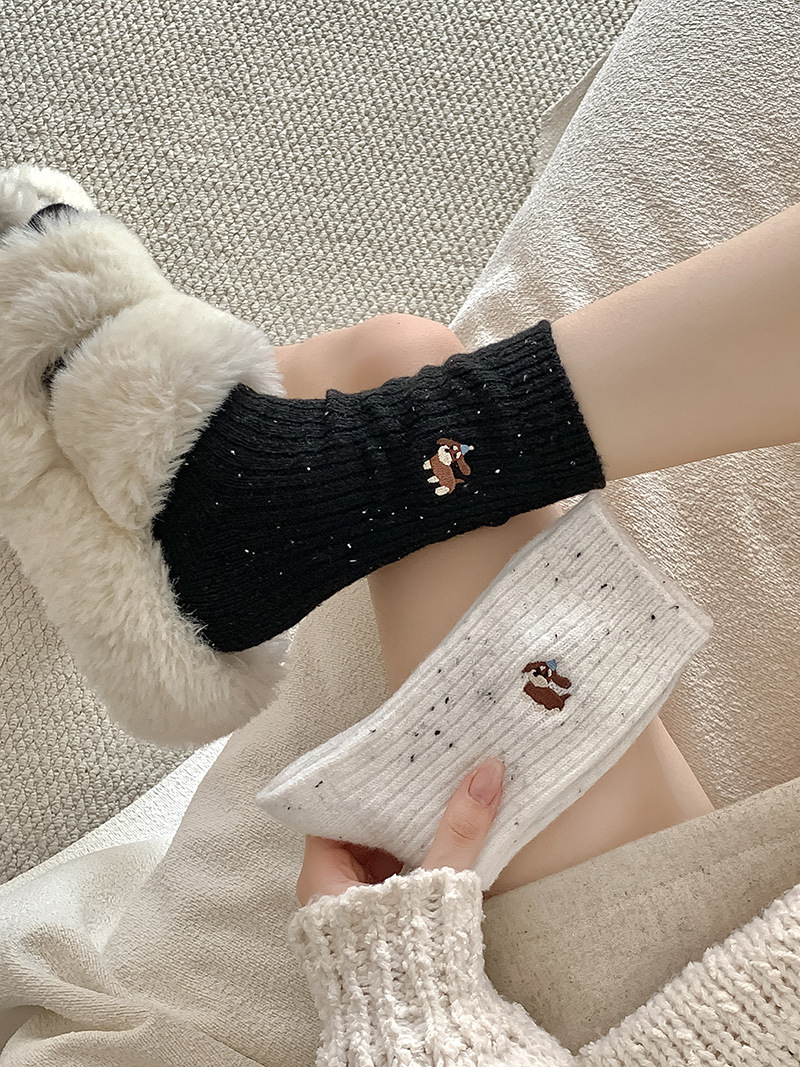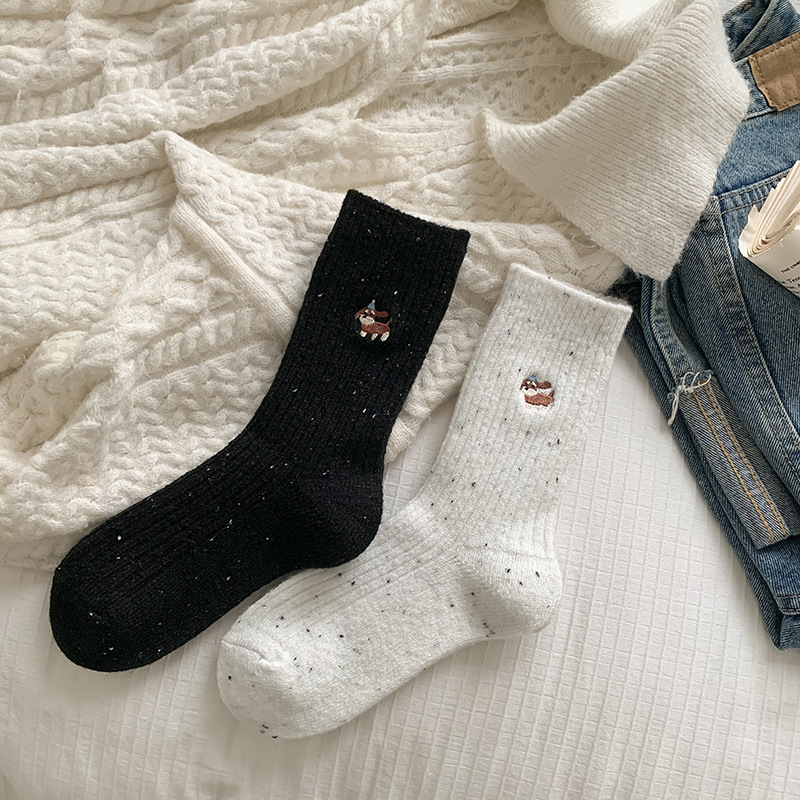 양말 여성의 가을과 겨울 새로운 한국 Ins 여성 양말 냄비 원사 양모 중간 크기 양말 귀여운 강아지 자수 작은 동물