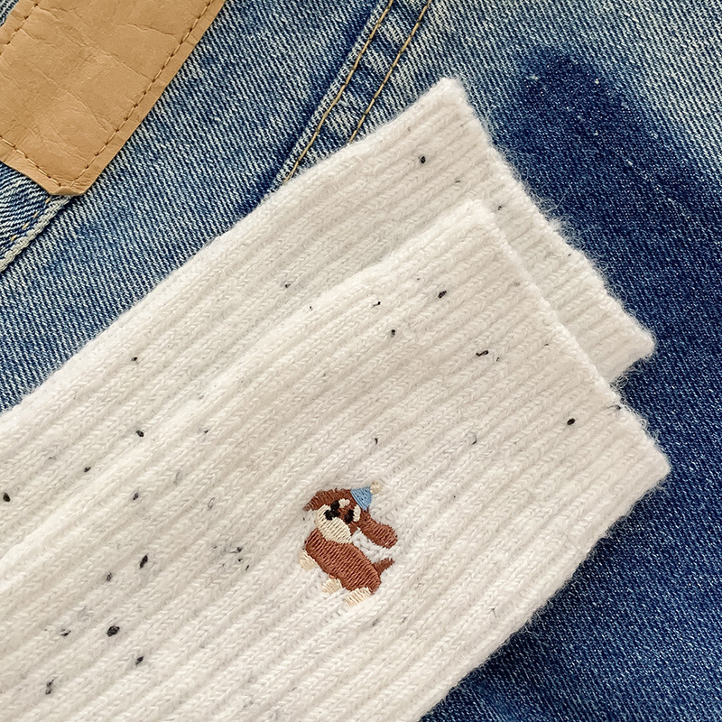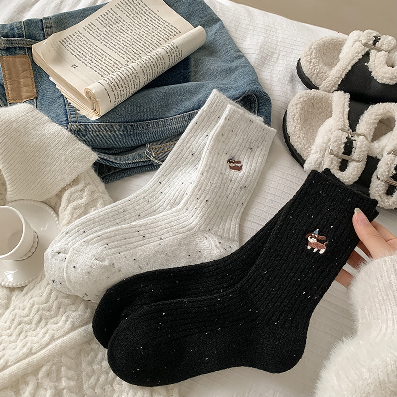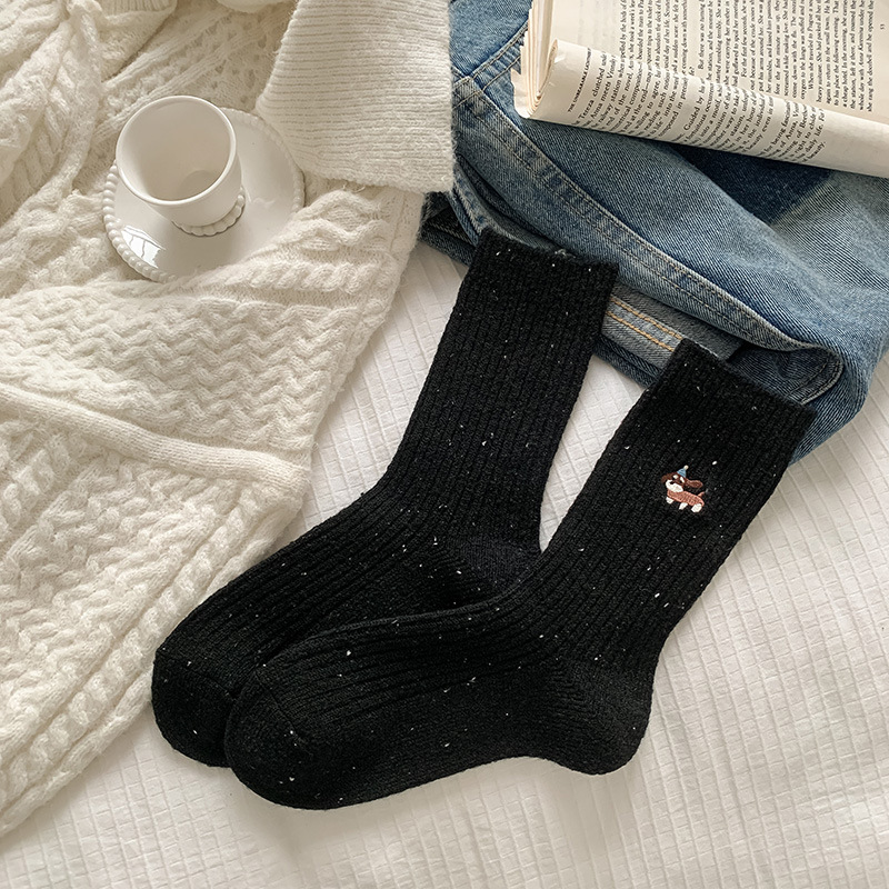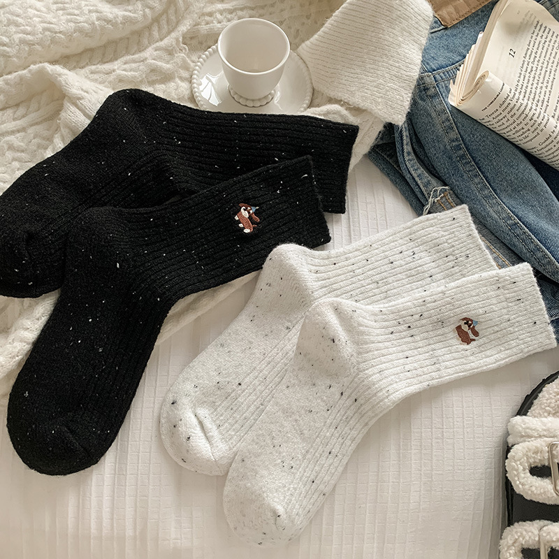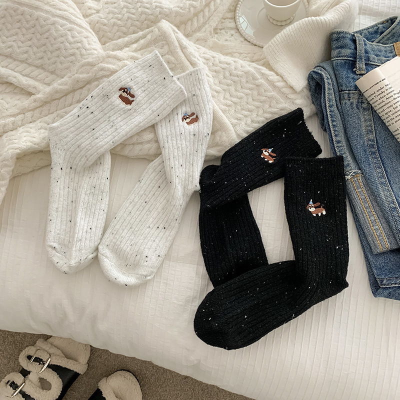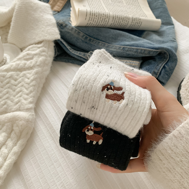 양말 여성의 가을과 겨울 새로운 한국 Ins 여성 양말 냄비 원사 양모 중간 크기 양말 귀여운 강아지 자수 작은 동물스토어 가기