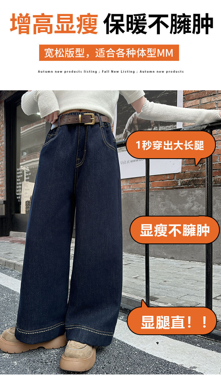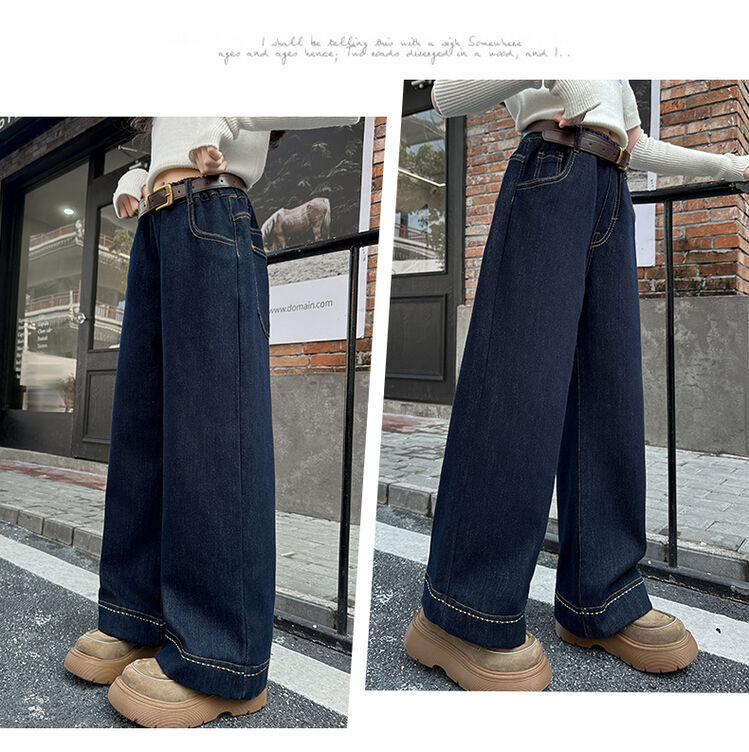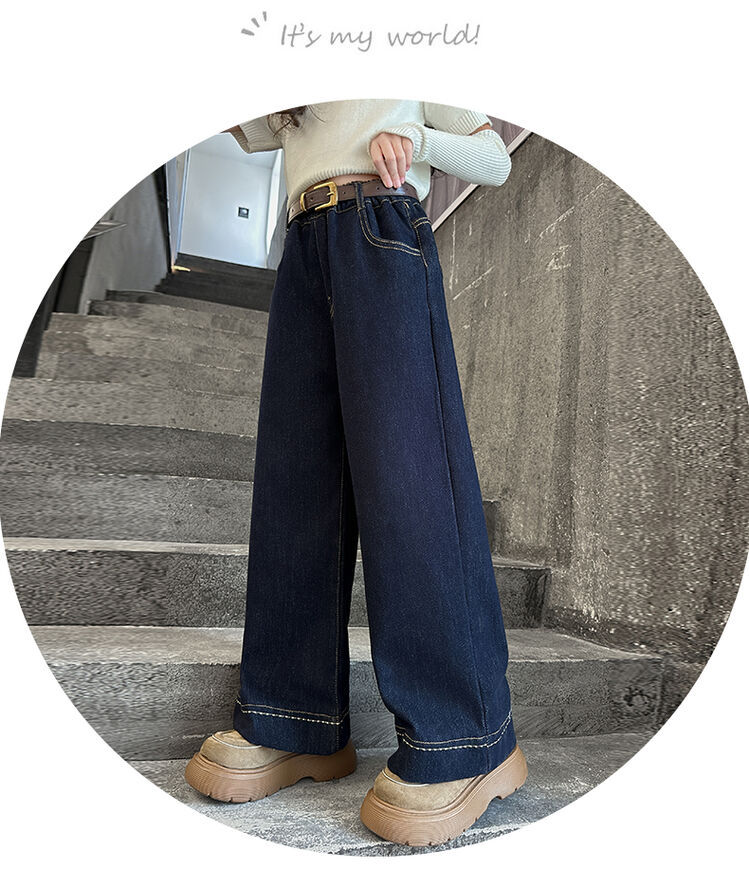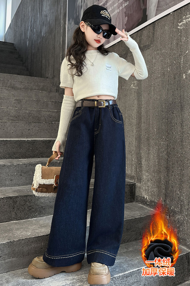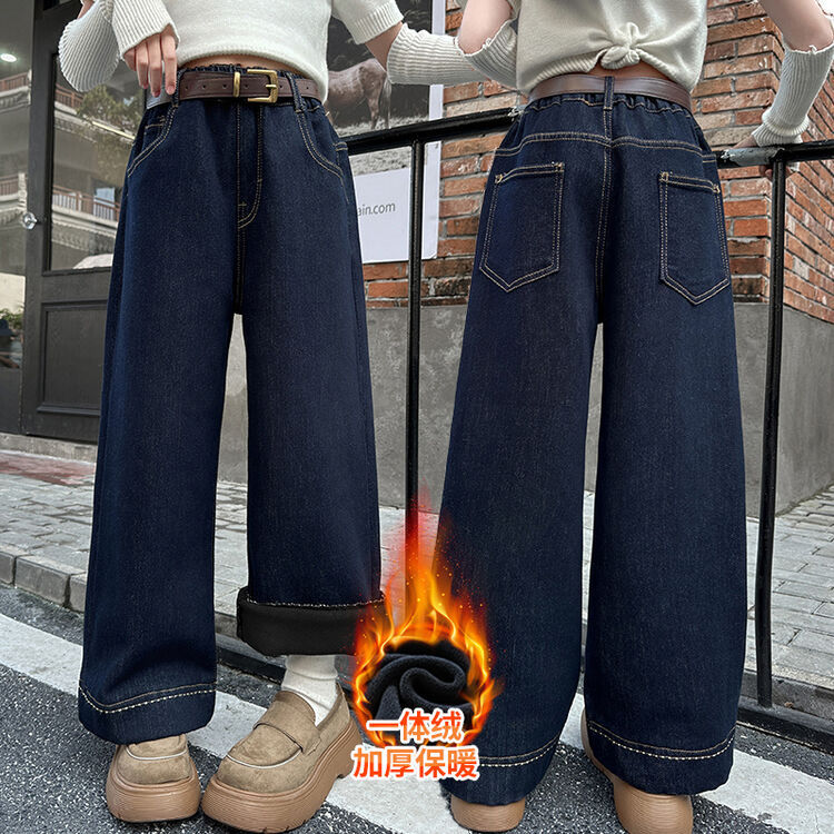 소녀 기모 청바지 가을 겨울 2024 새로운 어린이 캐주얼 원피스 벨벳 와이드 레그 바지 대형 어린이 서양식 바지스토어 가기