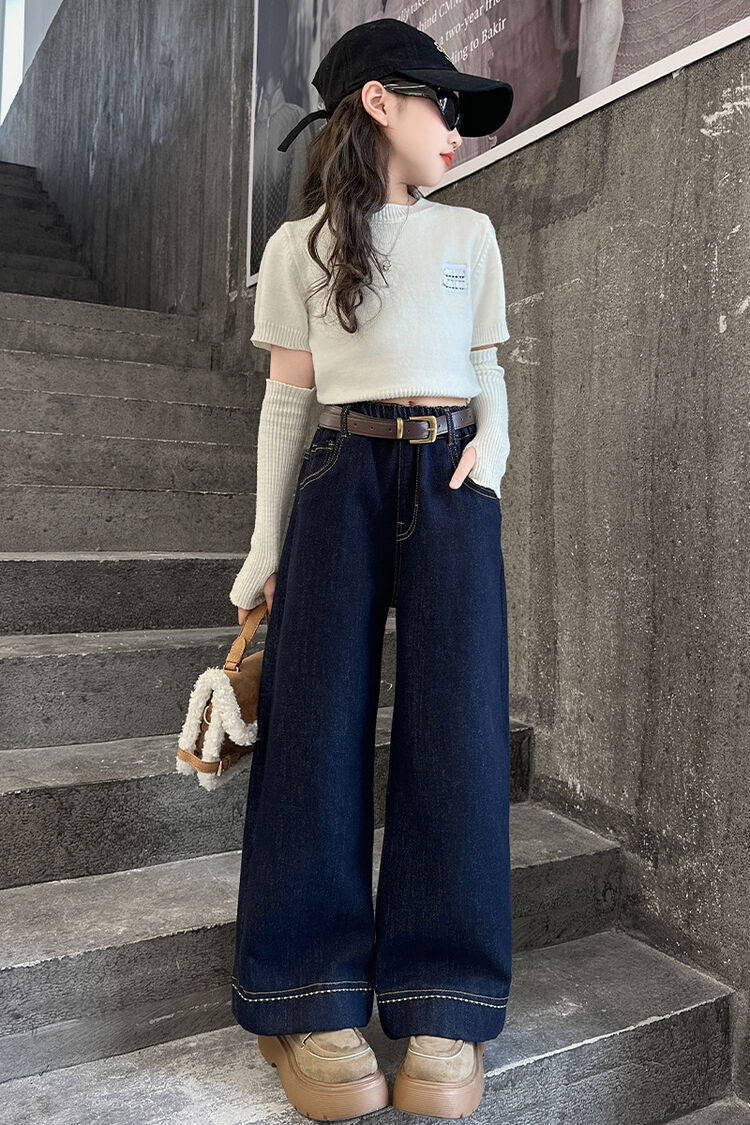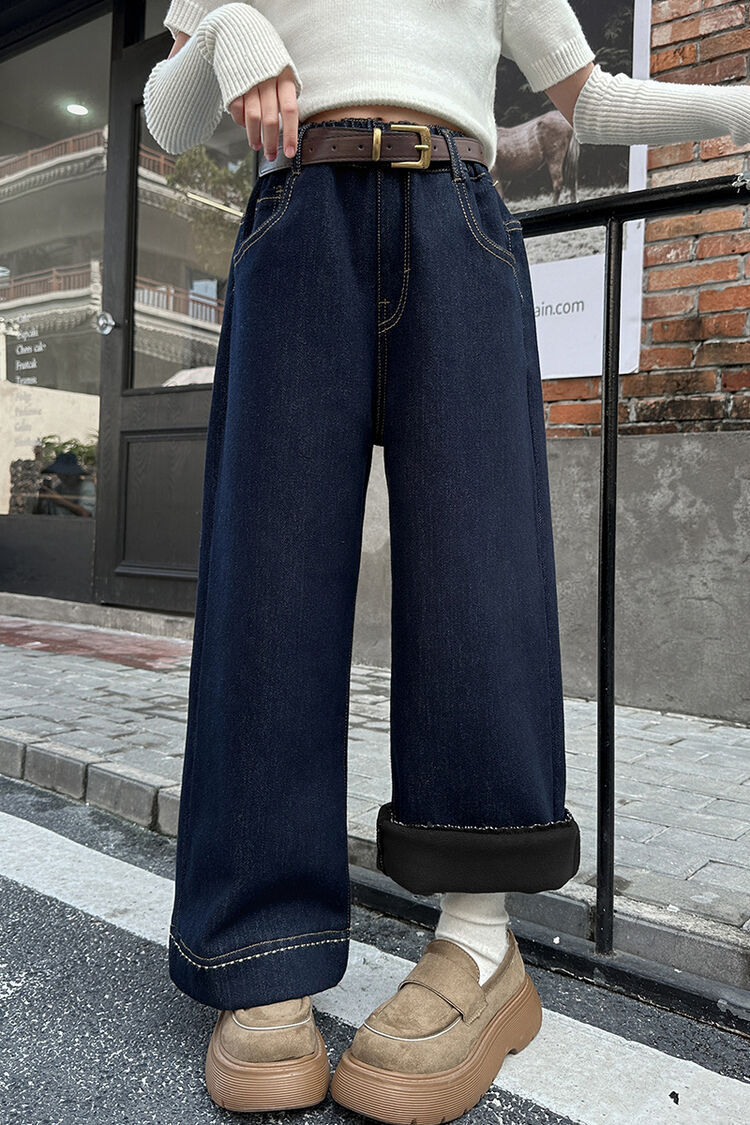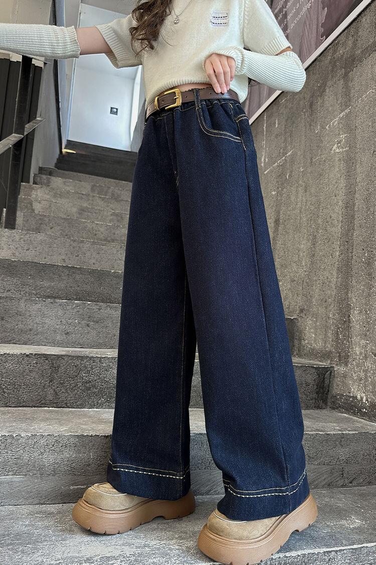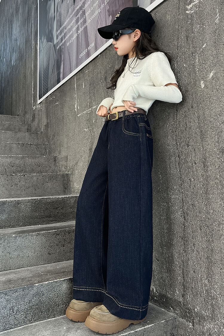 소녀 기모 청바지 가을 겨울 2024 새로운 어린이 캐주얼 원피스 벨벳 와이드 레그 바지 대형 어린이 서양식 바지