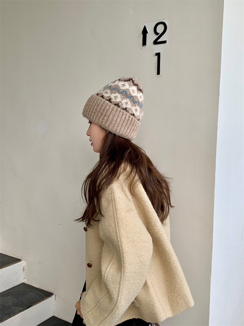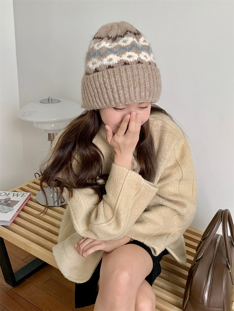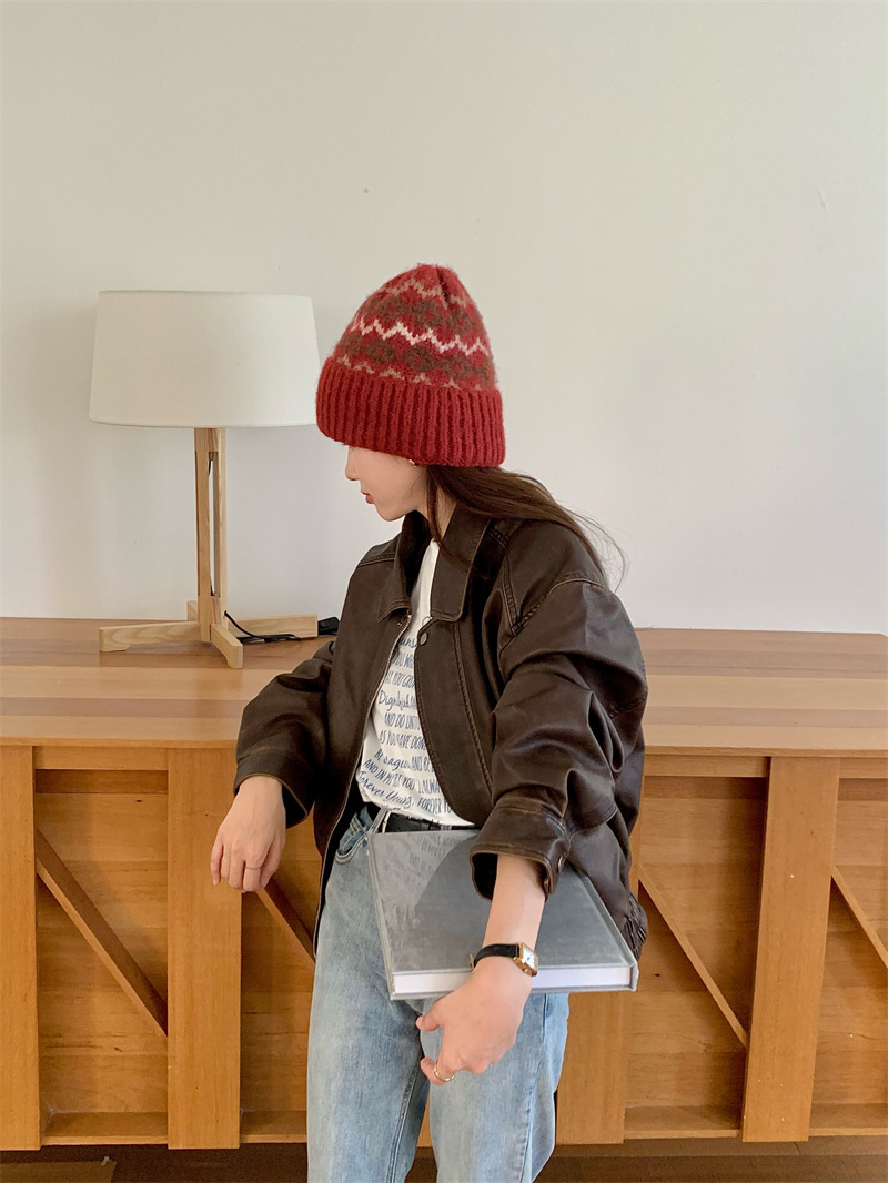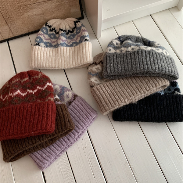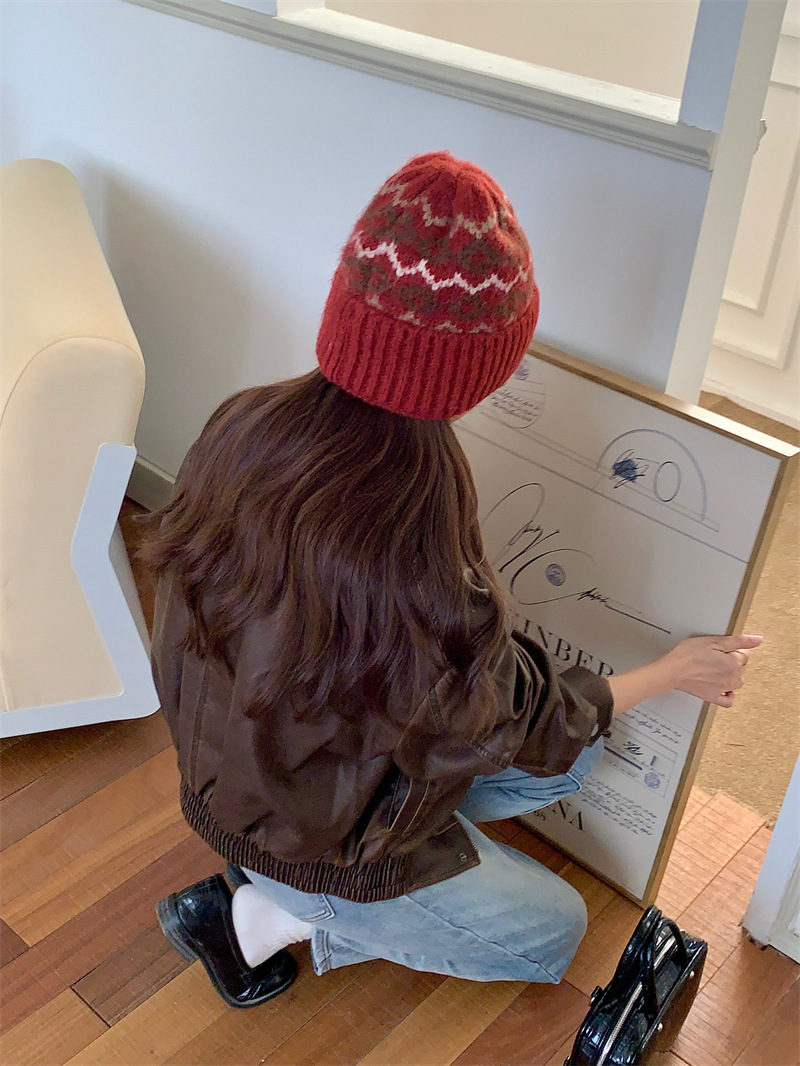 페어아일랜드 분위기 작은 빨간 모자 마름모꼴 따뜻한 귀 보호 크리스마스 모자 한국 Ins 주름 니트 양모 모자스토어 가기