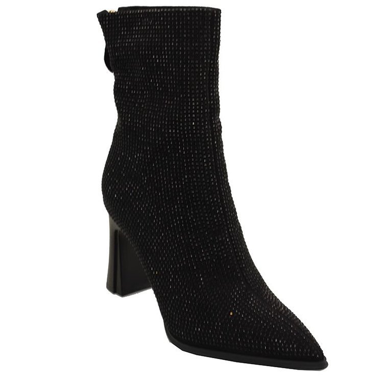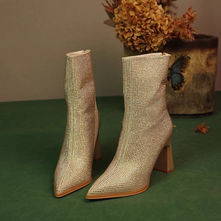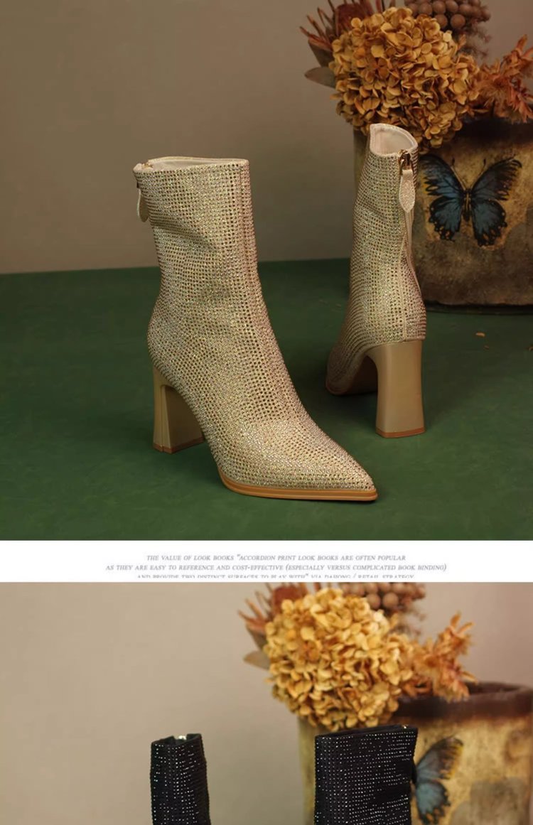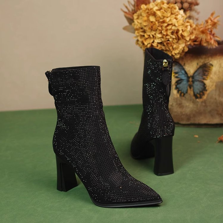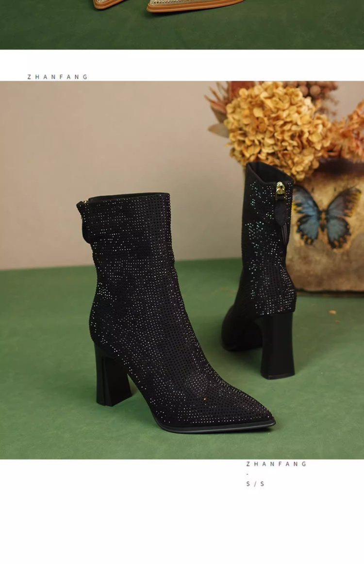 2024 년 가을과 겨울 새로운 한국 스타일 라인스톤을 가리키는 하이힐 쇼트 부츠 얇은 부츠 유행 두꺼운 힐 탄성 부츠