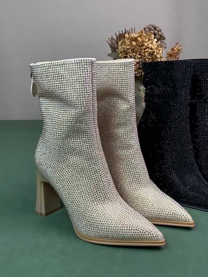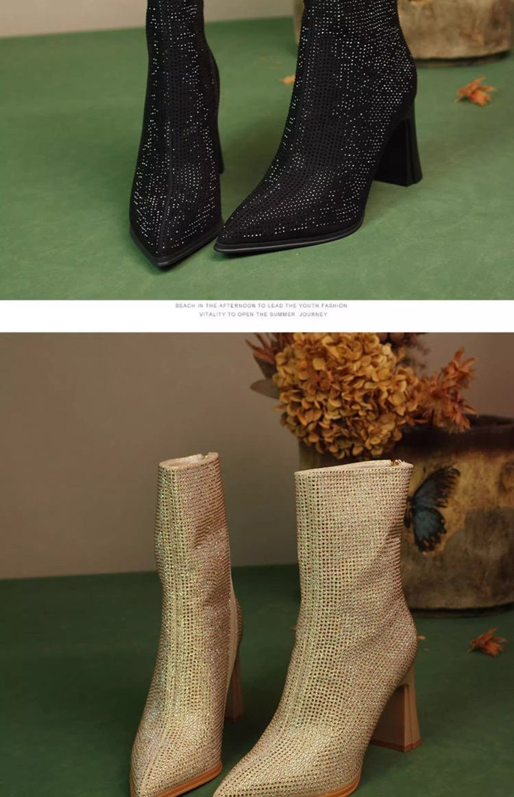 2024 년 가을과 겨울 새로운 한국 스타일 라인스톤을 가리키는 하이힐 쇼트 부츠 얇은 부츠 유행 두꺼운 힐 탄성 부츠스토어 가기