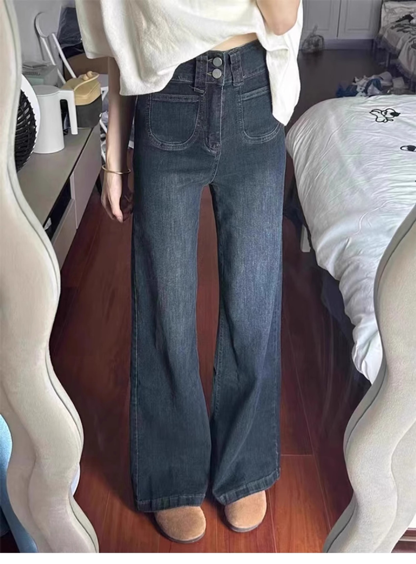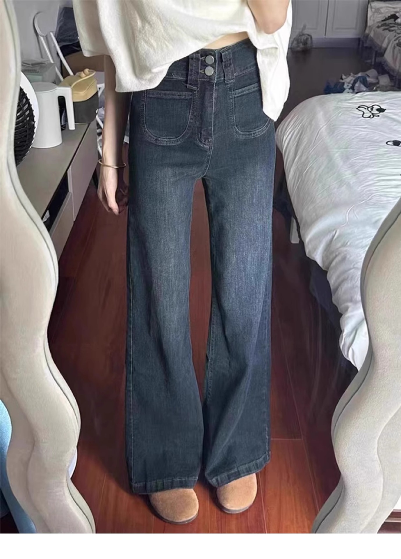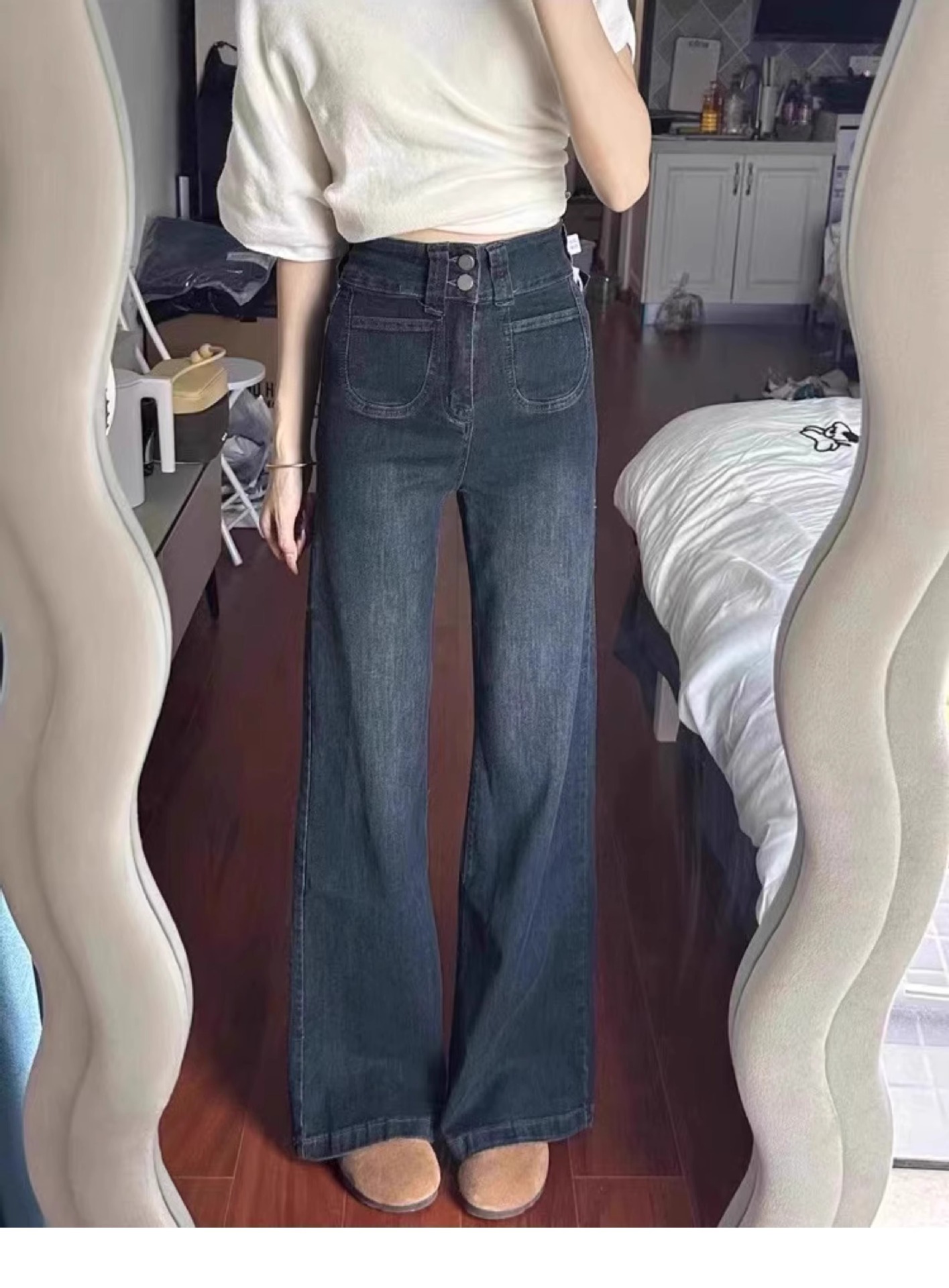 빈티지 스트레이트-다리 청바지 여성의 높은 허리 플러스 사이즈 가을과 겨울 기모 통통녀 느슨한 슬리밍 배 모양 넓은 다리 바지스토어 가기