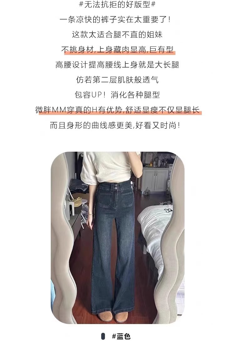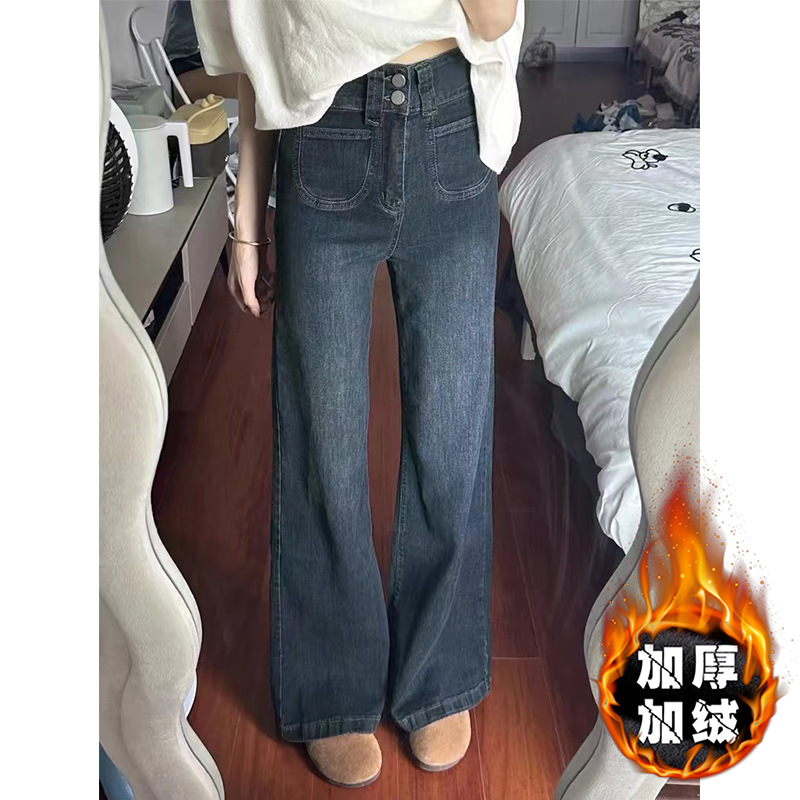 빈티지 스트레이트-다리 청바지 여성의 높은 허리 플러스 사이즈 가을과 겨울 기모 통통녀 느슨한 슬리밍 배 모양 넓은 다리 바지