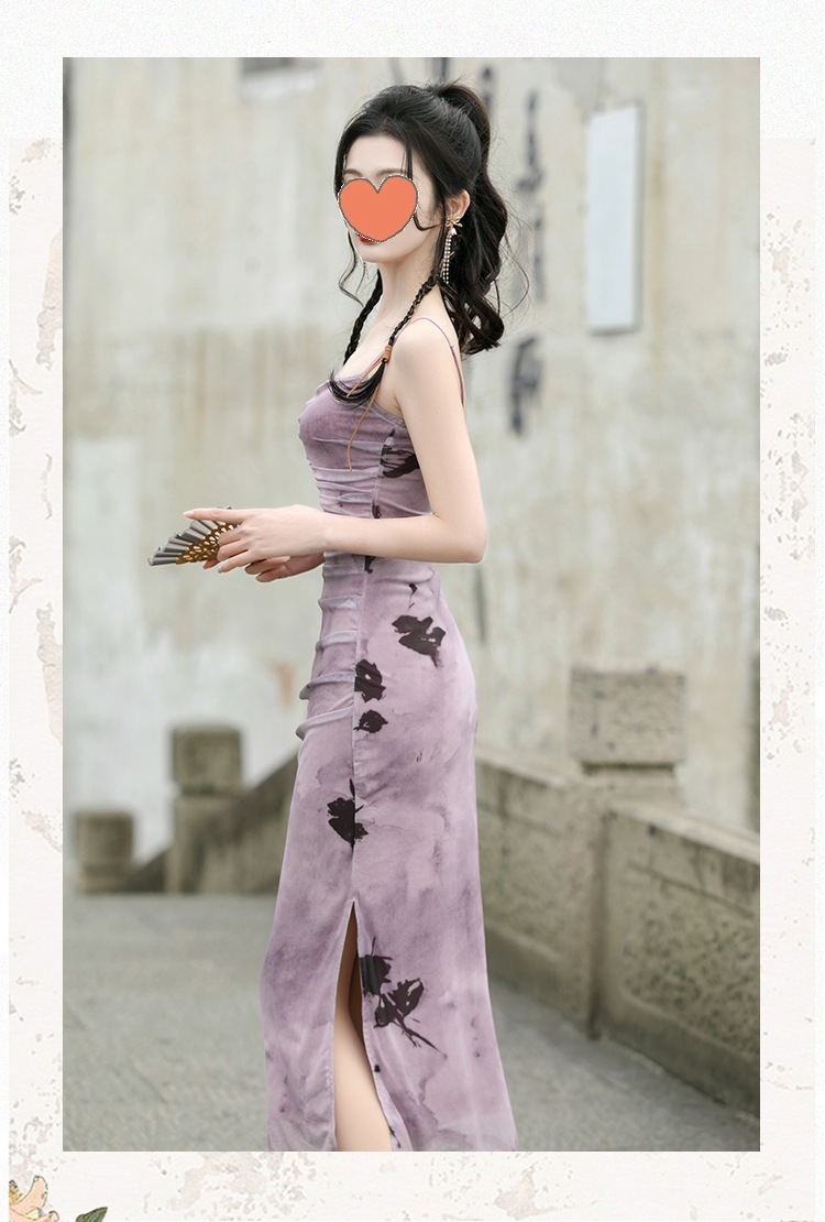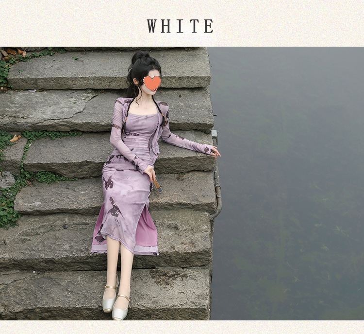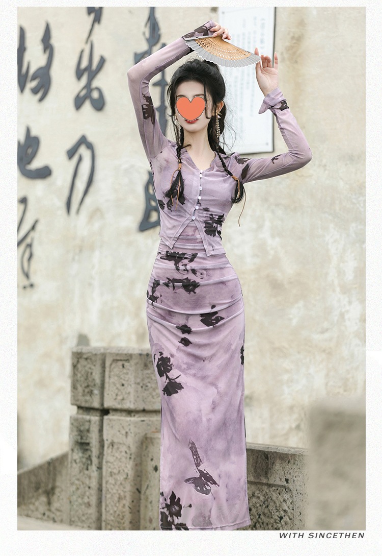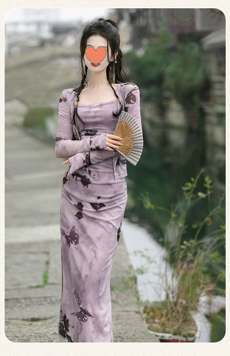 새로운 중국 스타일 프랑스 스타일 레트로 퍼플 잉크 슬립 스커트 투피스 세트 여성의 이른 가을 하이 엔드 기질 리틀 엄마 원피스