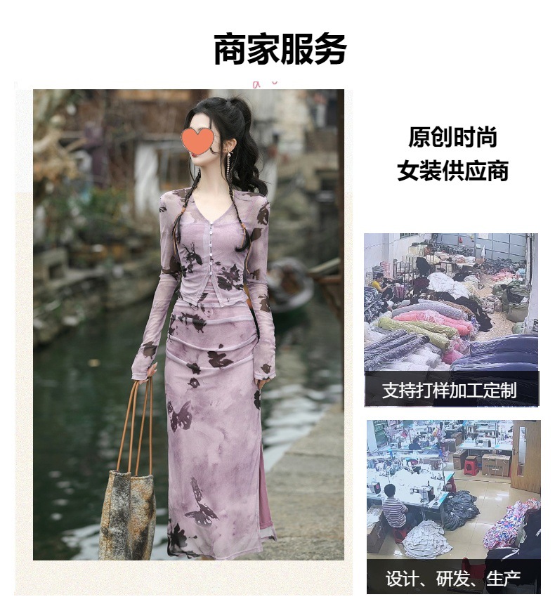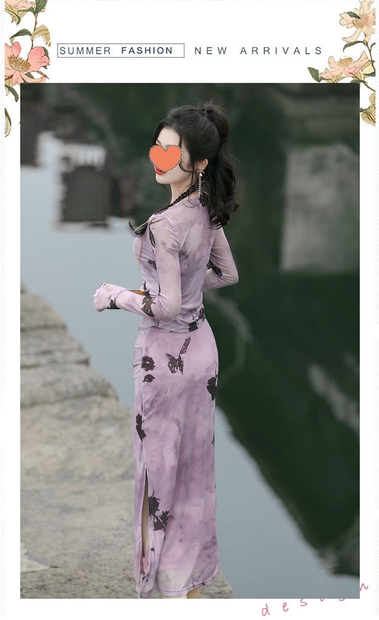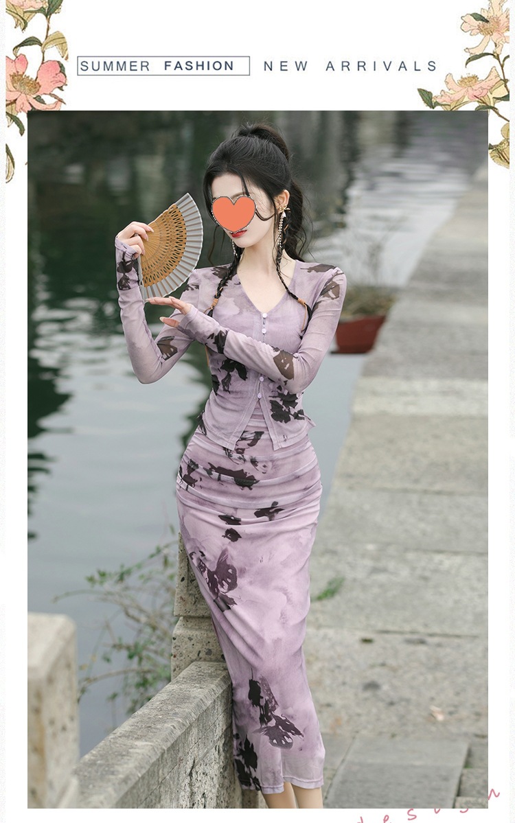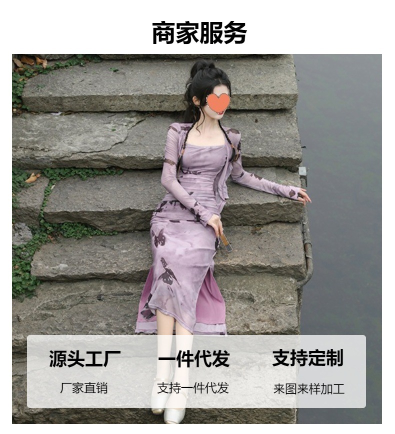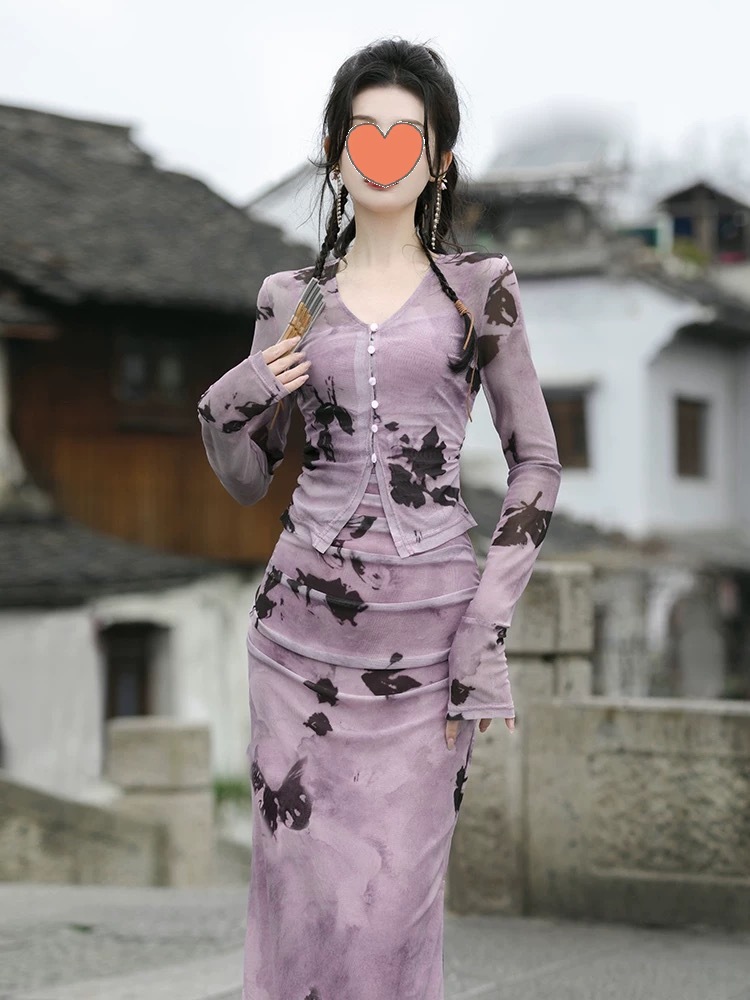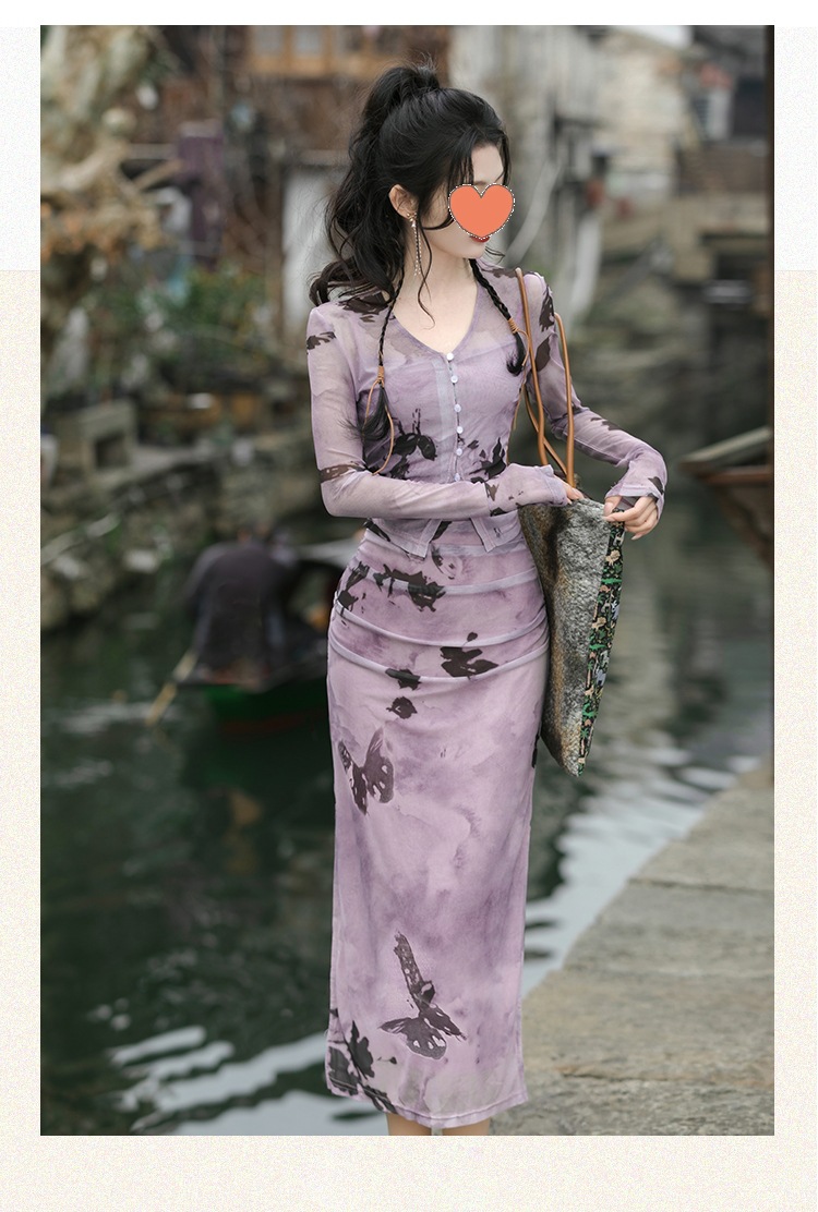 새로운 중국 스타일 프랑스 스타일 레트로 퍼플 잉크 슬립 스커트 투피스 세트 여성의 이른 가을 하이 엔드 기질 리틀 엄마 원피스스토어 가기