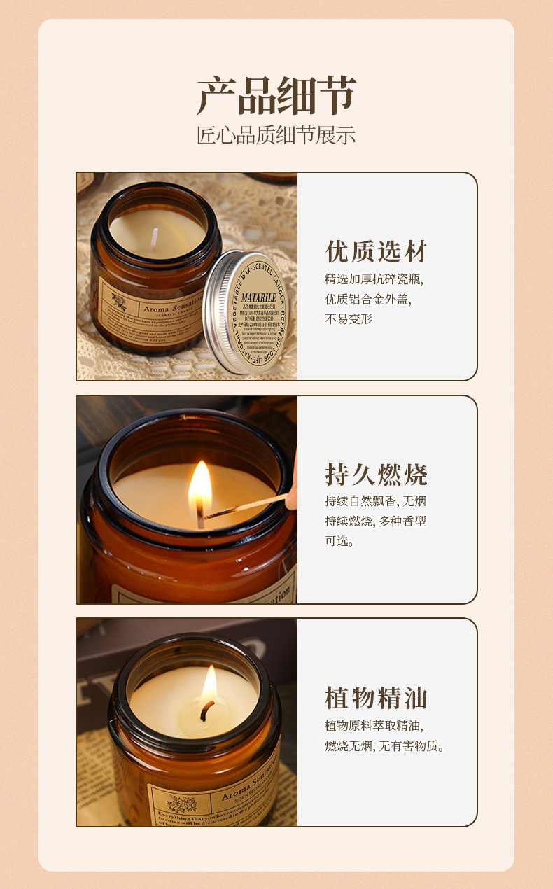 【产品材质】:成分植物混合蜡大豆蜡、精油香薰、材质玻璃