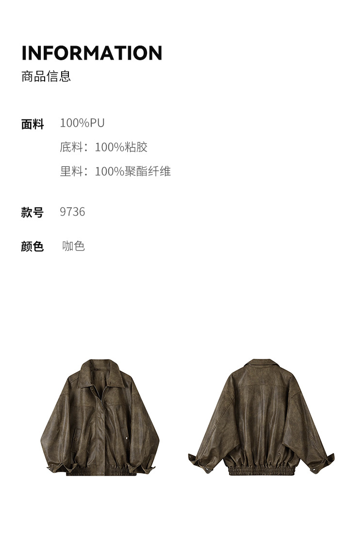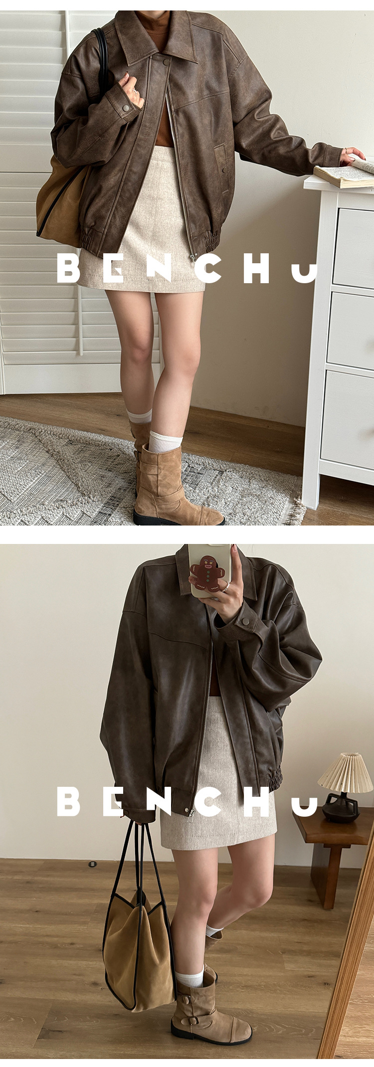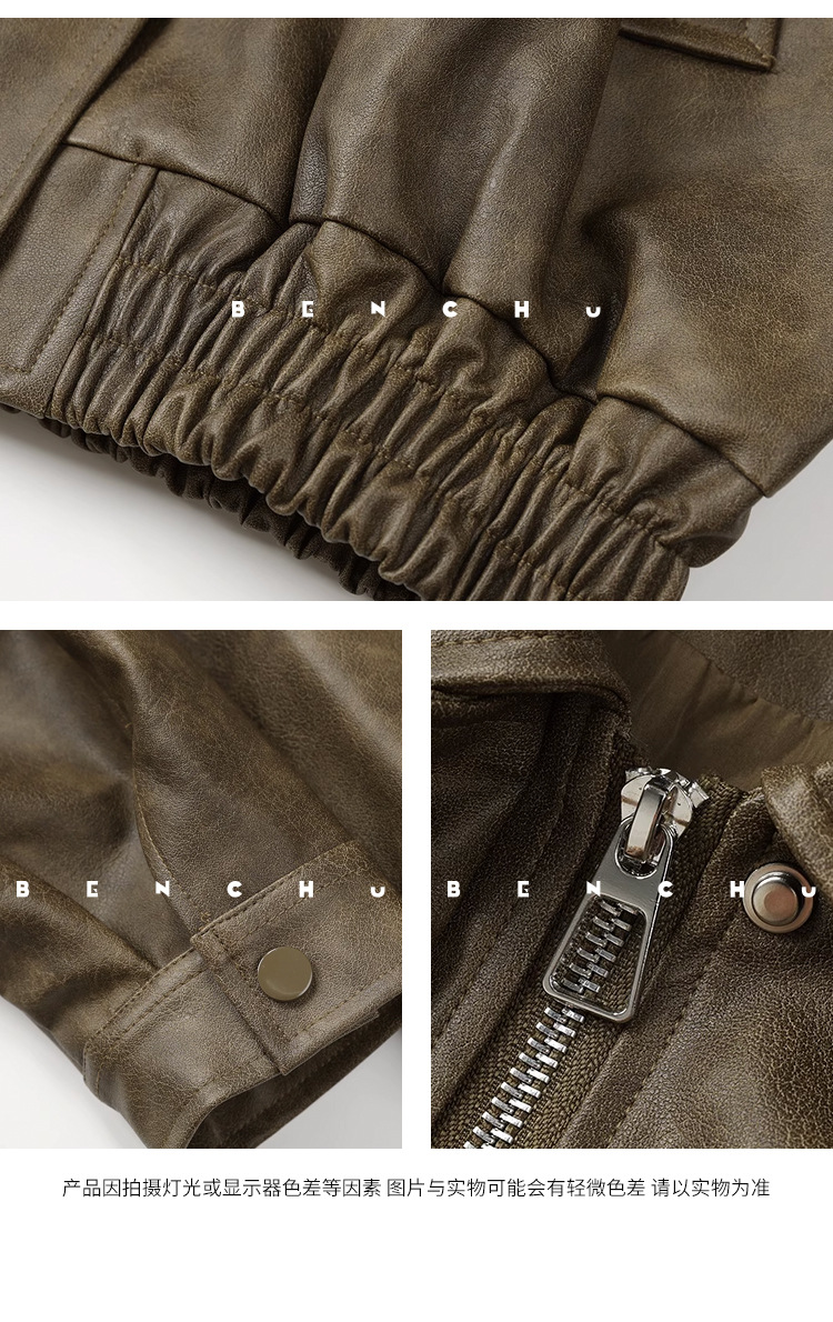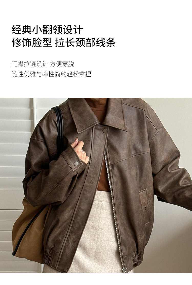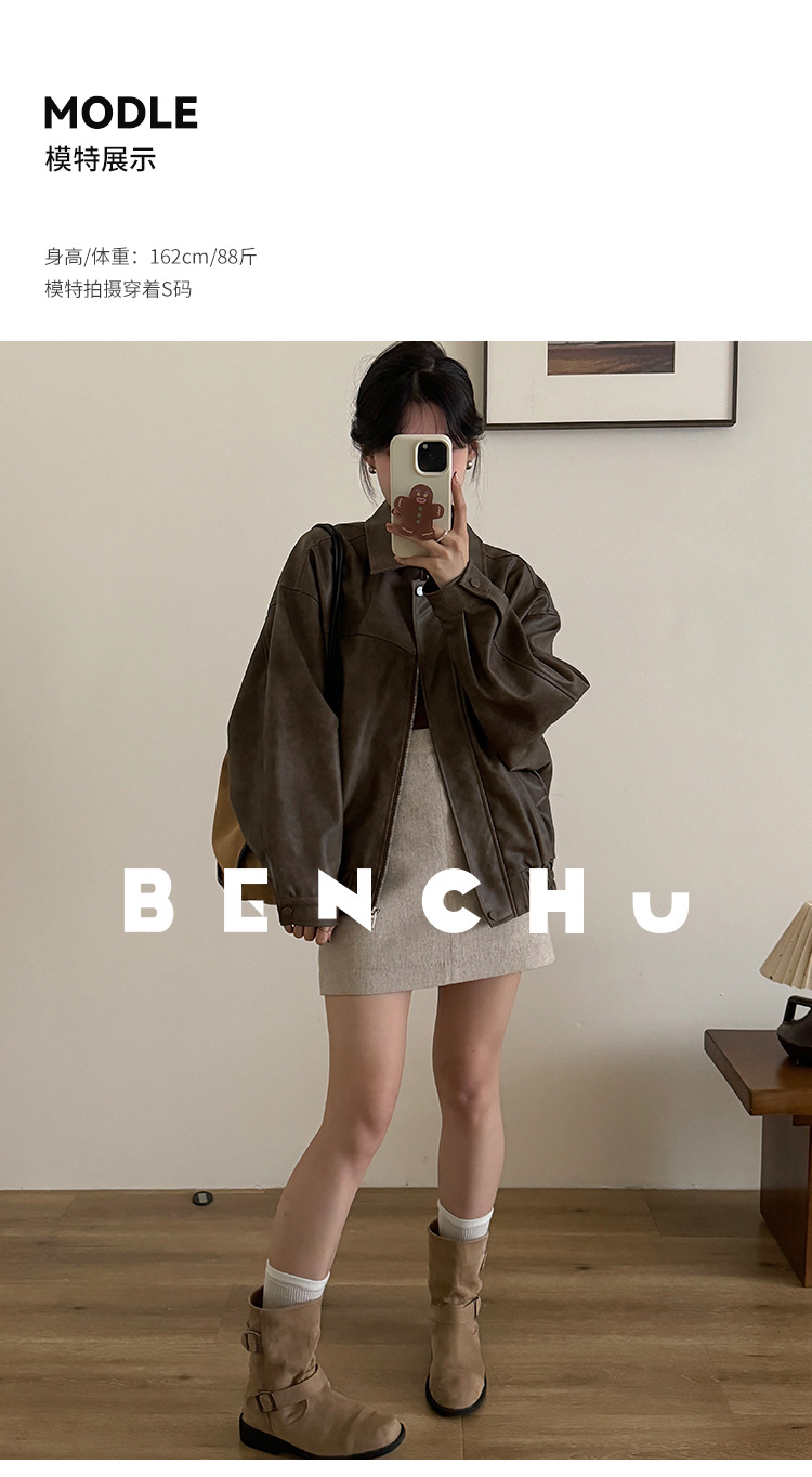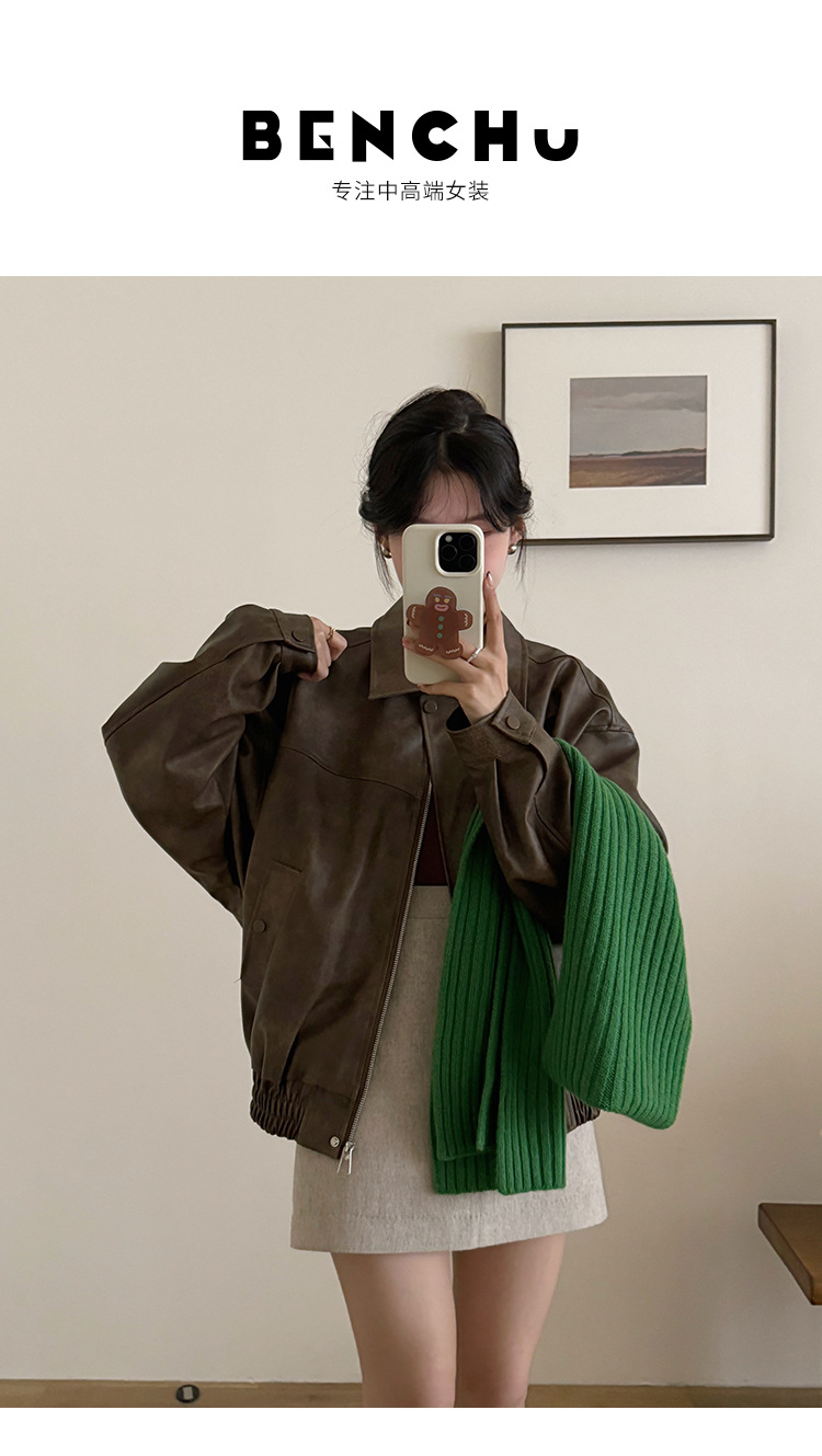 [벤 추] 2024 가을 새 미국 다크 브라운 드레스 재킷 가죽 여성 느슨한 지퍼 캐주얼 짧은 자켓스토어 가기