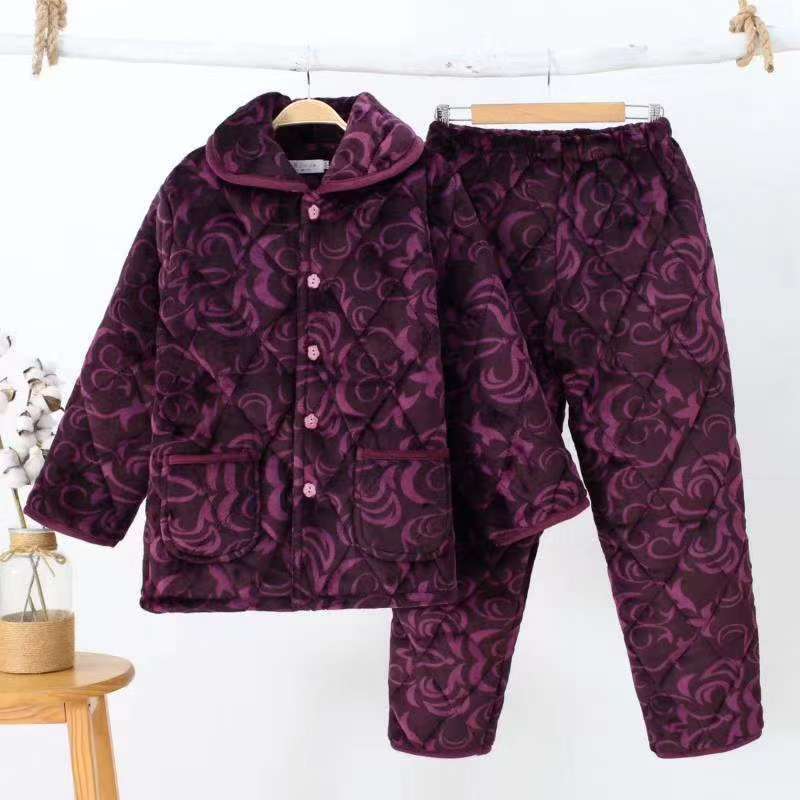 겨울 중년 및 노인 여성 플란넬 파자마 세트 패딩 패딩 따뜻한 산호 양털 홈 의류 공장 도매스토어 가기
