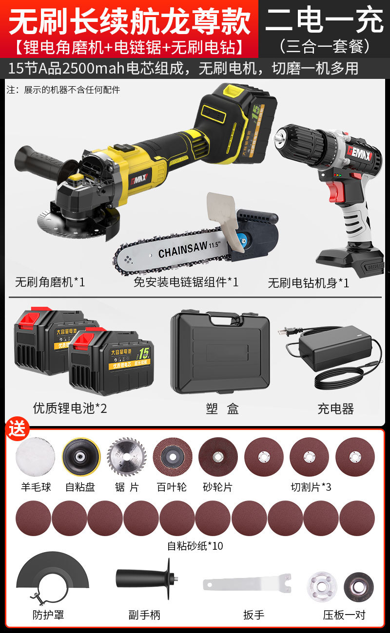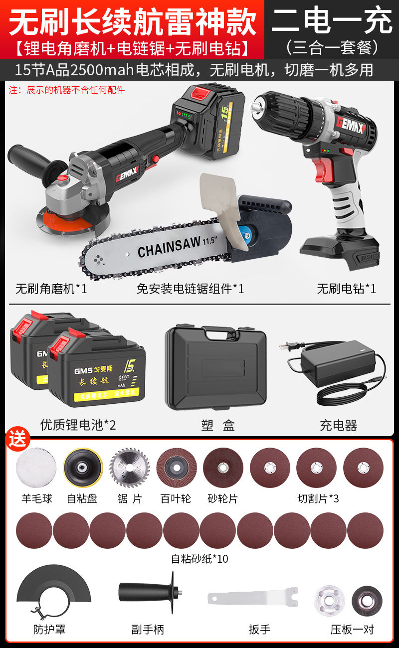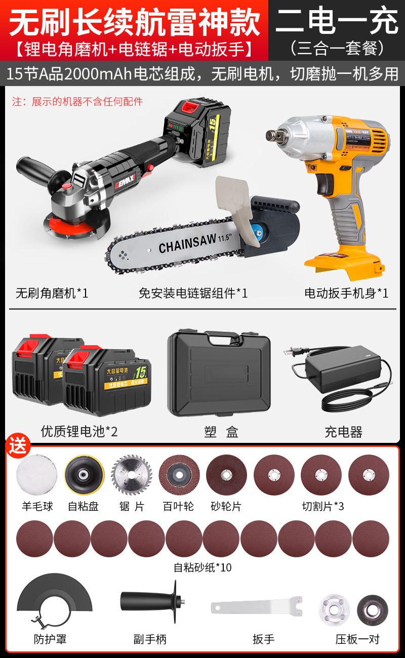 • 498VF 브러시리스 장수명 토르 모델 [15코어]758000H|보조 배터리] + 전원 공급 체인 톱 + 절단 및 연삭 세트