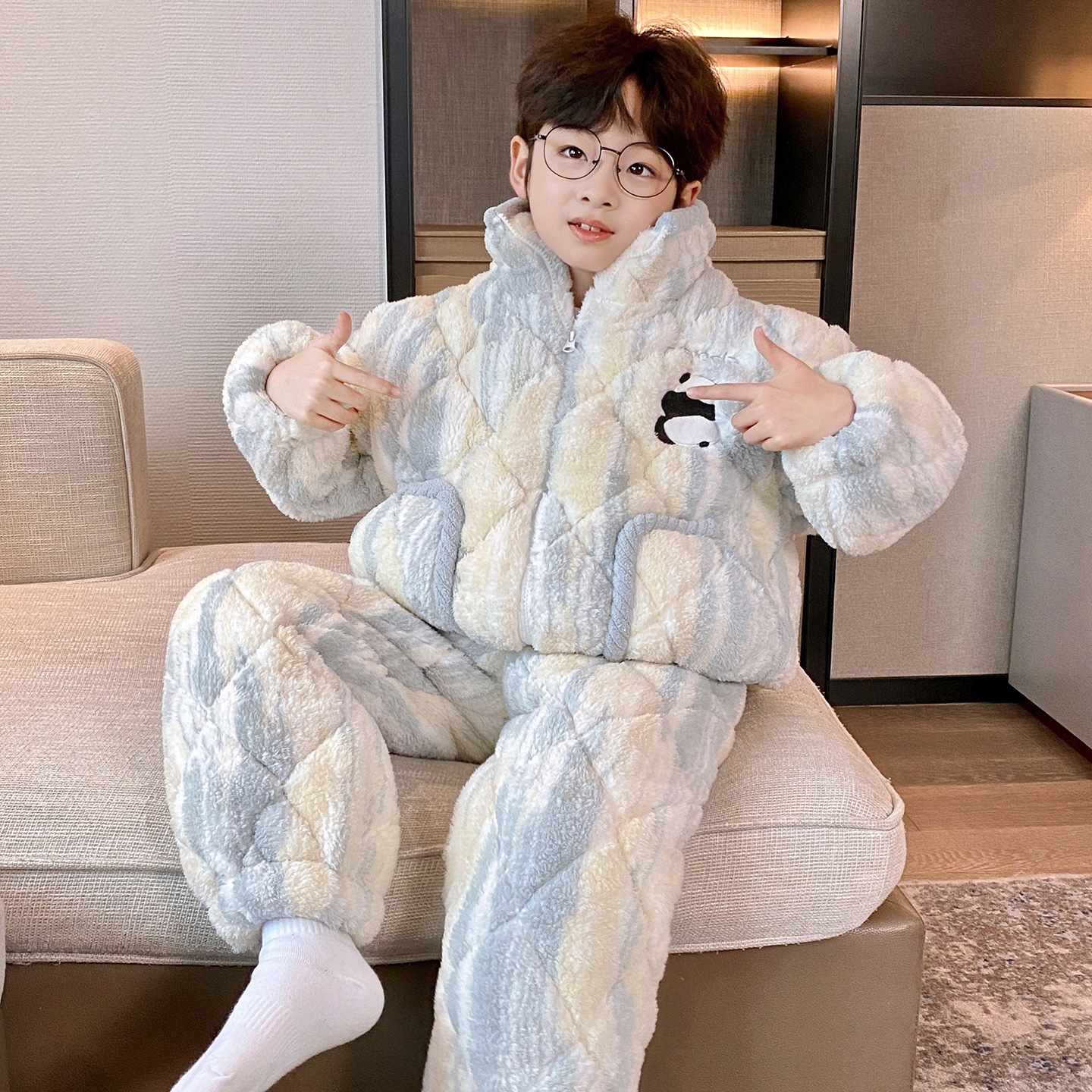 남아용 겨울 잠옷, 3중 누빔, 두꺼운 어린이용 산호 벨벳, 청소년 및 중년 아동용 홈웨어, 2025년 신상품