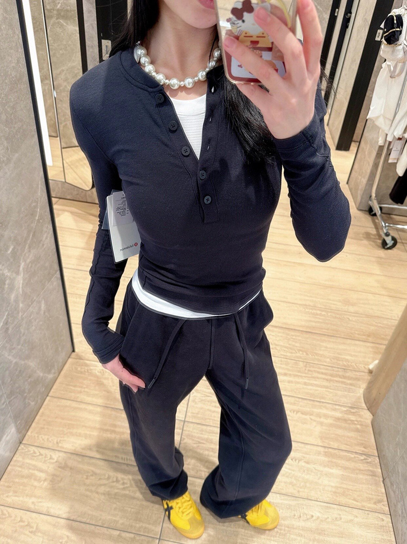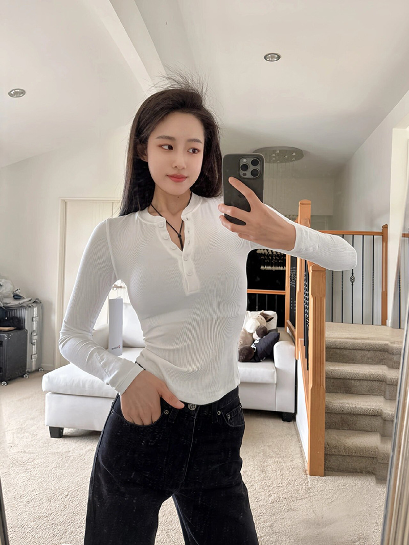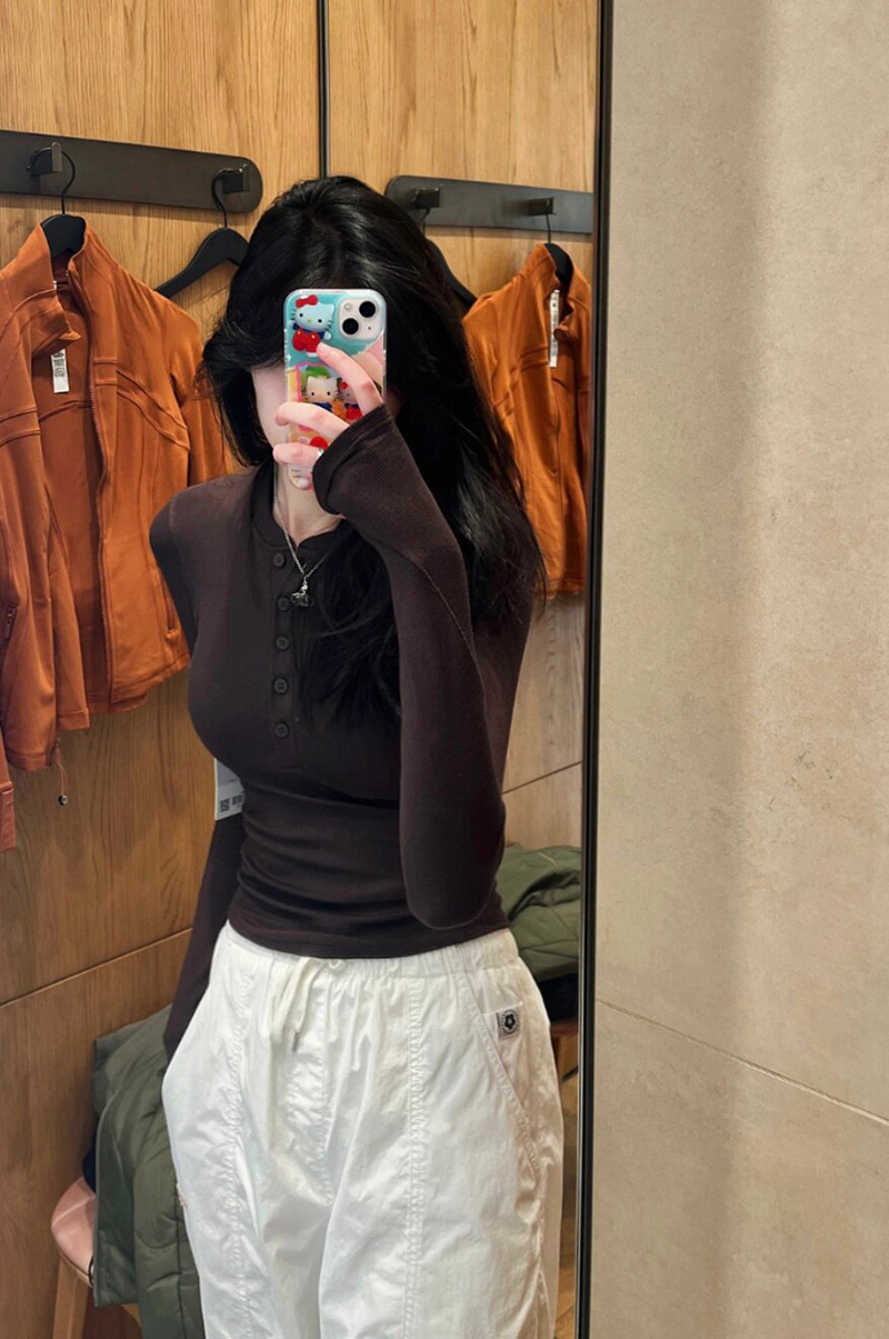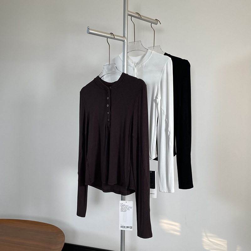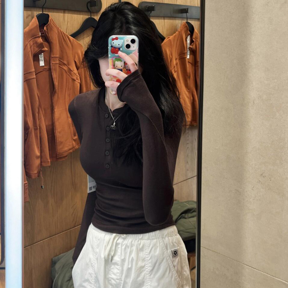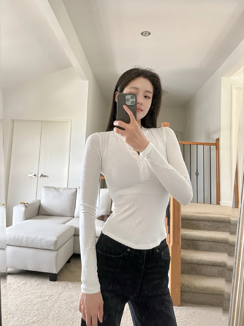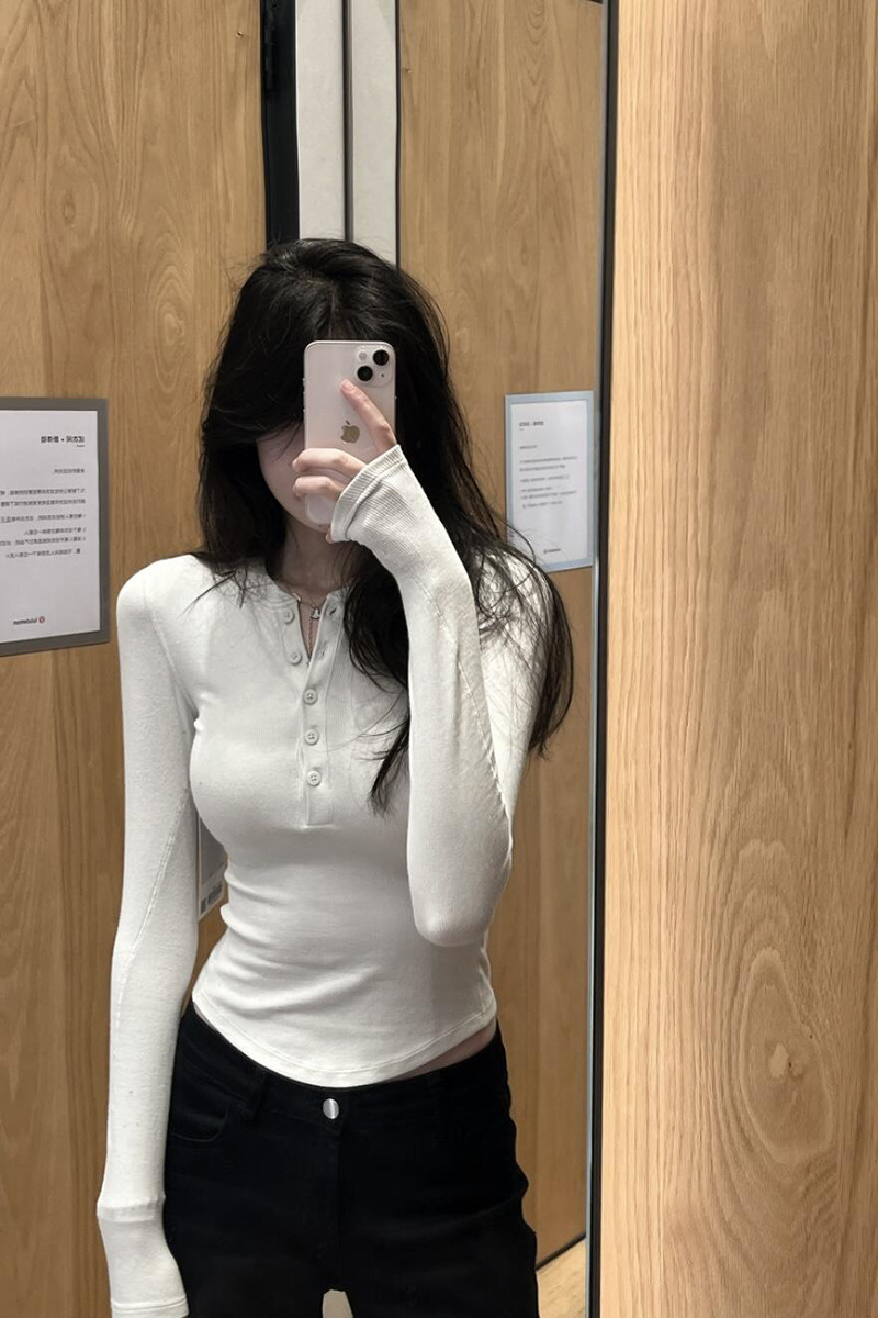 재고 있음! 홀드 타이트 동일 스타일 여성용 타이트 핏 긴팔 헨리넥 버튼 티셔츠 이너웨어 상의스토어 가기