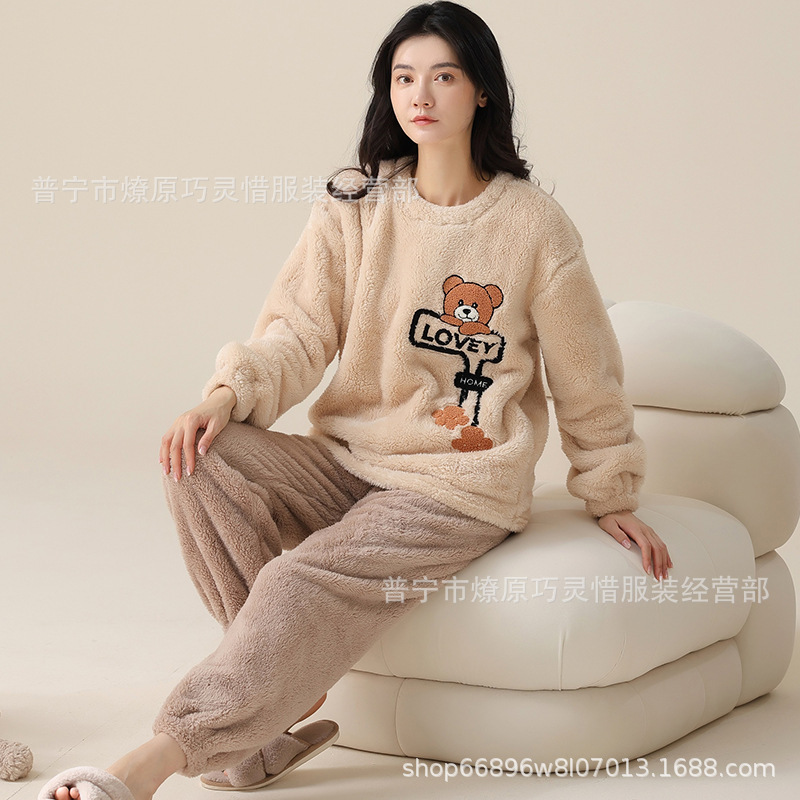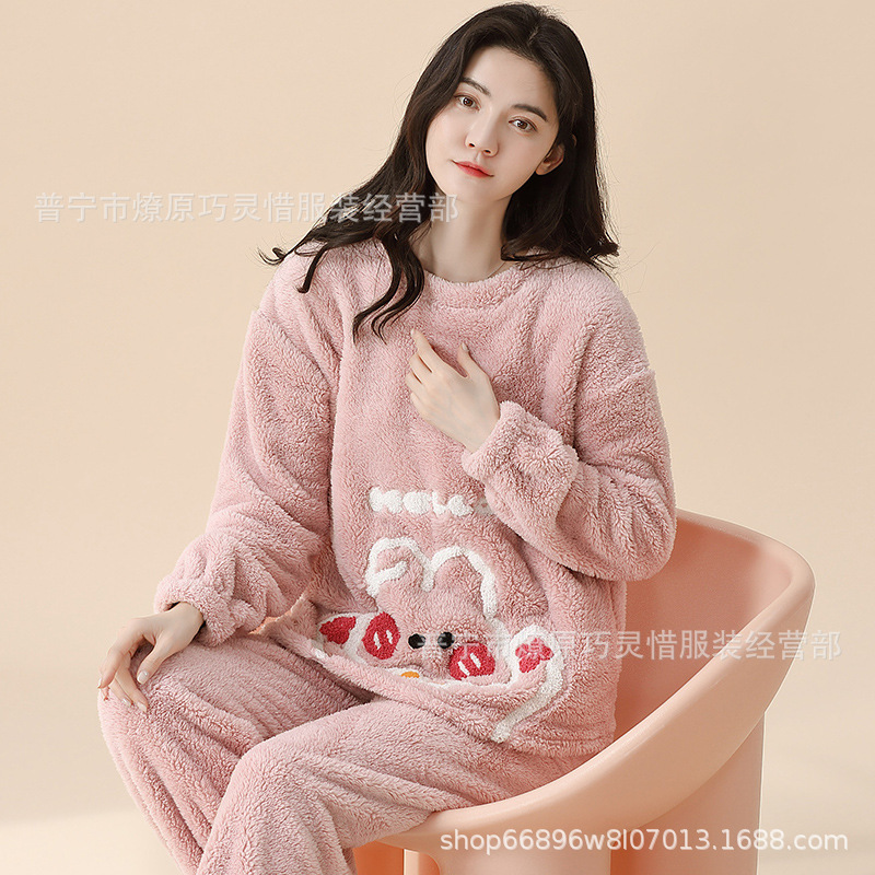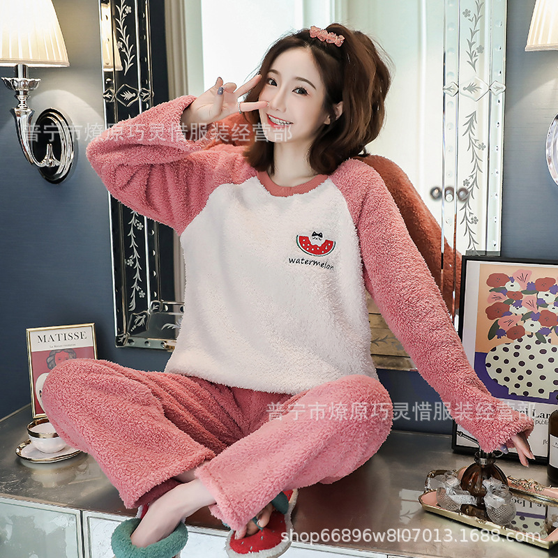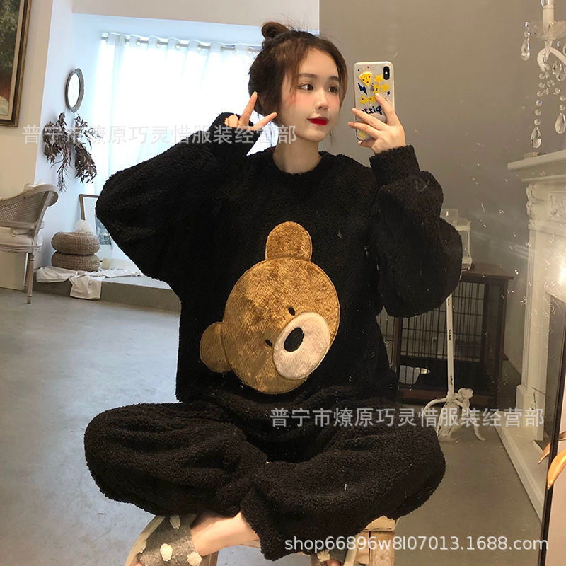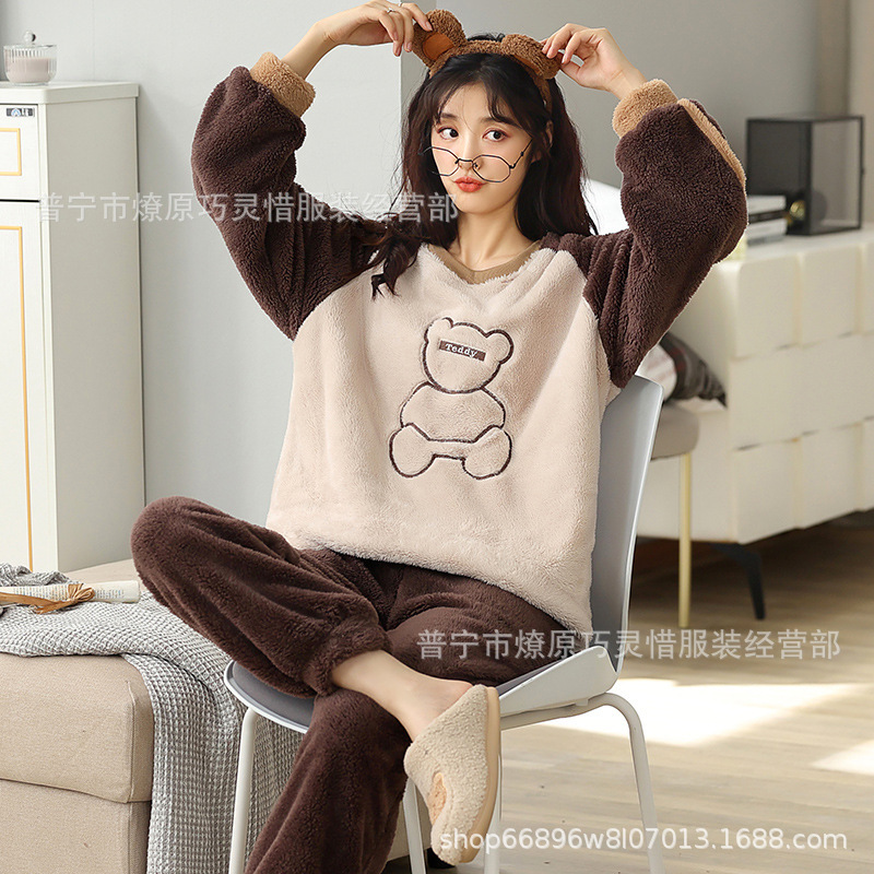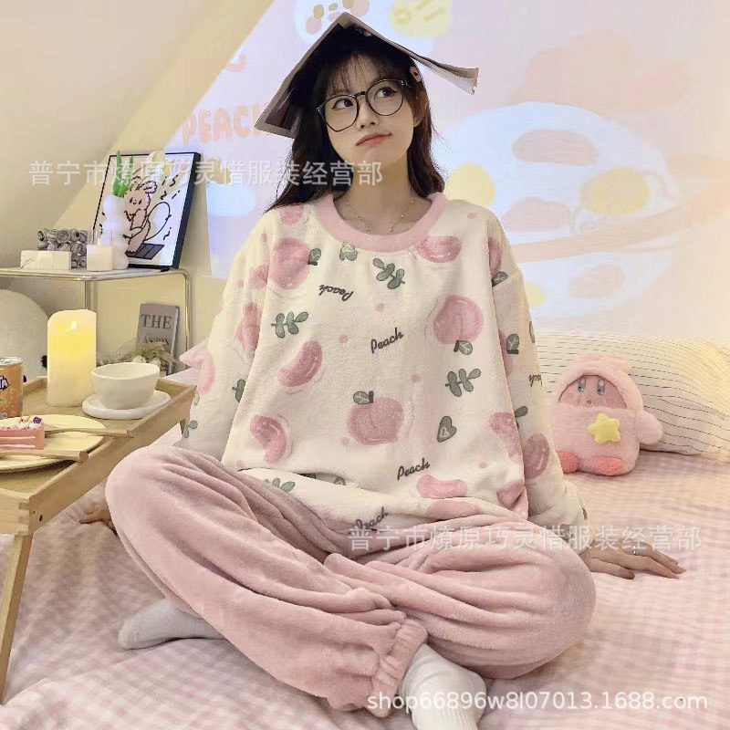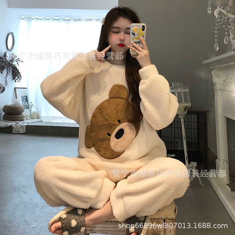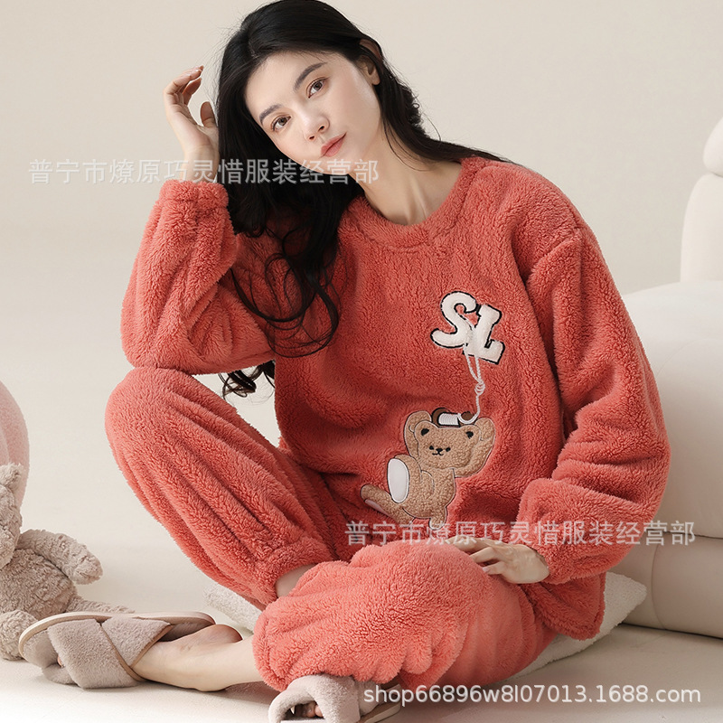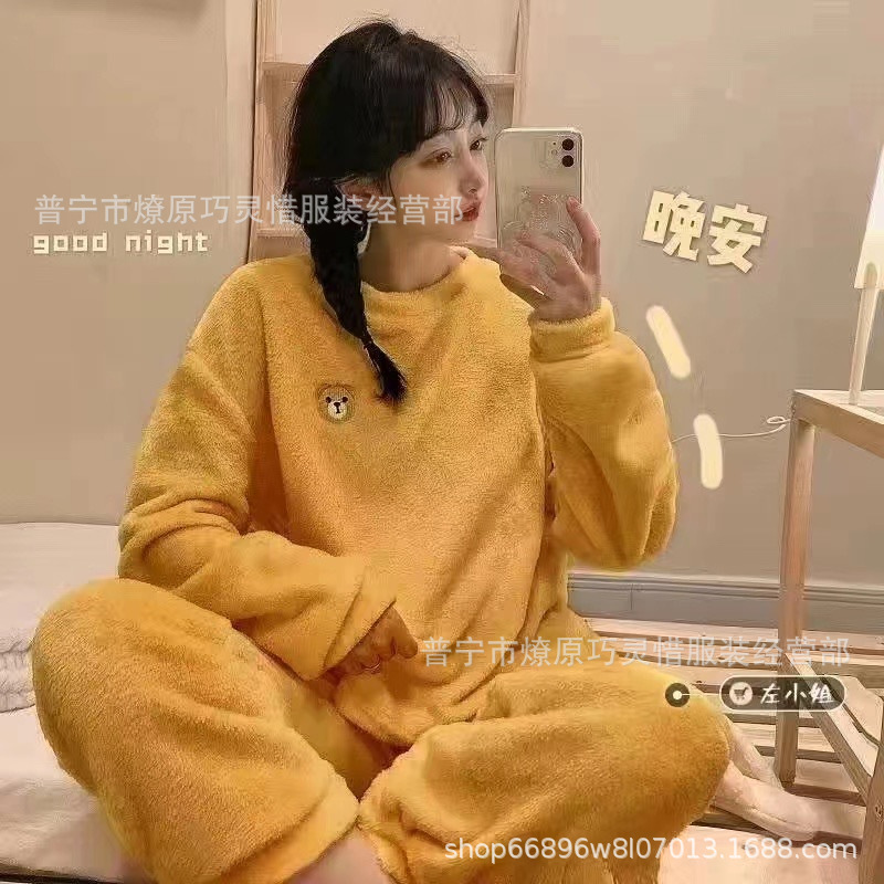 산호 벨벳 파자마 여성의 겨울 기모 두꺼운 따뜻한 플란넬 사이버 연예인 Ins 스타일 2024 새 홈 의류스토어 가기