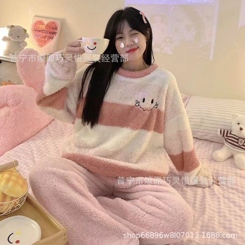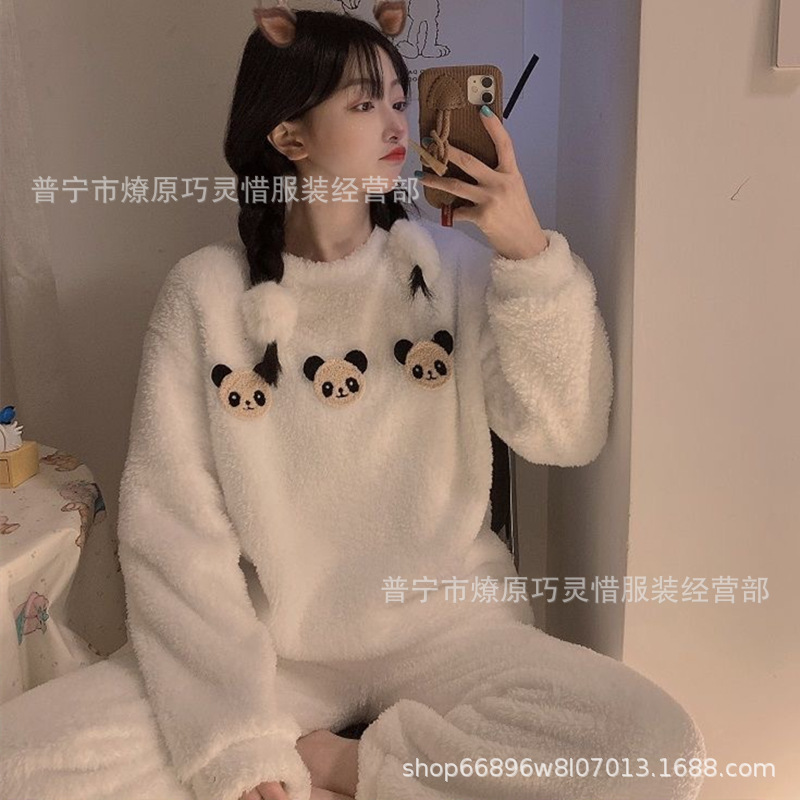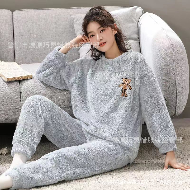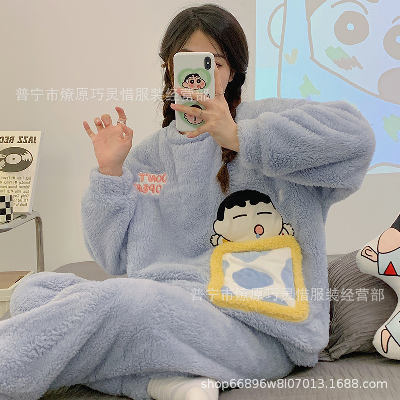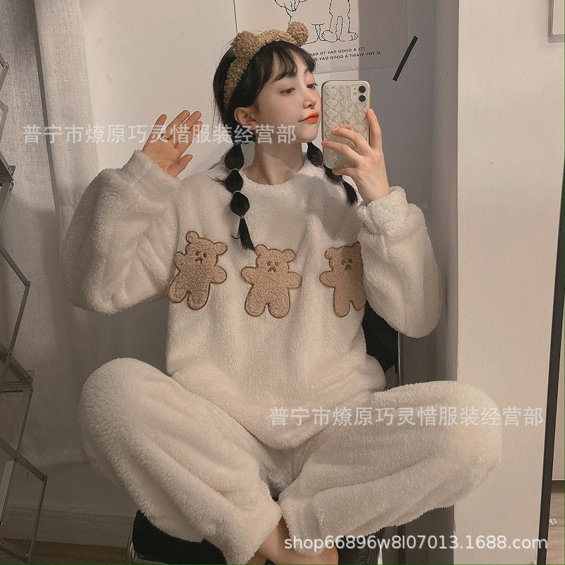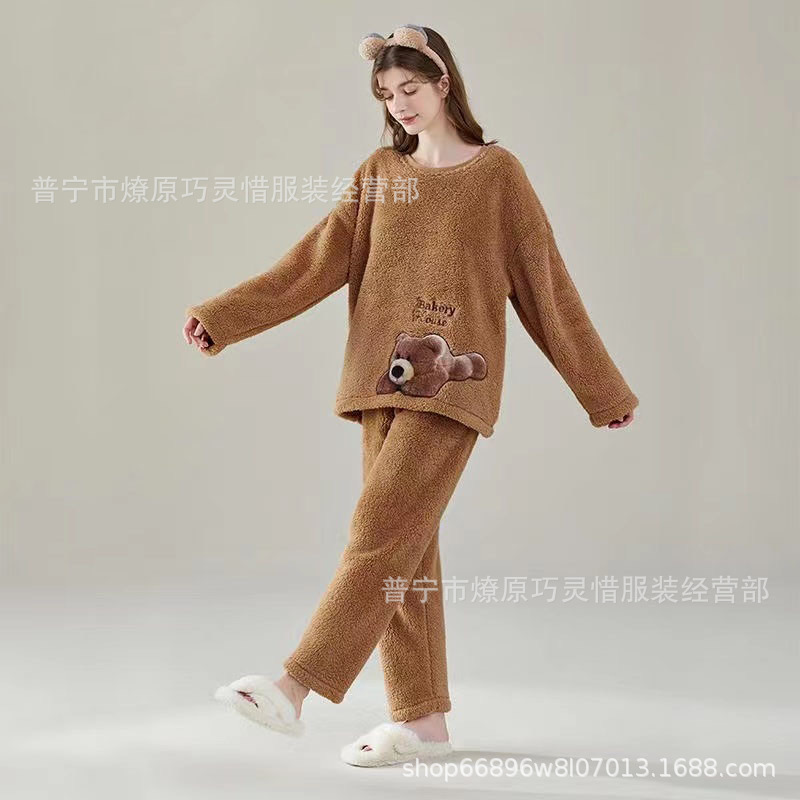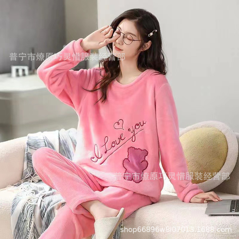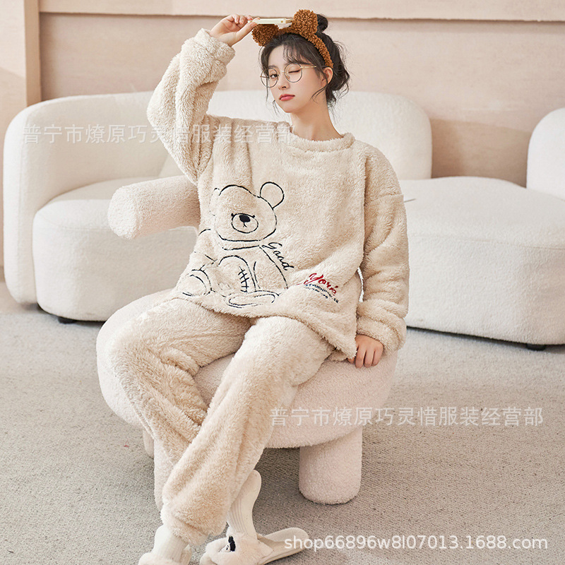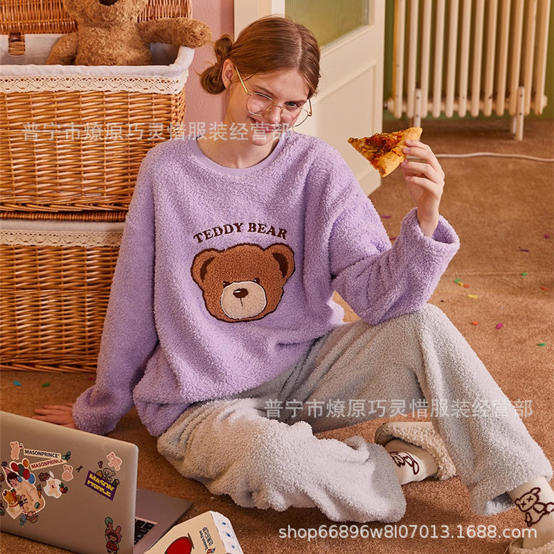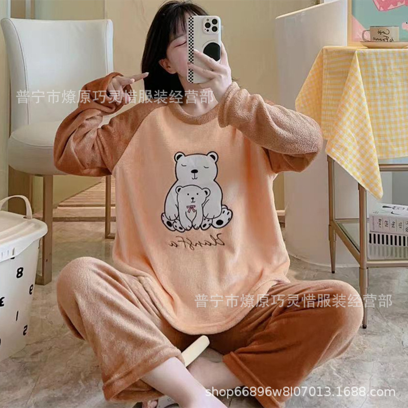 산호 벨벳 파자마 여성의 겨울 기모 두꺼운 따뜻한 플란넬 사이버 연예인 Ins 스타일 2024 새 홈 의류스토어 가기