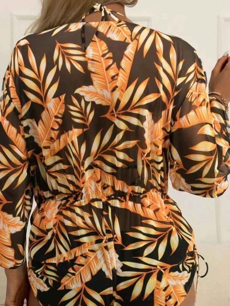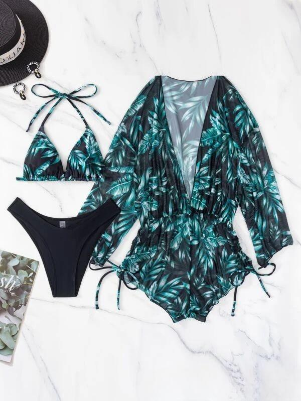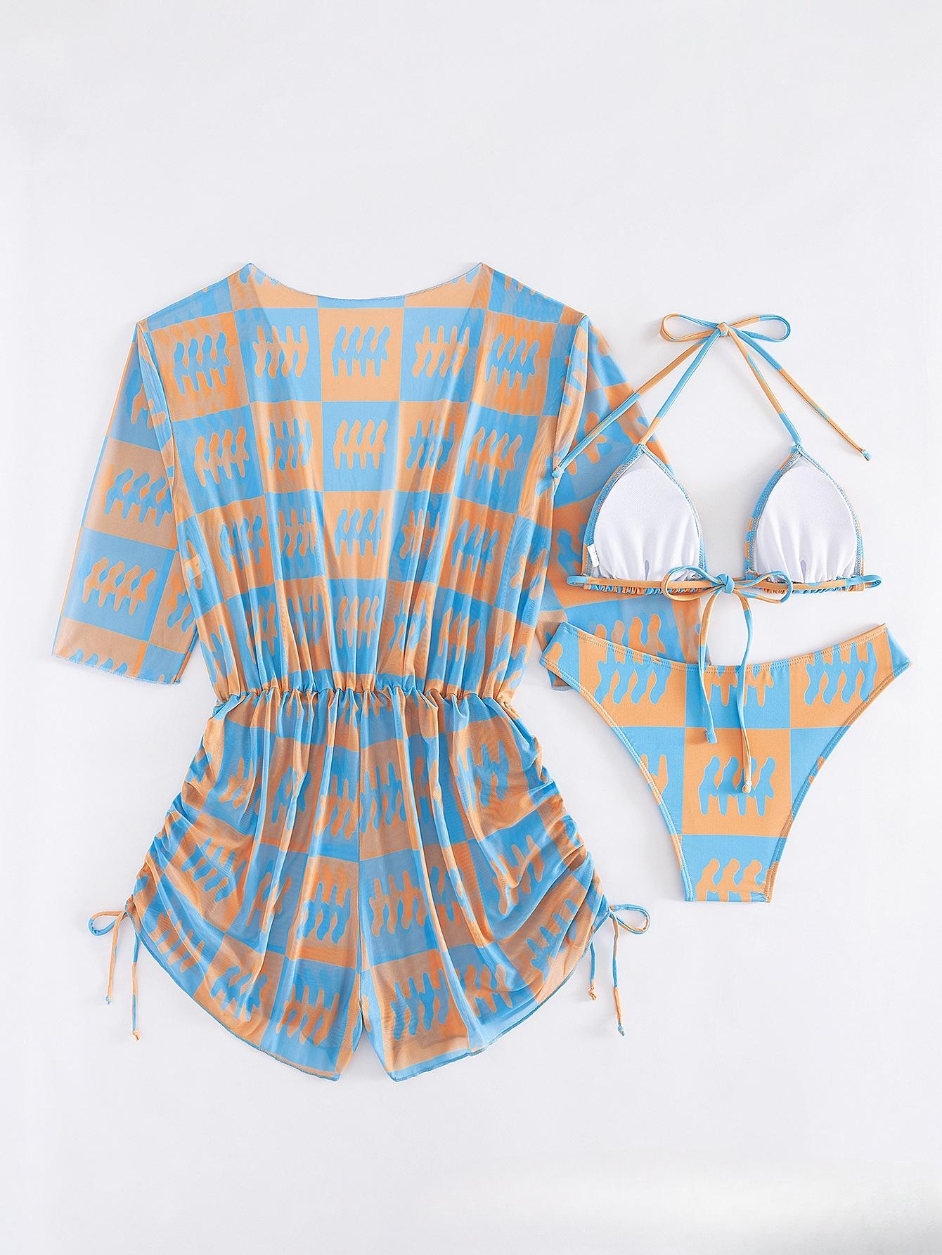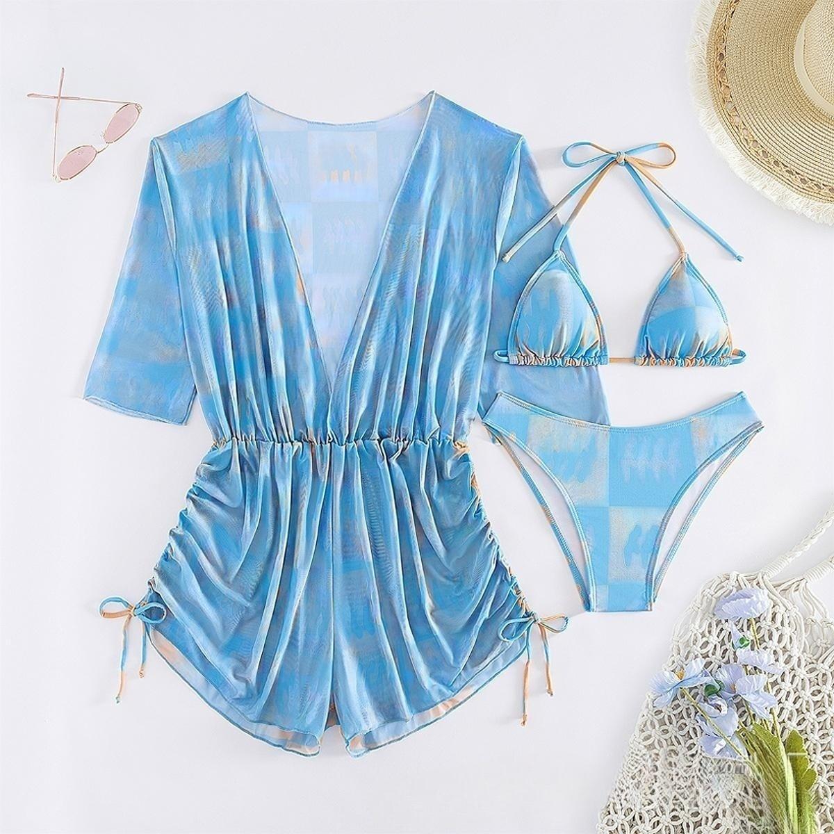 2024 새로운 대외 무역 국경 긴 소매 3 피스 메쉬 허리 드로 스트링 인쇄 분할 비키니 수영복 재고스토어 가기