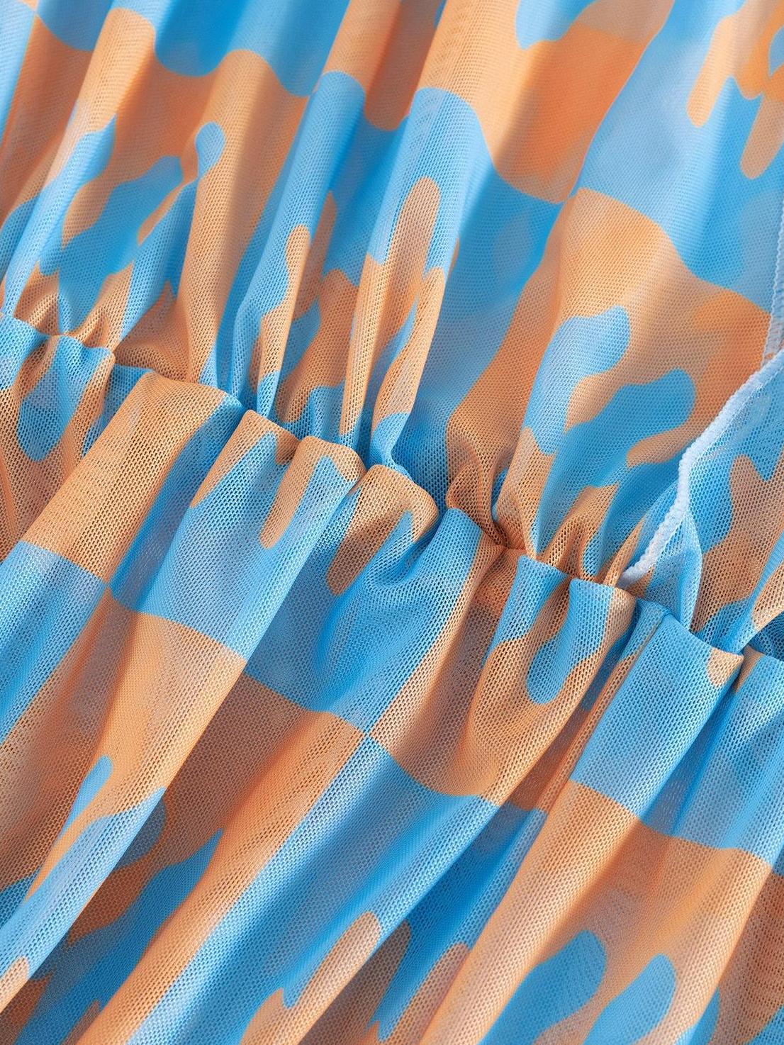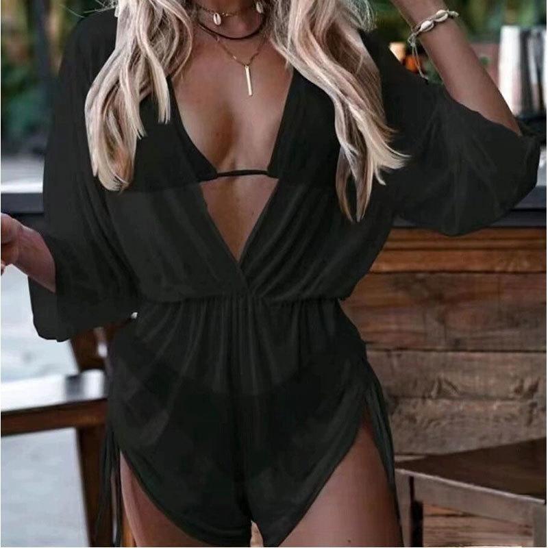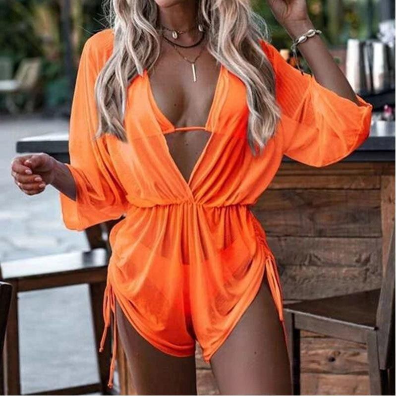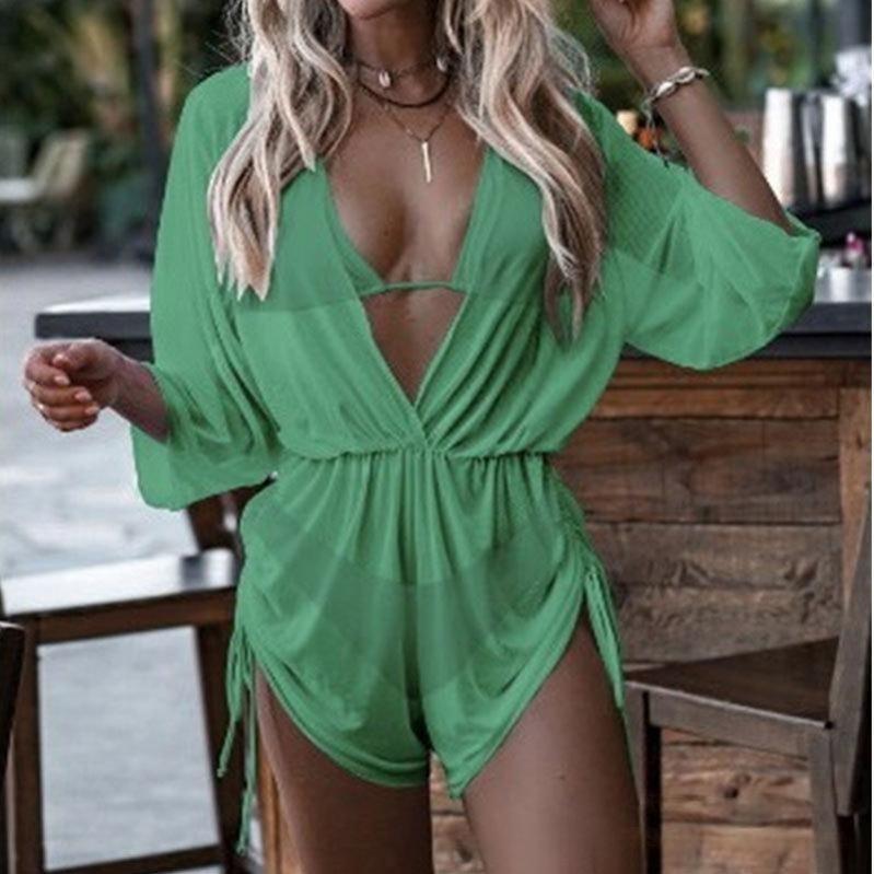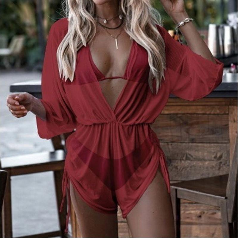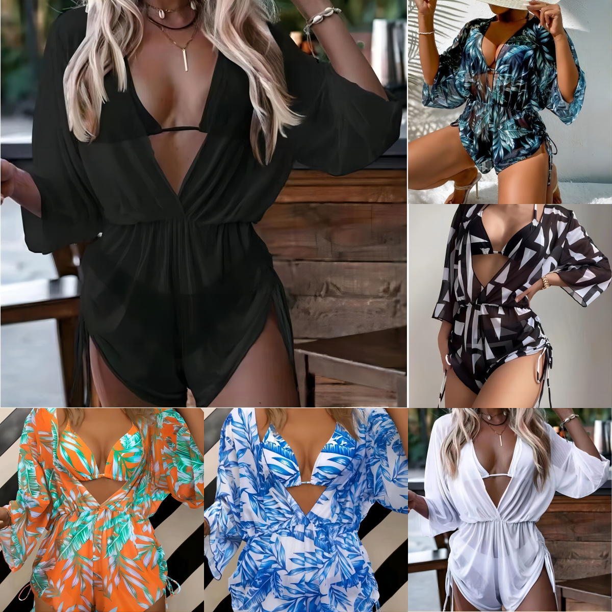 2024 새로운 대외 무역 국경 긴 소매 3 피스 메쉬 허리 드로 스트링 인쇄 분할 비키니 수영복 재고스토어 가기