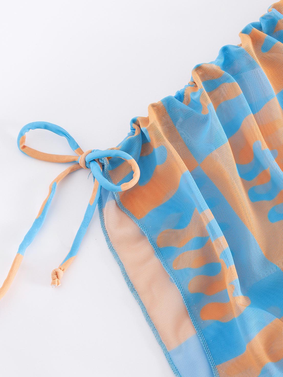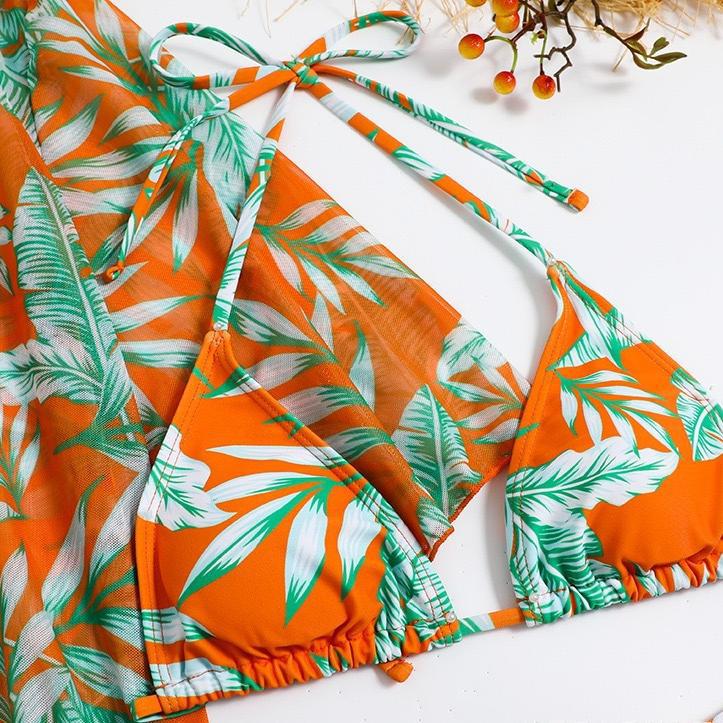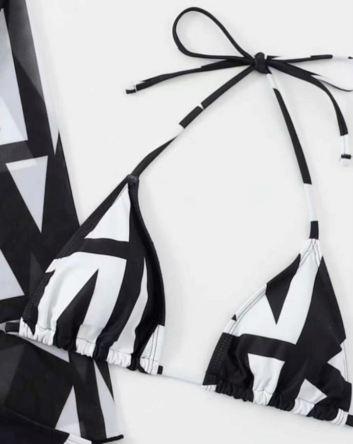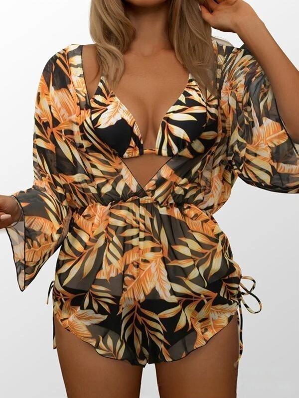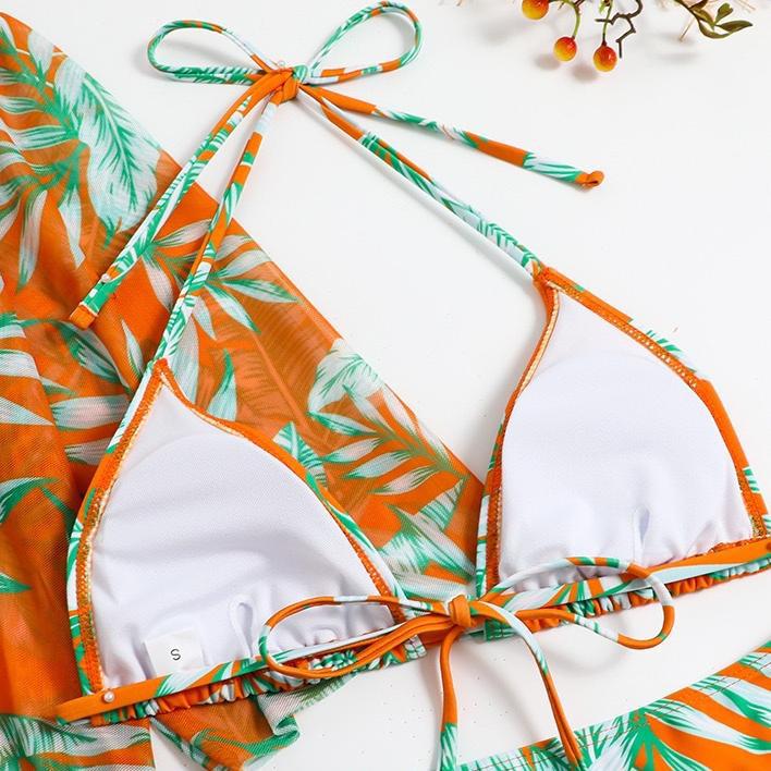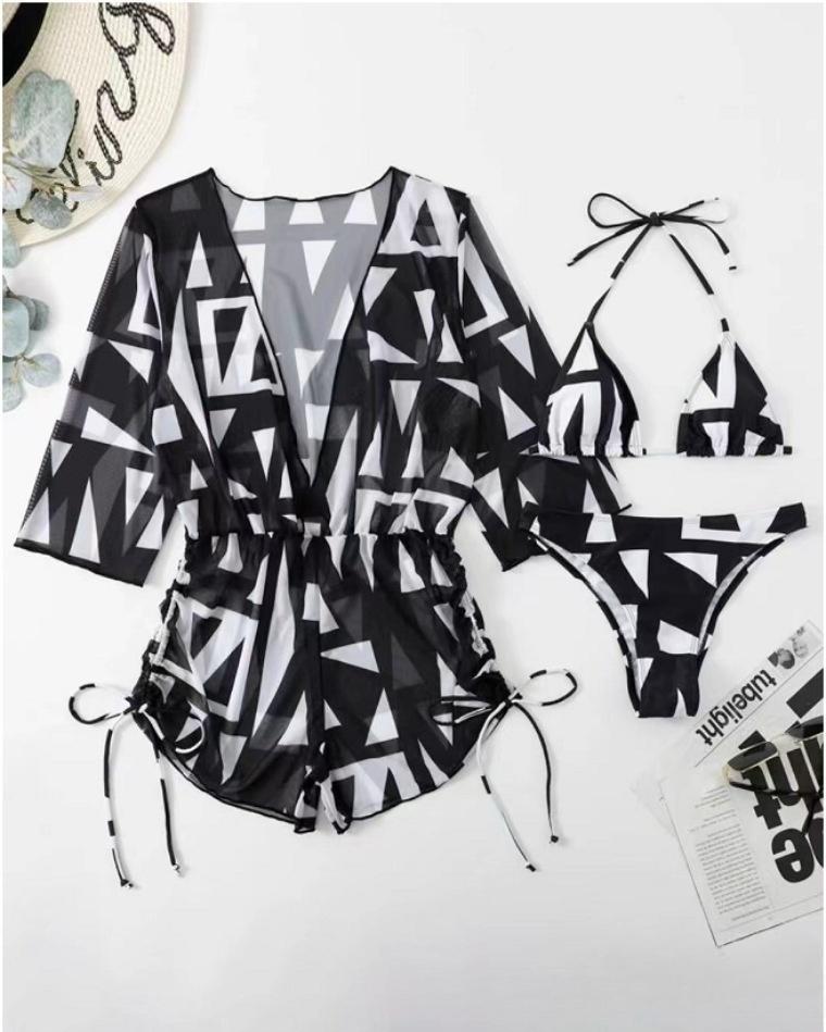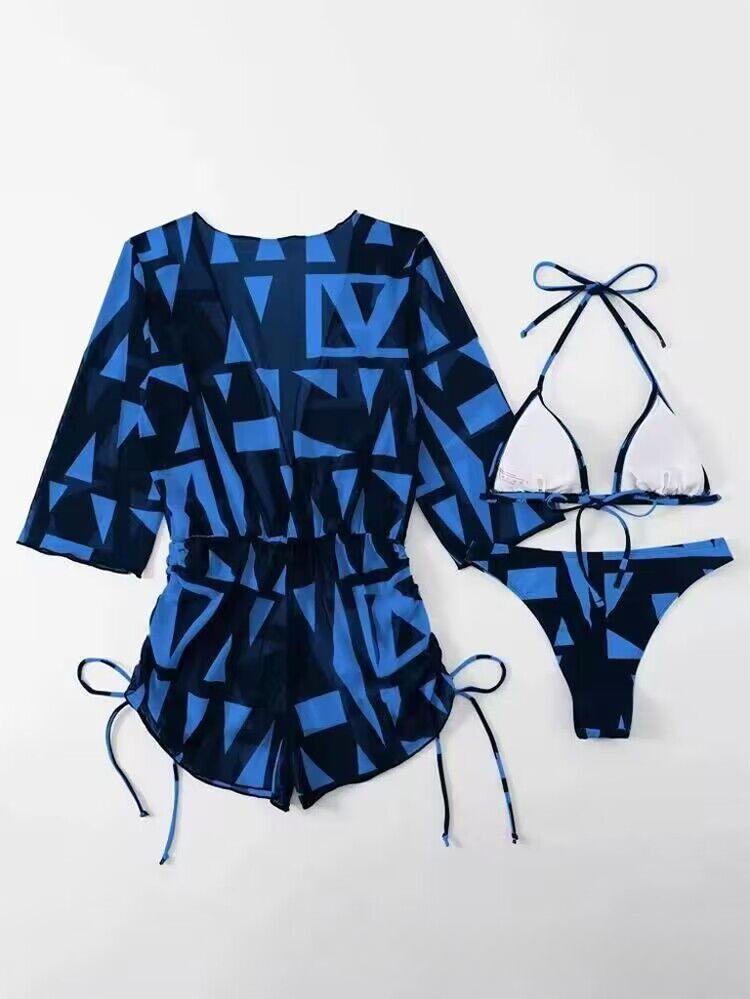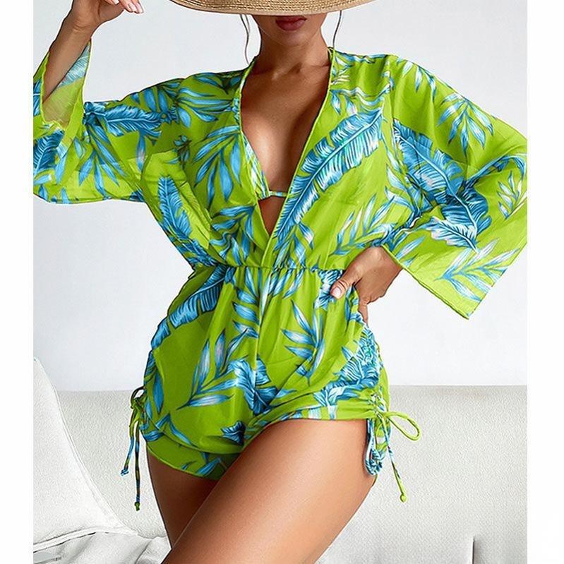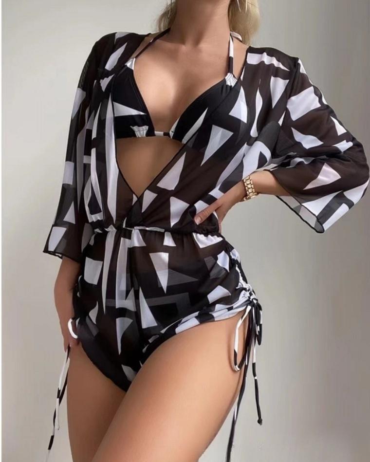 2024 새로운 대외 무역 국경 긴 소매 3 피스 메쉬 허리 드로 스트링 인쇄 분할 비키니 수영복 재고