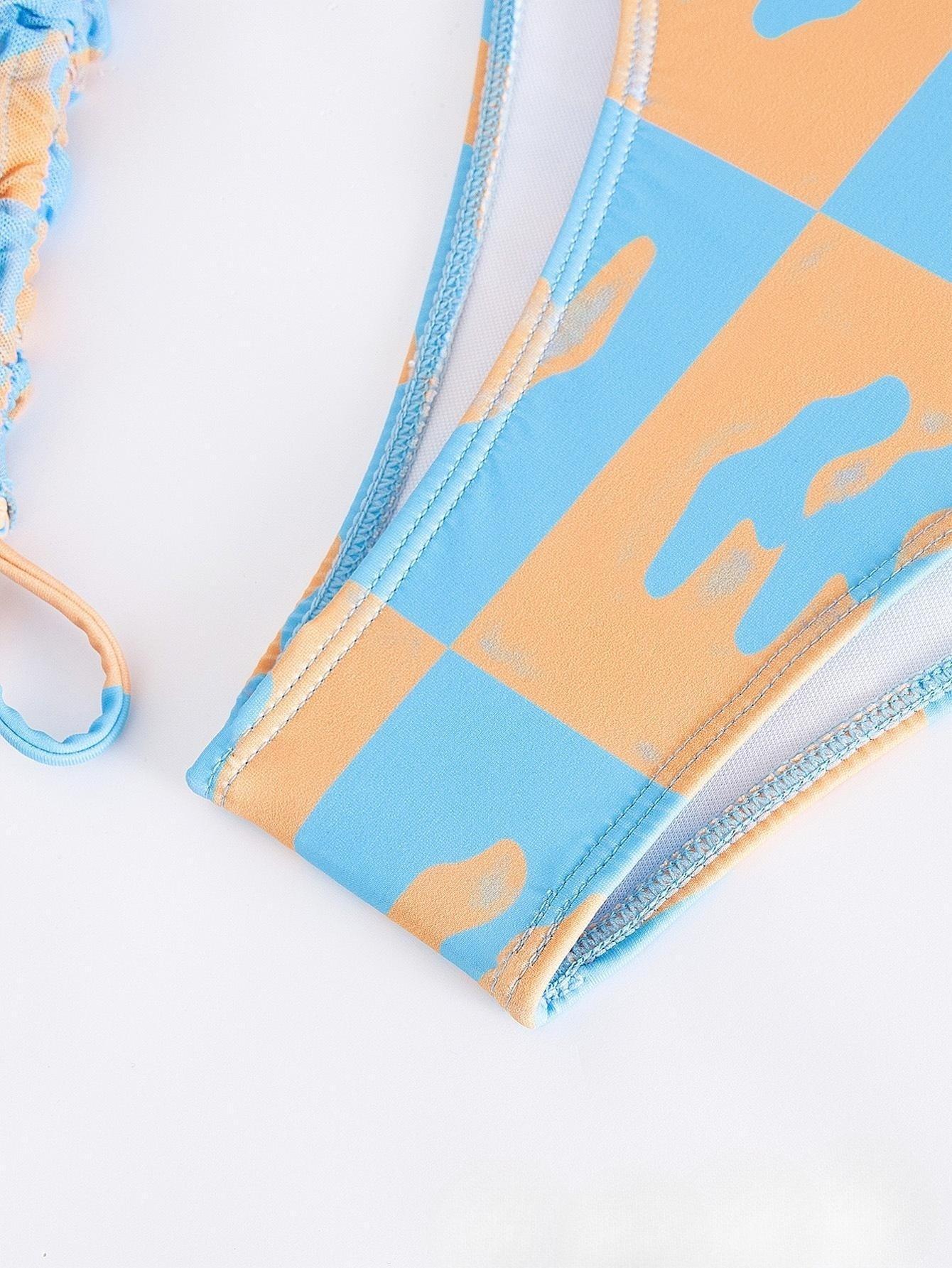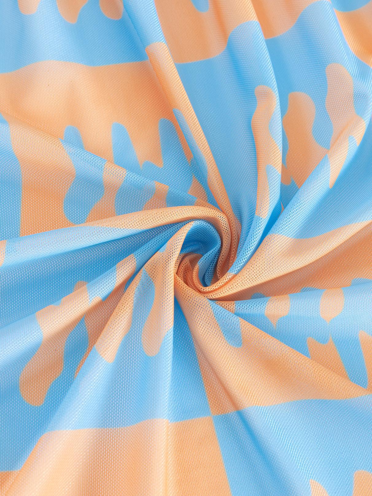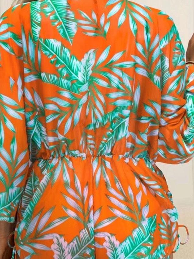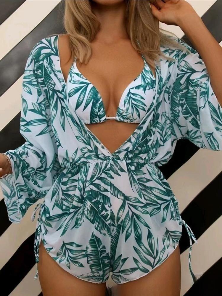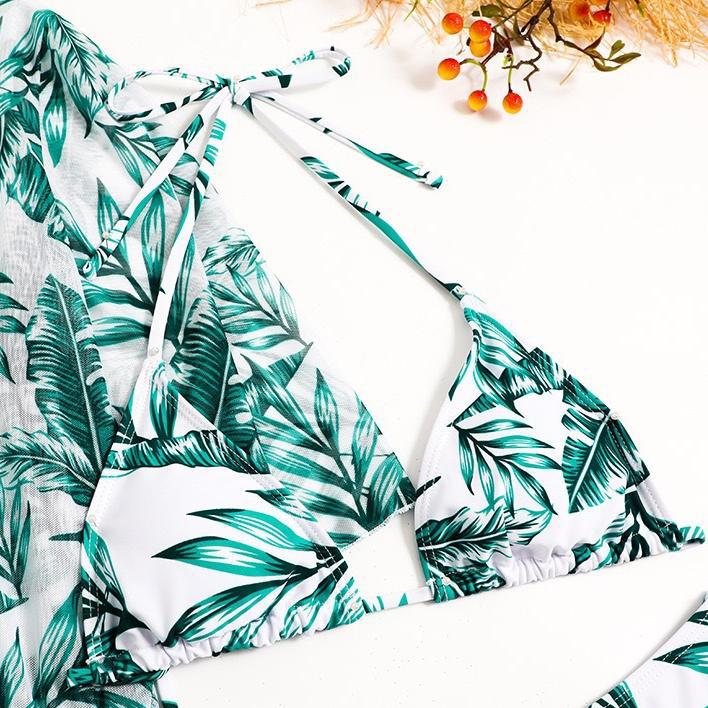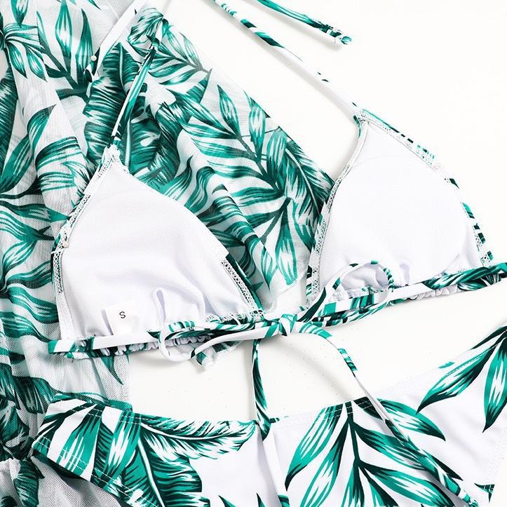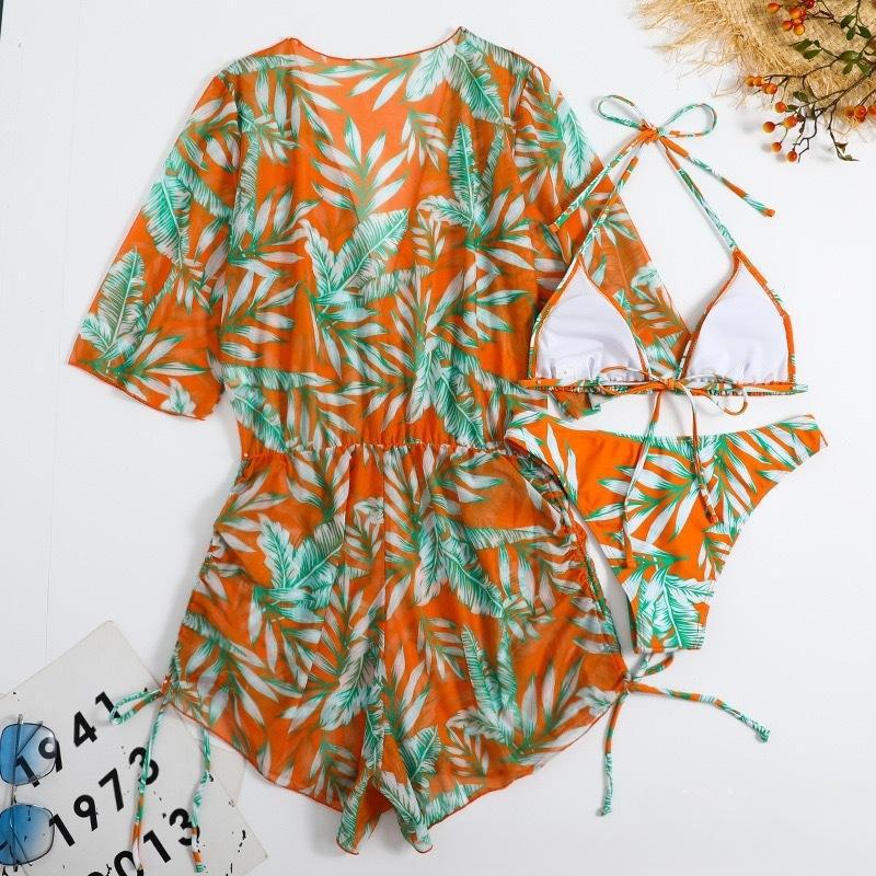 2024 새로운 대외 무역 국경 긴 소매 3 피스 메쉬 허리 드로 스트링 인쇄 분할 비키니 수영복 재고