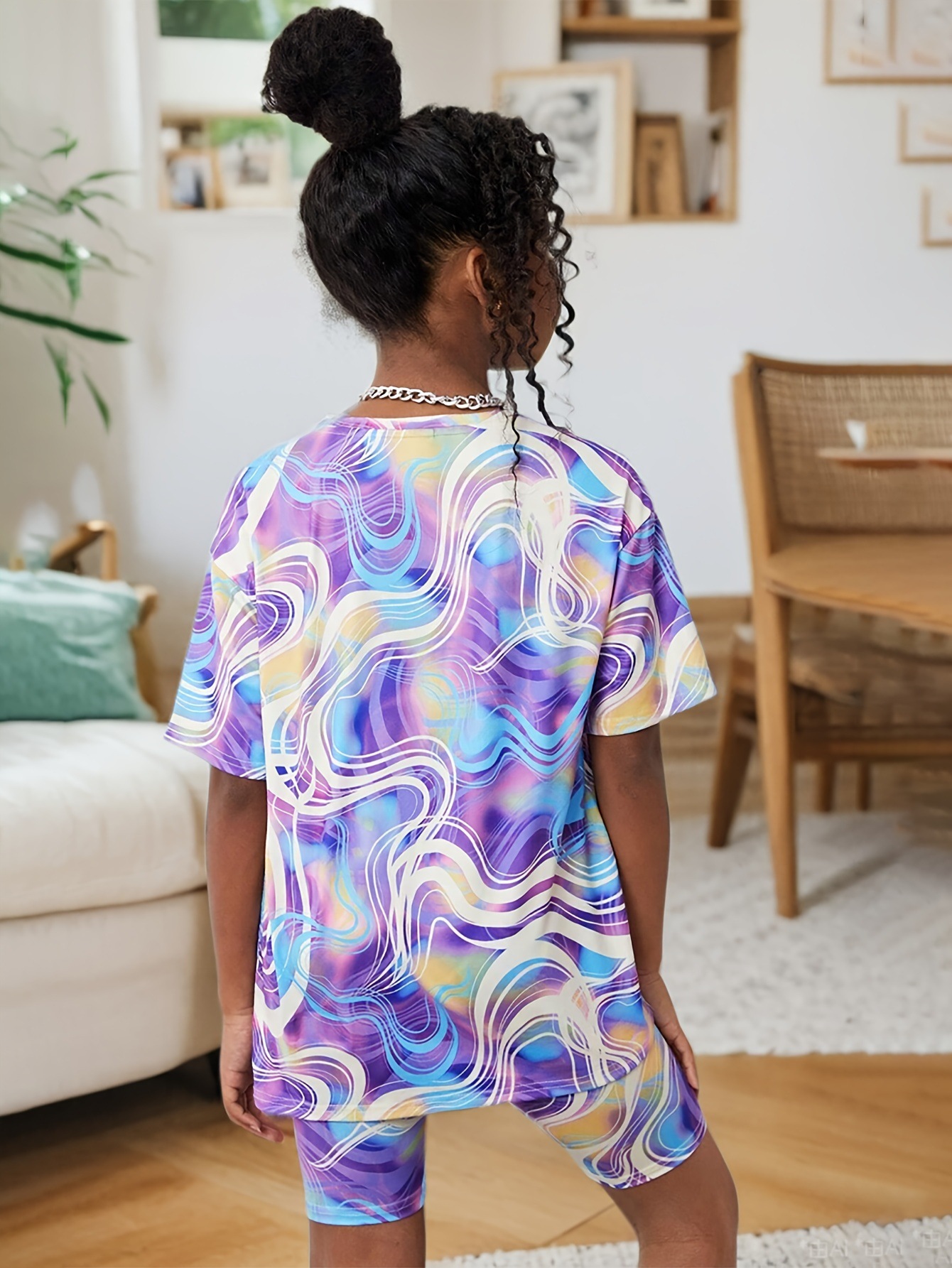 국경 간 무역 INS 여아용 추상 프린트 반팔 세트 라운드넥 티셔츠 1-8세 적합 인기 판매