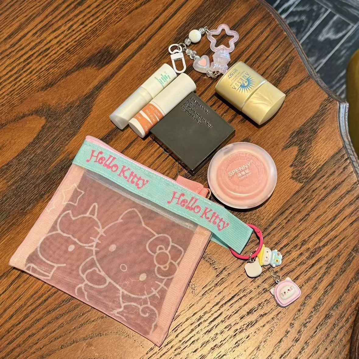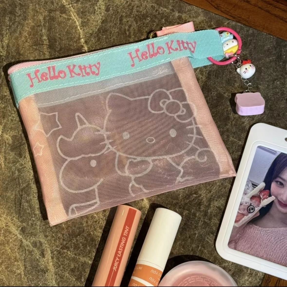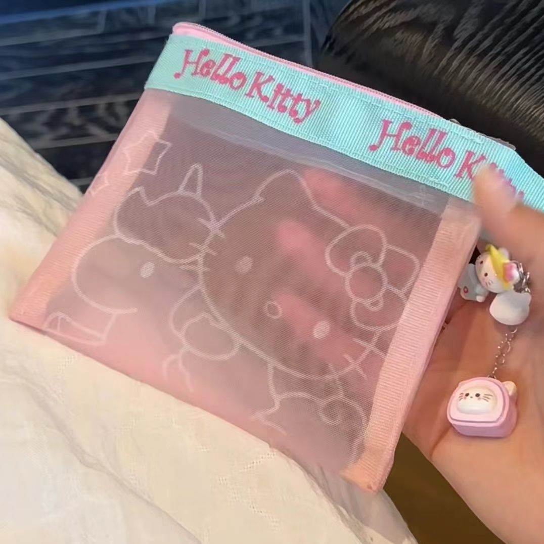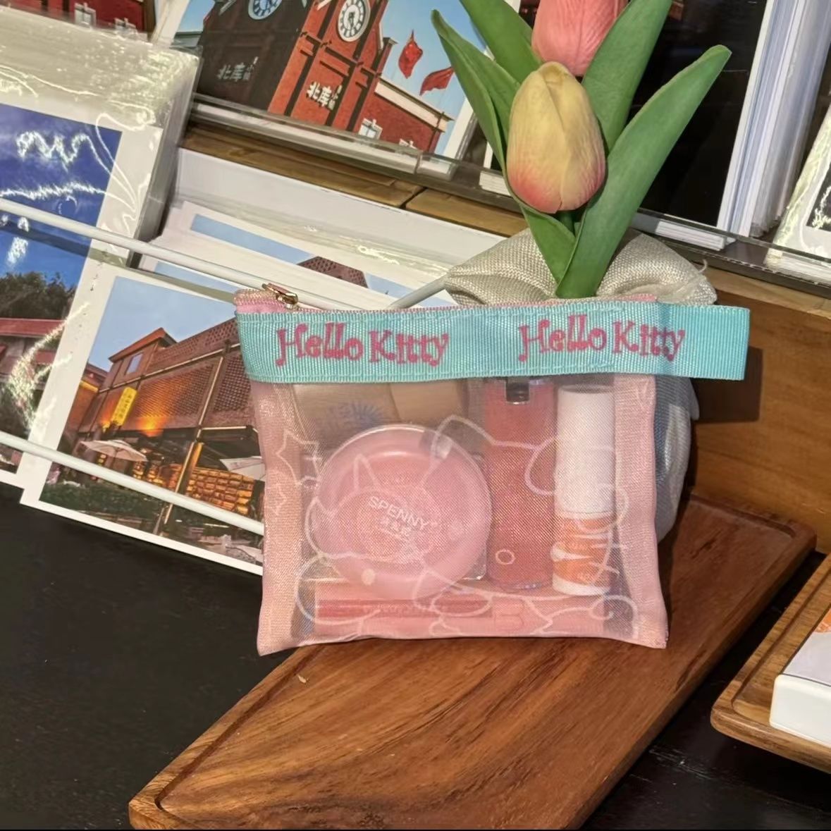 새로운 Kt 고양이 인쇄 부드러운 분말 귀여운 작은 메이크업 가방 위생 수건 가방 여성용 메쉬 보관 가방 투명 카드 가방