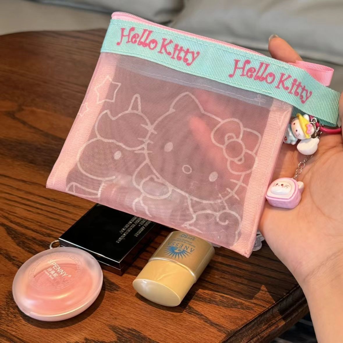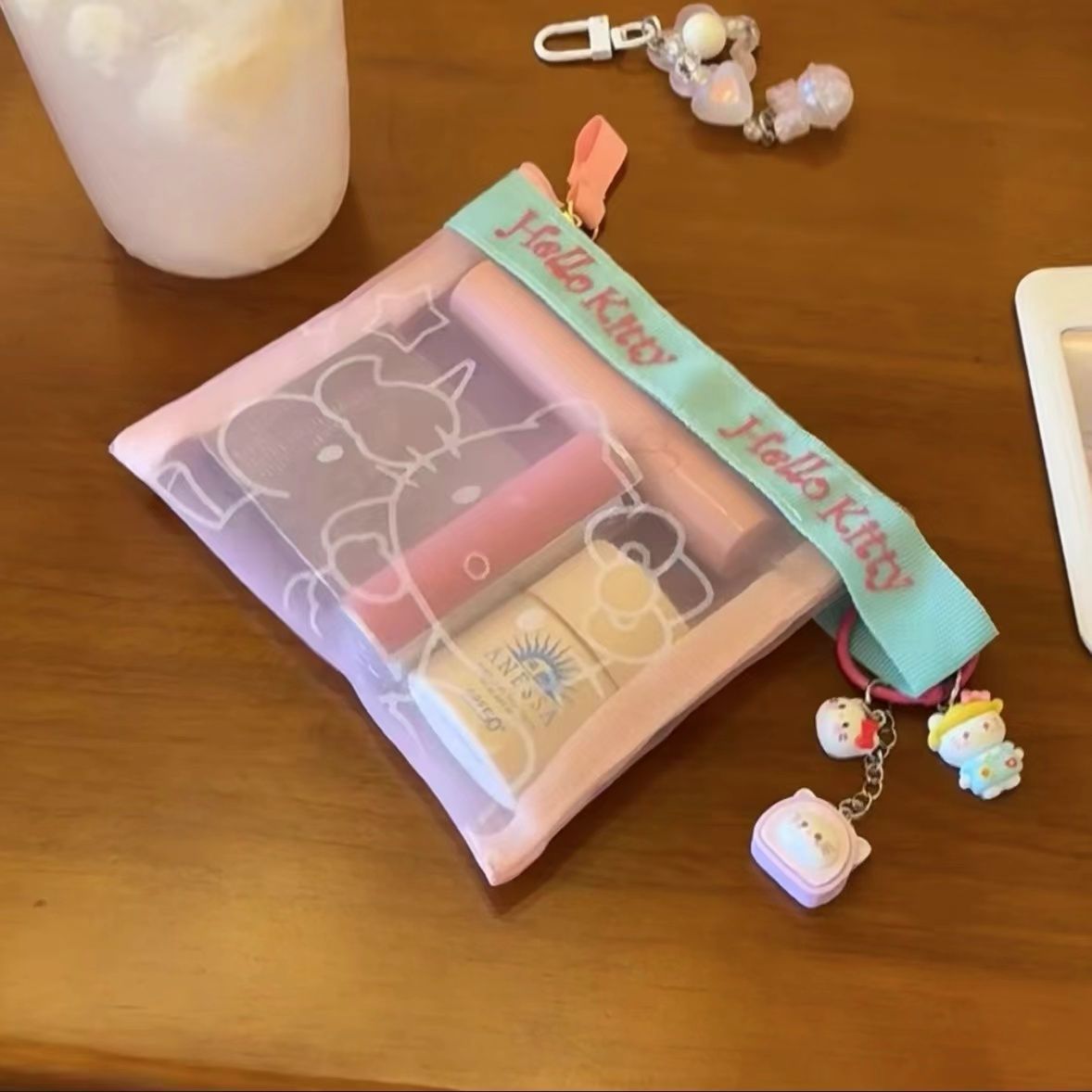새로운 Kt 고양이 인쇄 부드러운 분말 귀여운 작은 메이크업 가방 위생 수건 가방 여성용 메쉬 보관 가방 투명 카드 가방스토어 가기