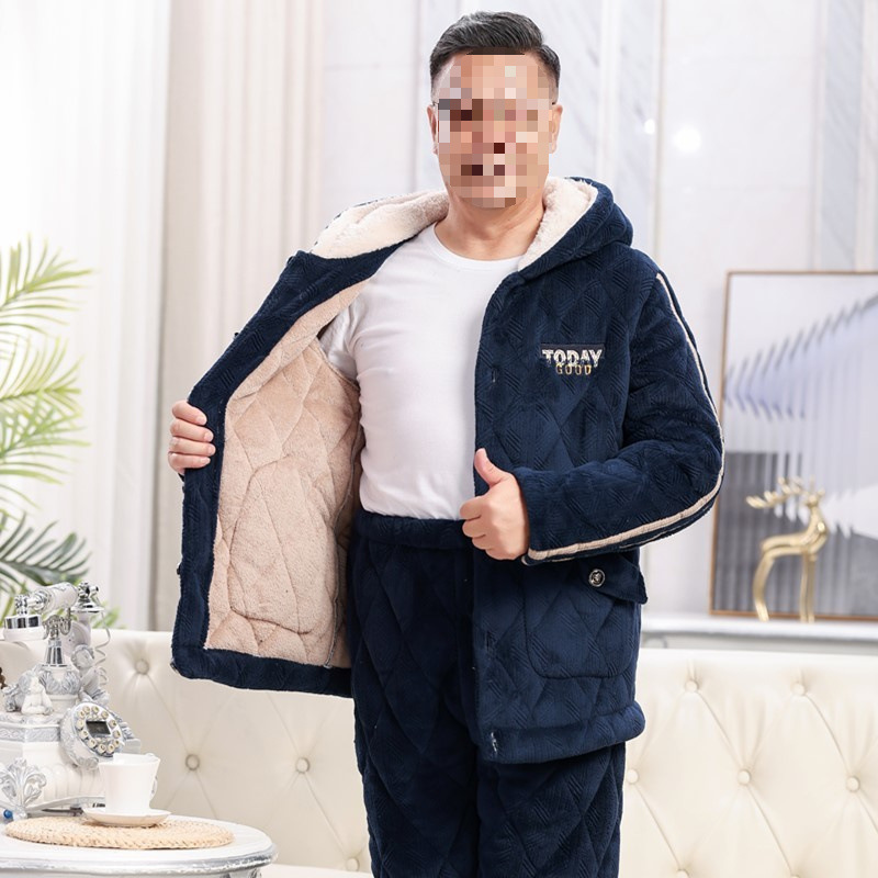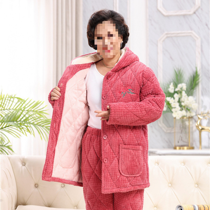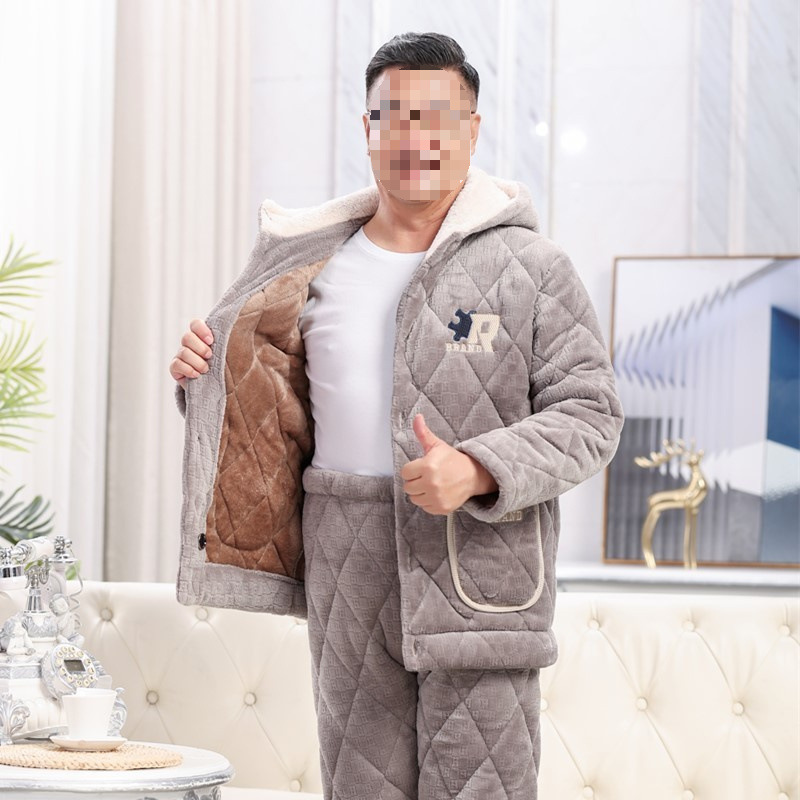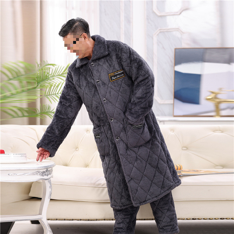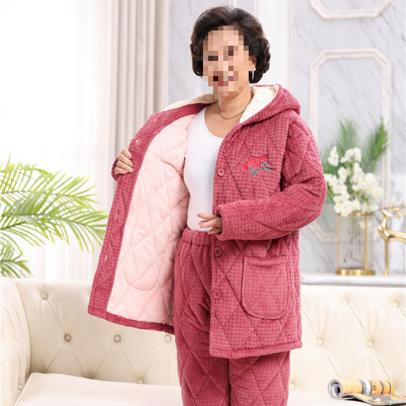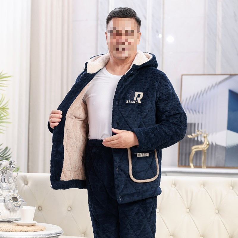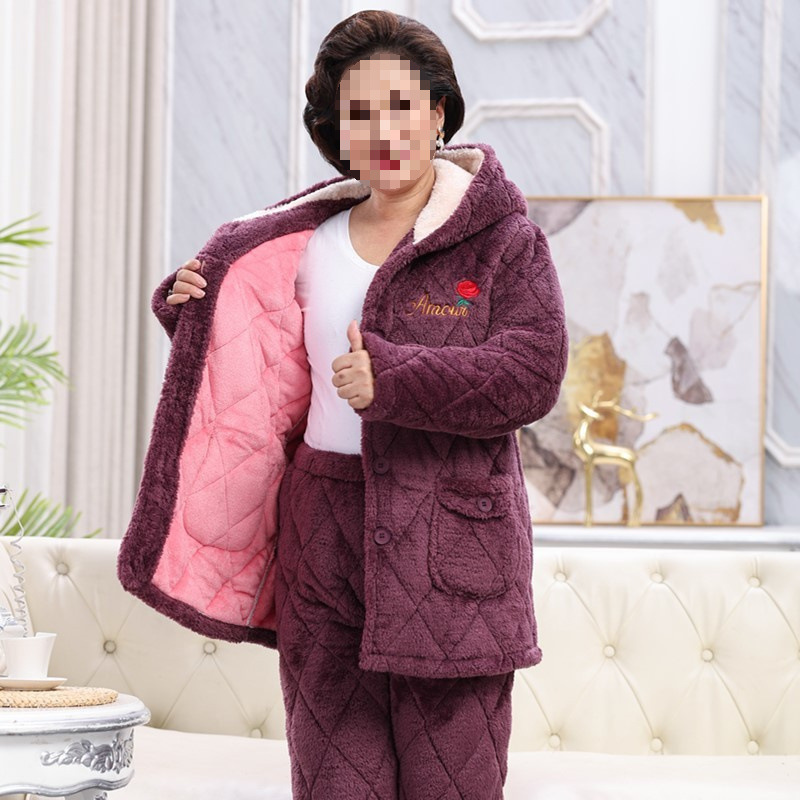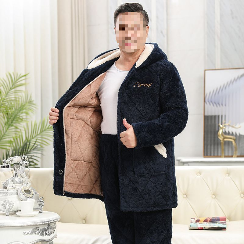 엄마와 아빠 잠옷 중년 및 노인 남성 세트 겨울 슈퍼 두꺼운 따뜻한 3 층 면 패딩 재킷 산호 양털 플러스 사이즈