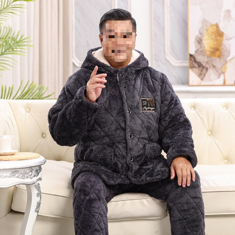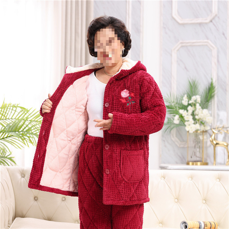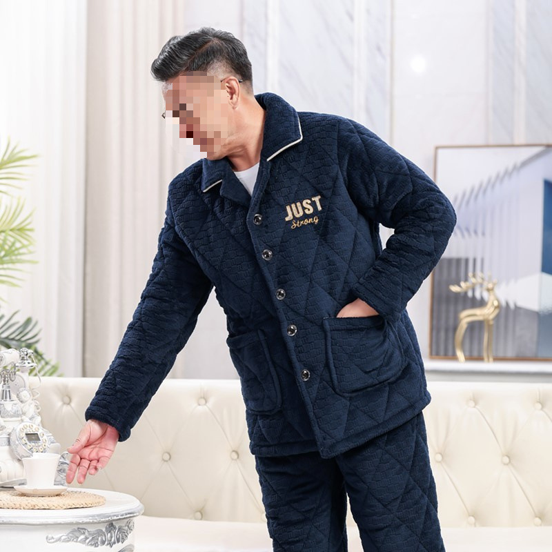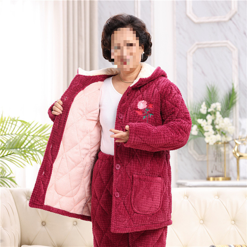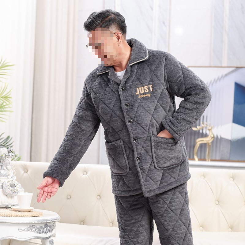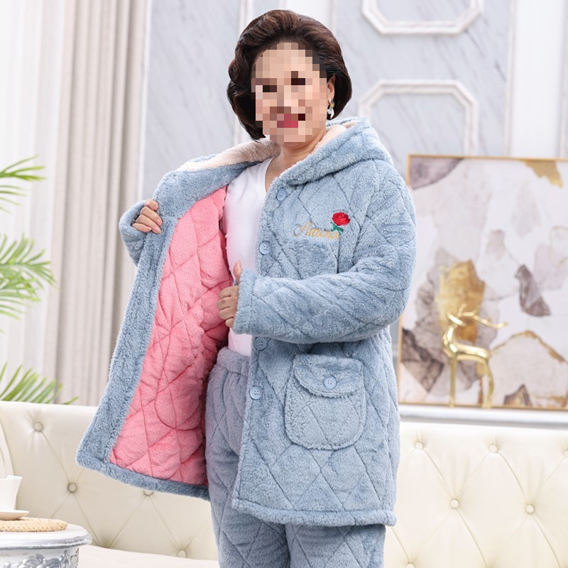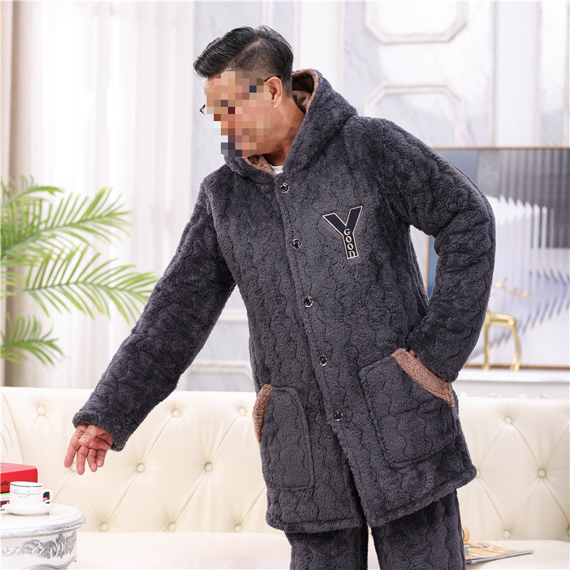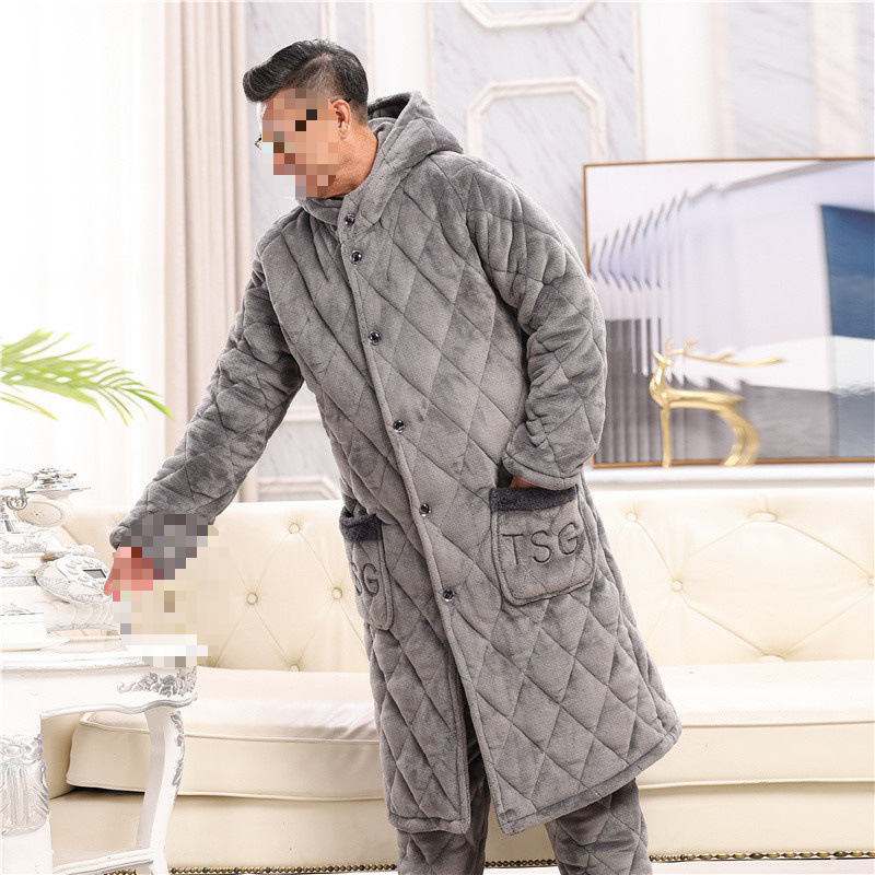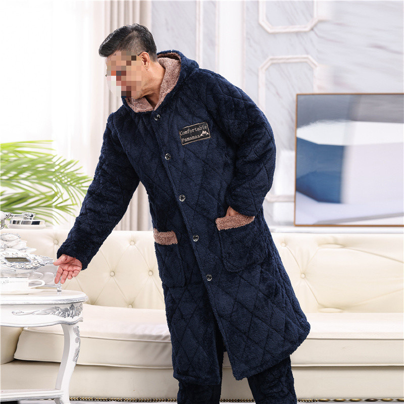엄마와 아빠 잠옷 중년 및 노인 남성 세트 겨울 슈퍼 두꺼운 따뜻한 3 층 면 패딩 재킷 산호 양털 플러스 사이즈