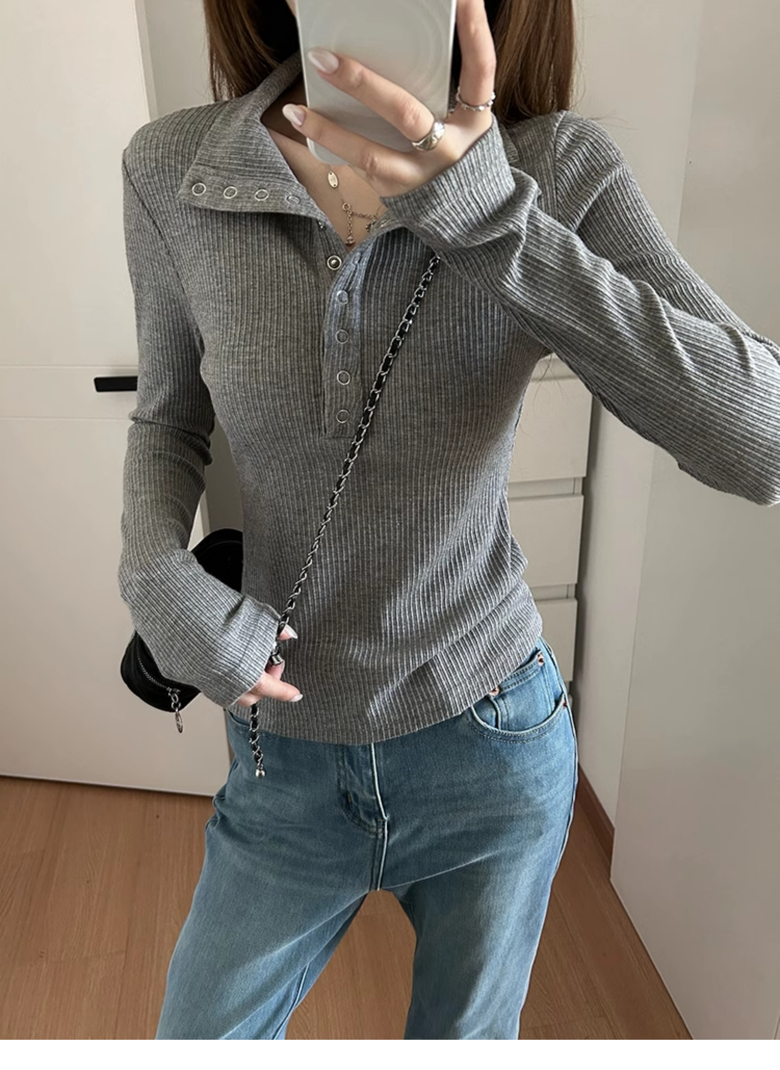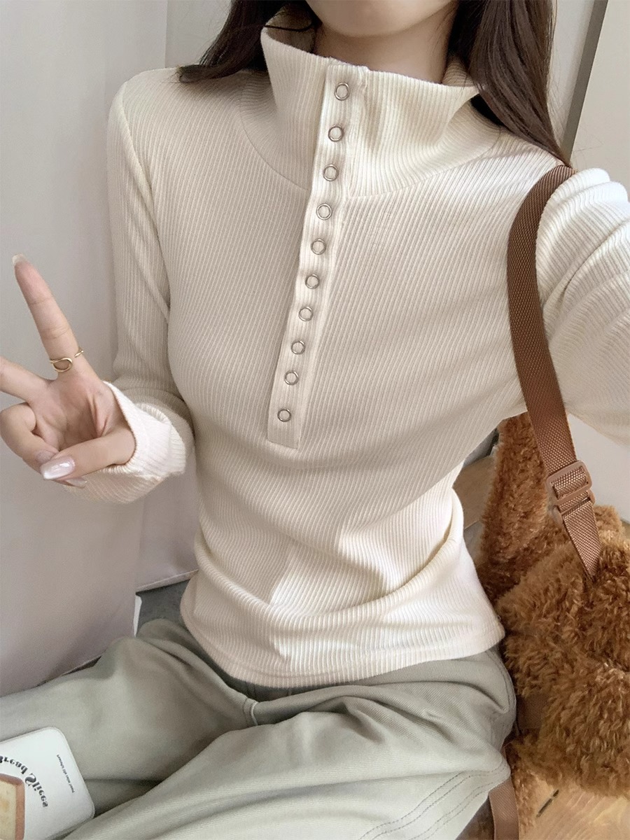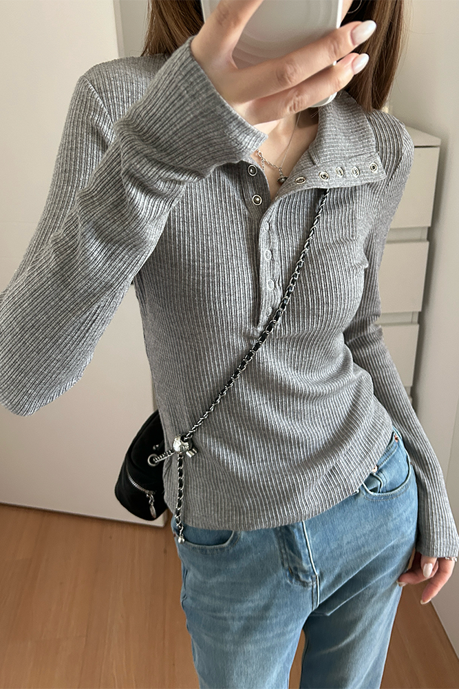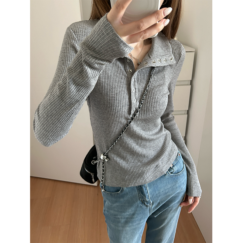 회색 게으르고 편안한 반 오픈 칼라 옷깃 어깨 긴팔 티셔츠 여성용 가을 내부 슬림베이스 셔츠 탑스토어 가기