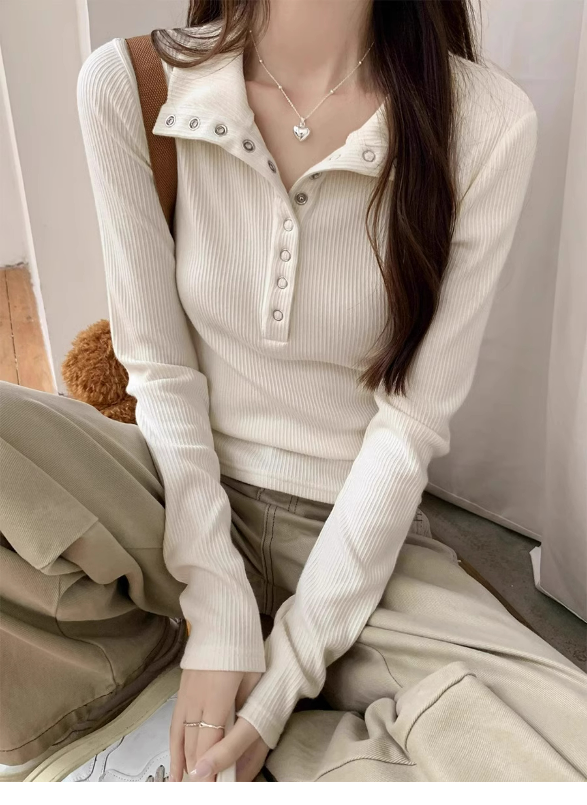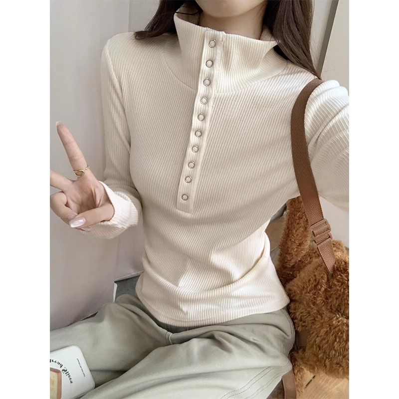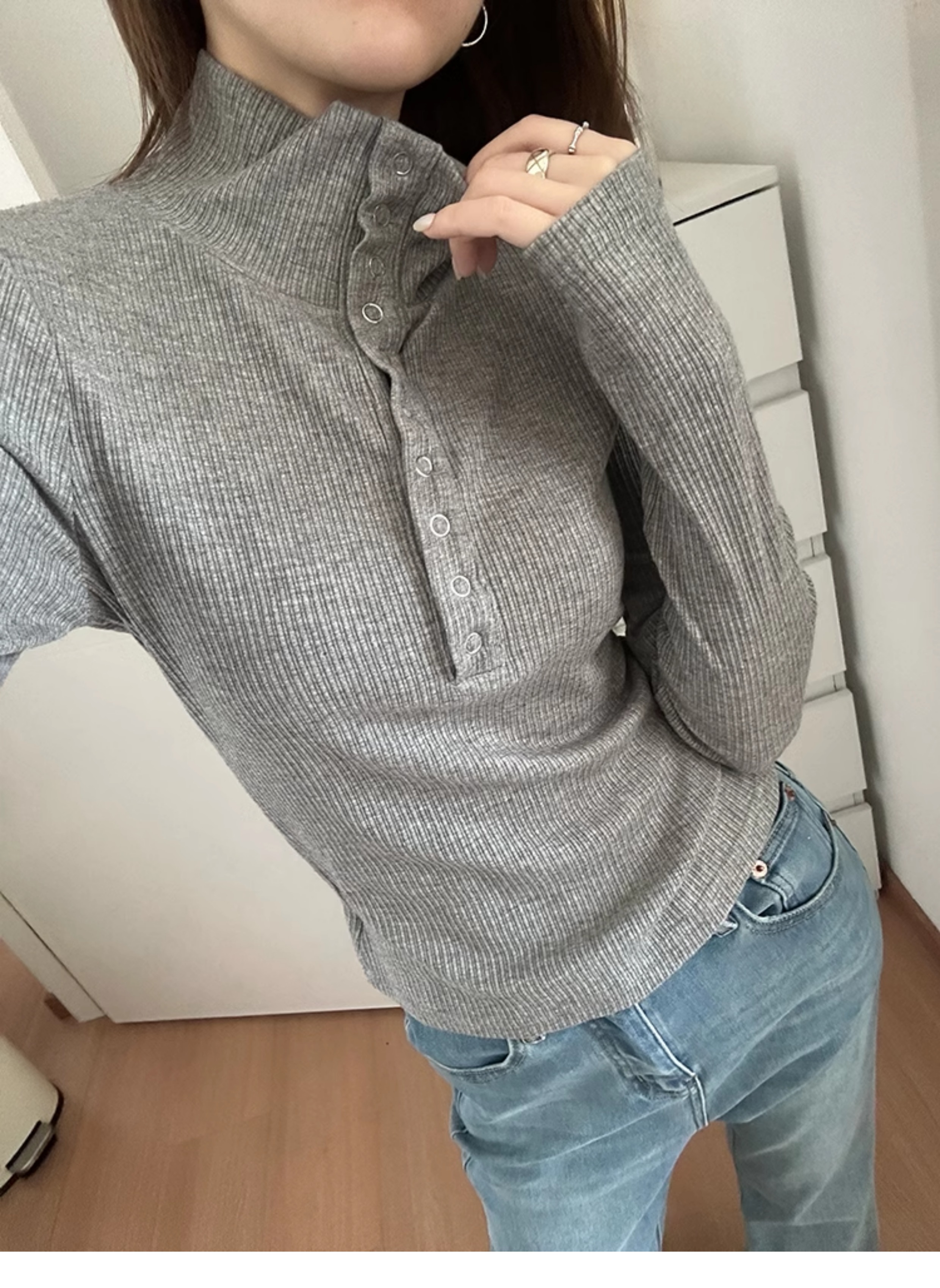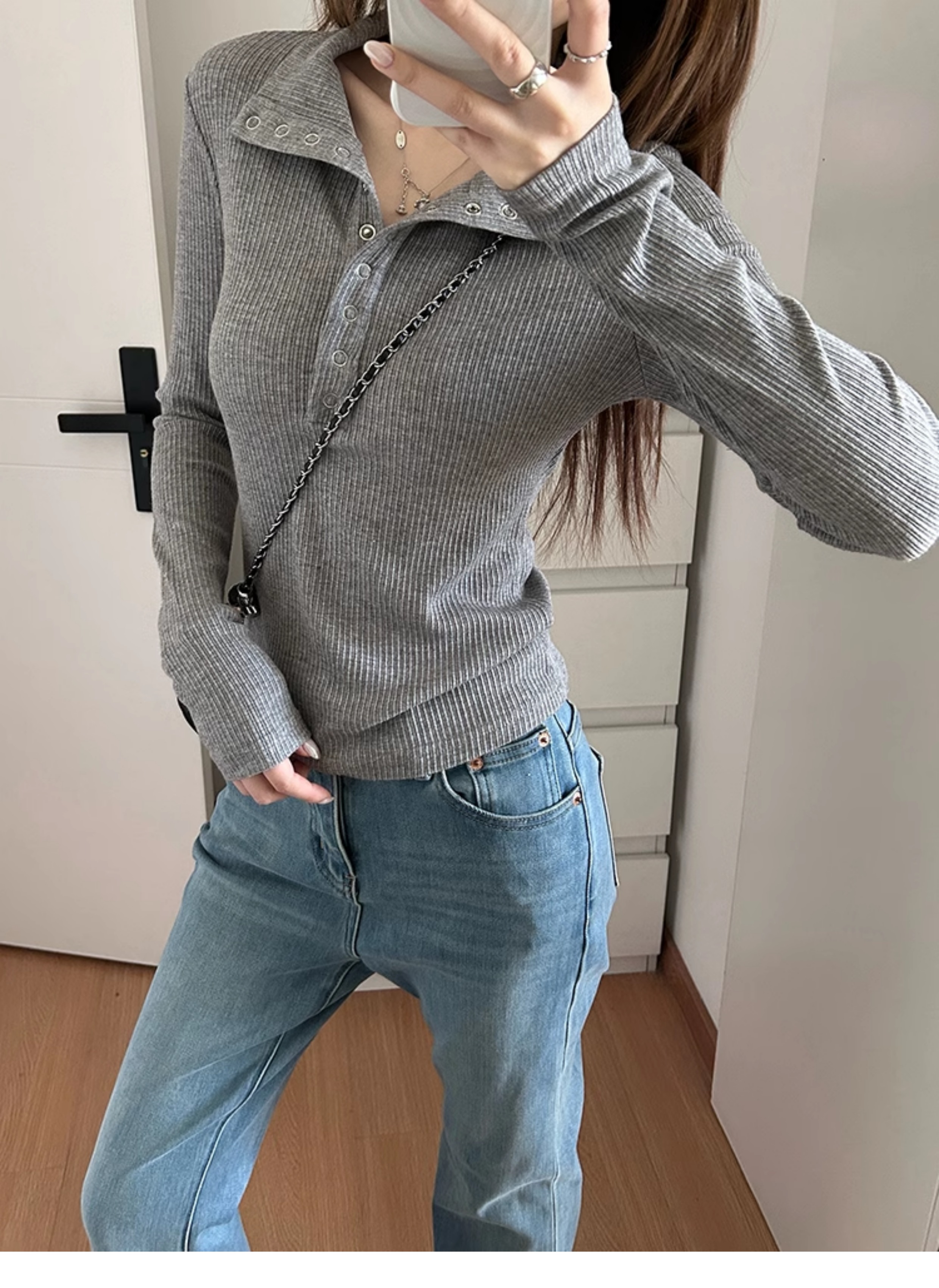 회색 게으르고 편안한 반 오픈 칼라 옷깃 어깨 긴팔 티셔츠 여성용 가을 내부 슬림베이스 셔츠 탑스토어 가기