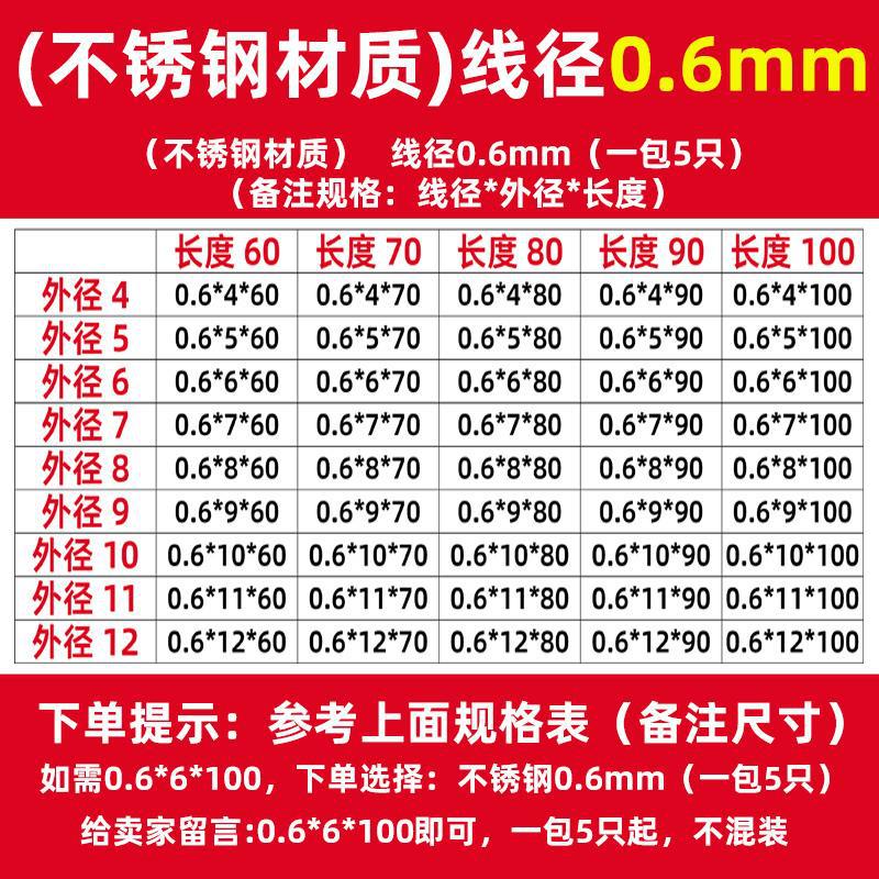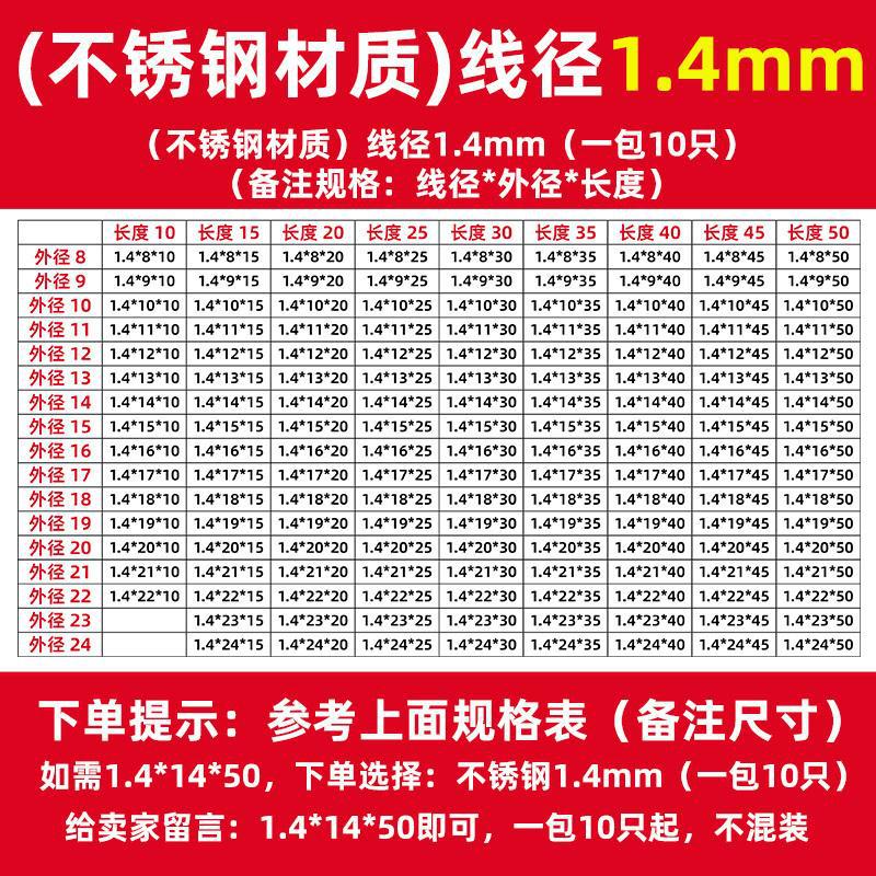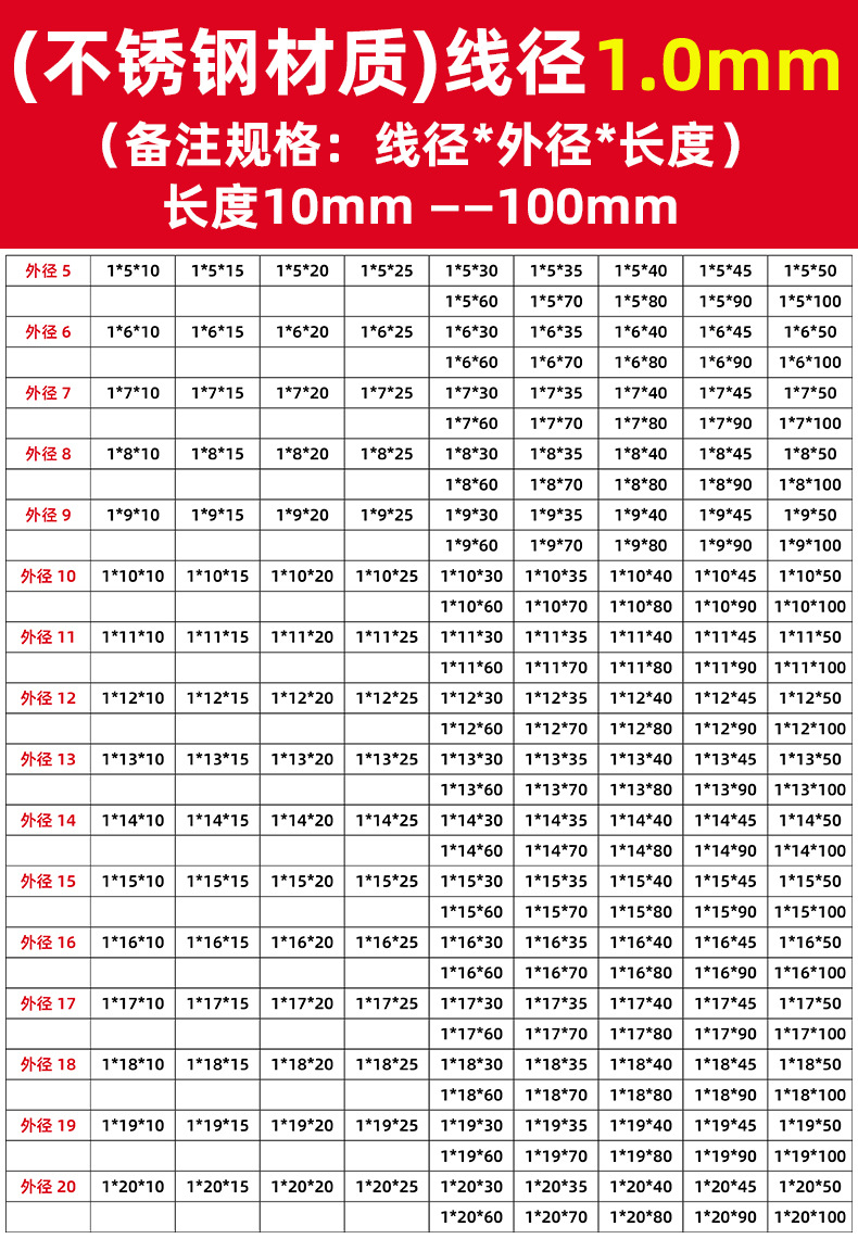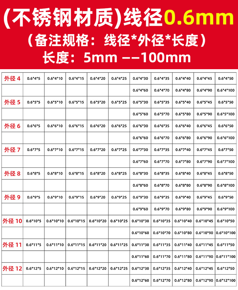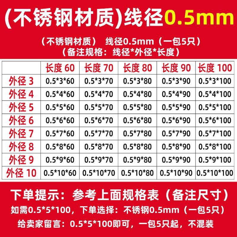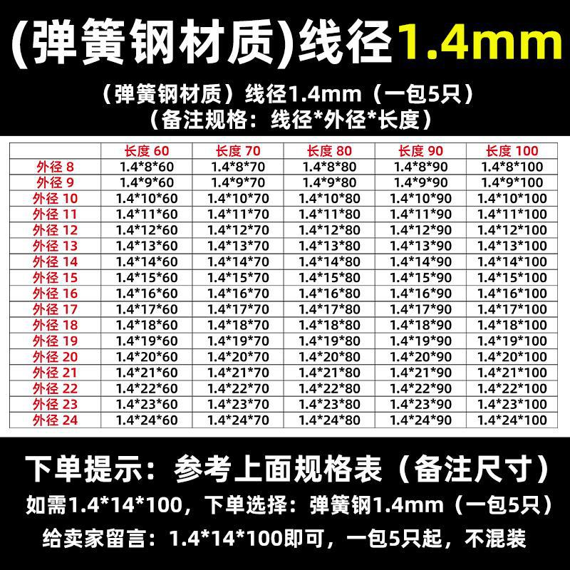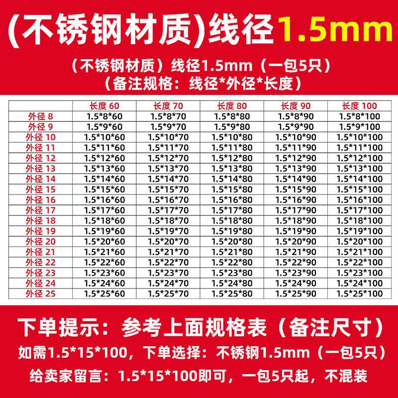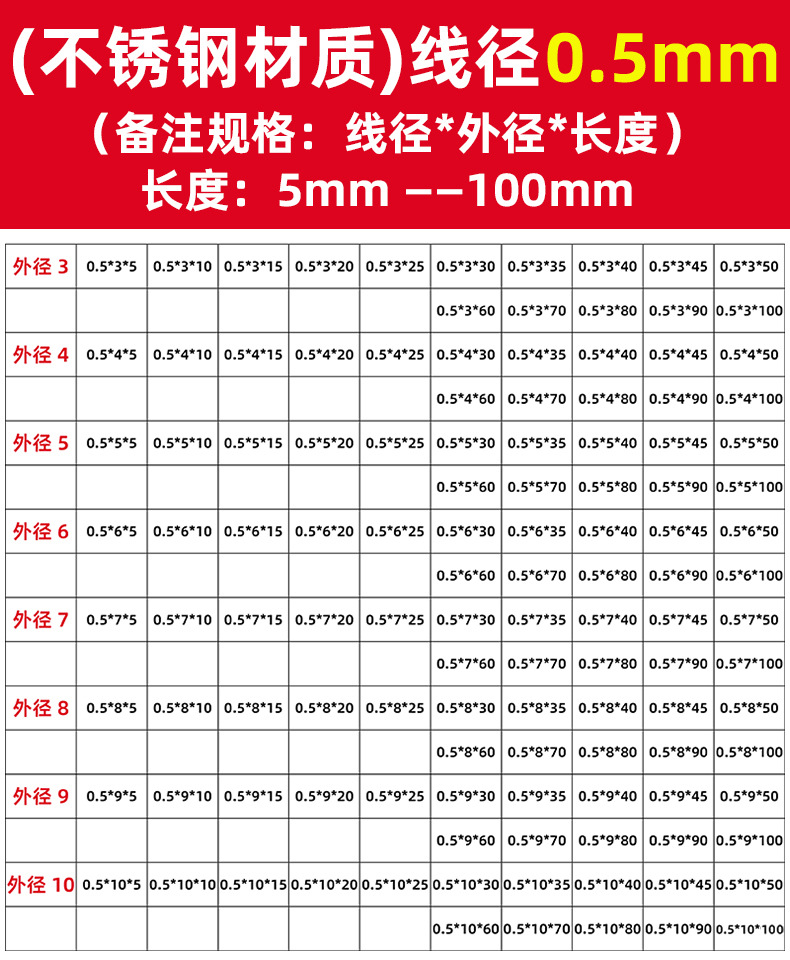 • 치수는 와이어 직경 * 외경 * 길이(밀리미터 단위)입니다.