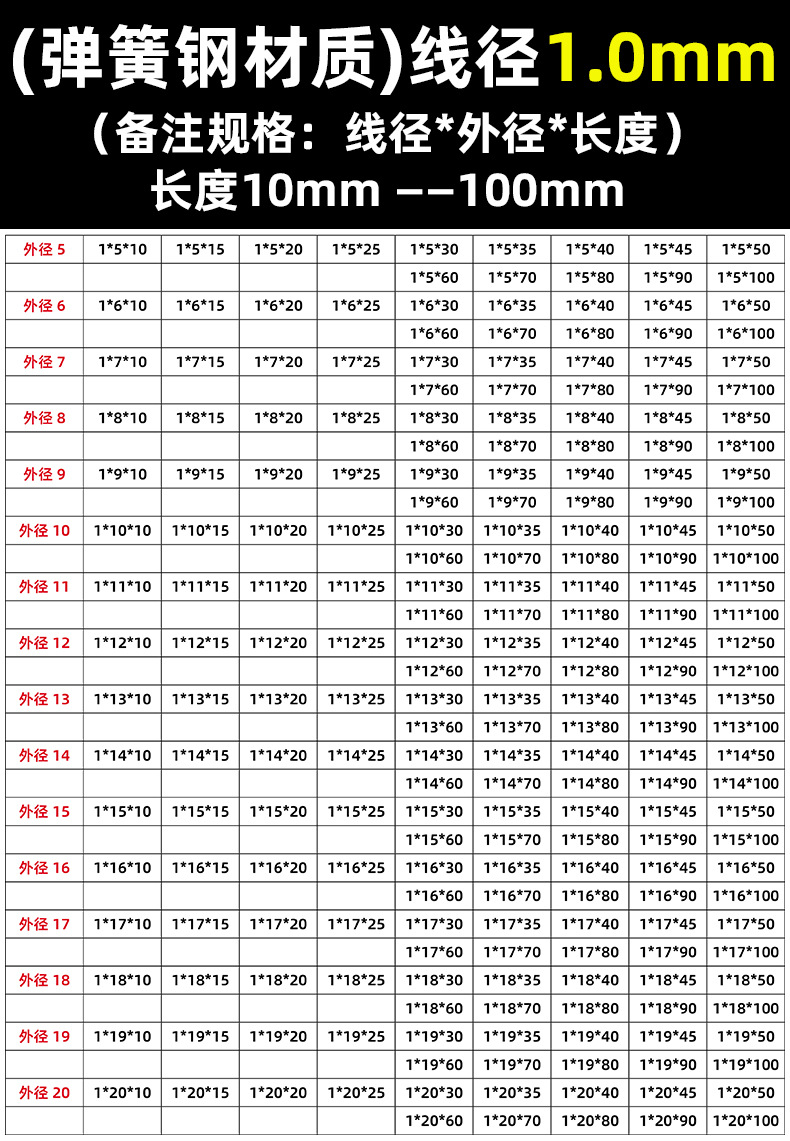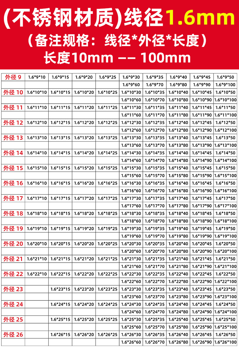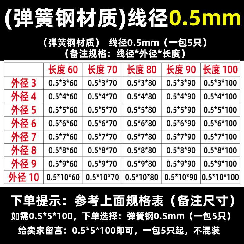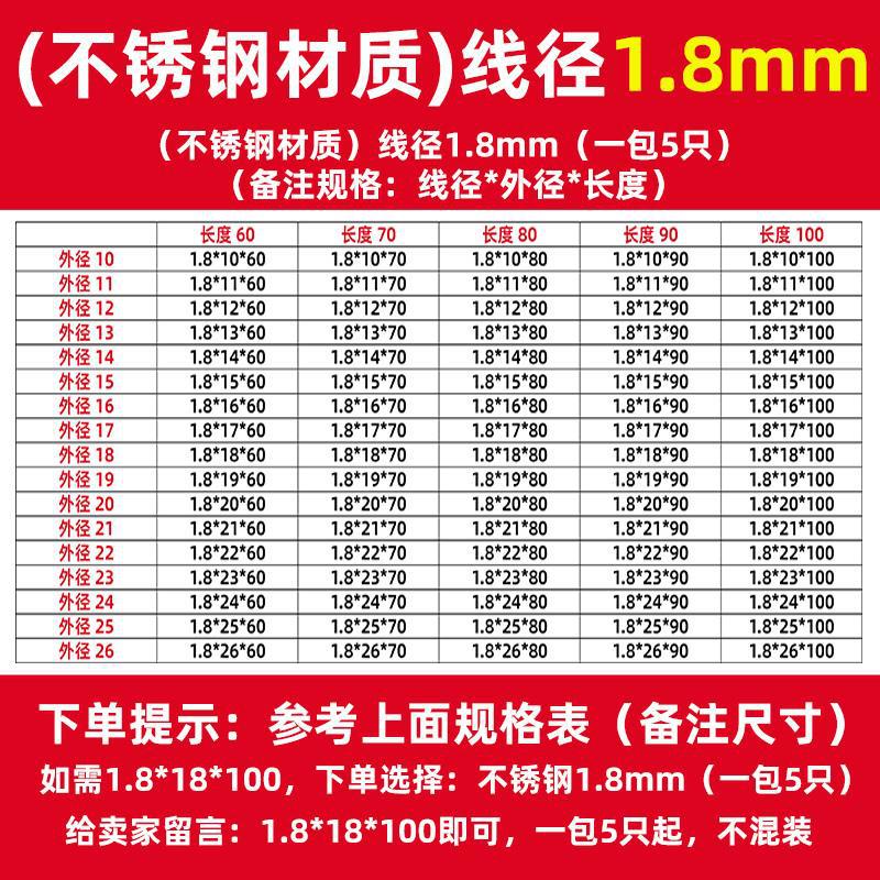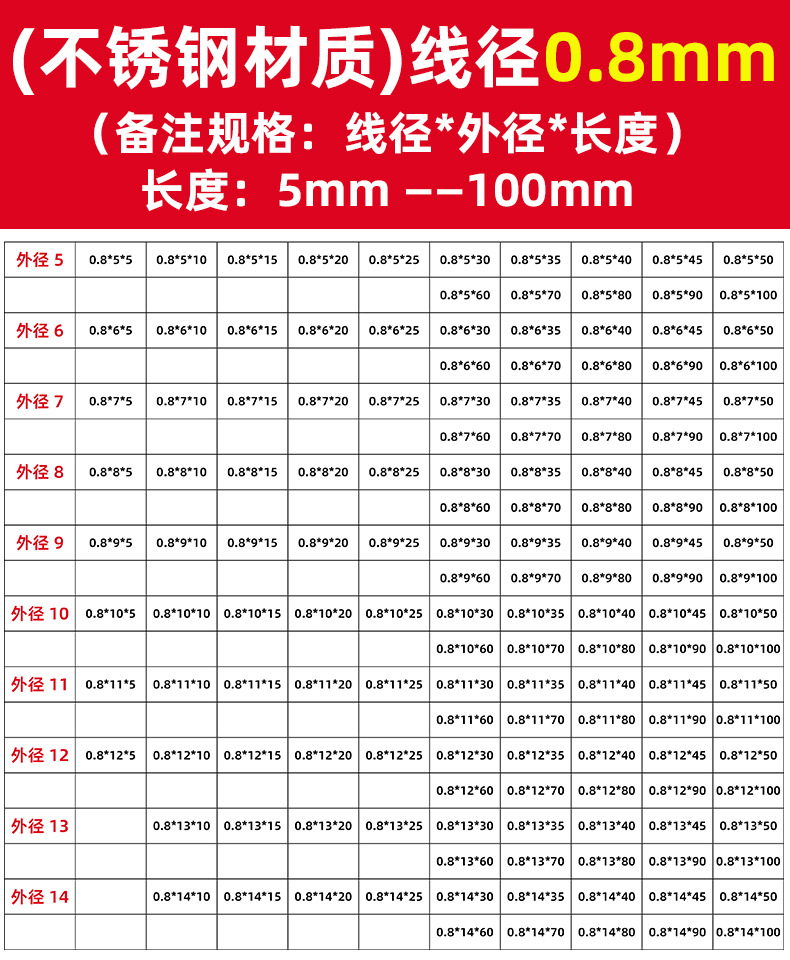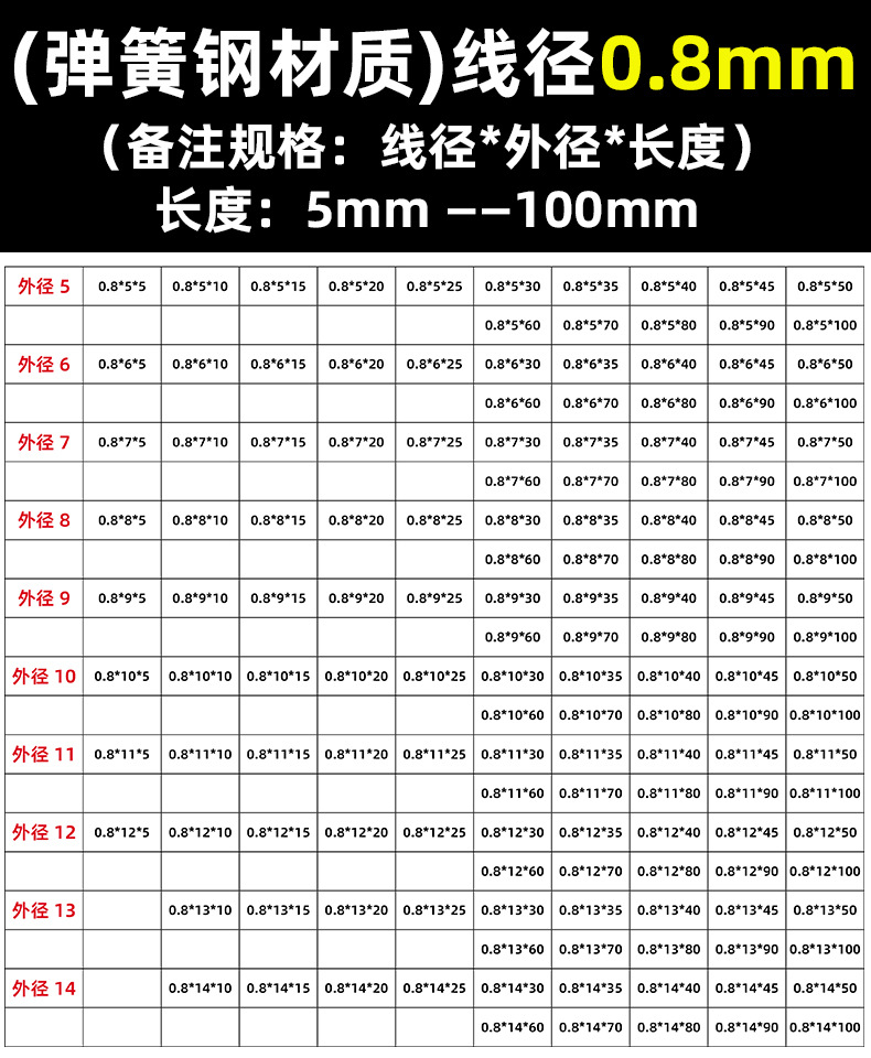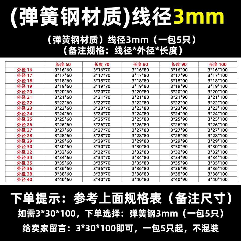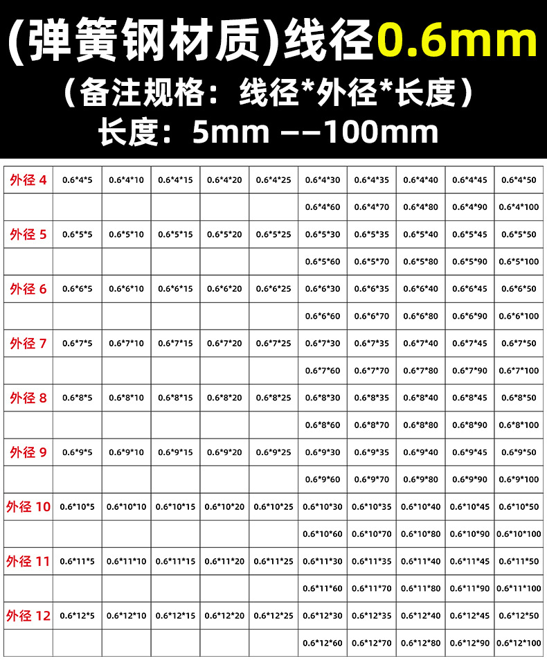 • 치수는 와이어 직경 * 외경 * 길이(밀리미터 단위)입니다.