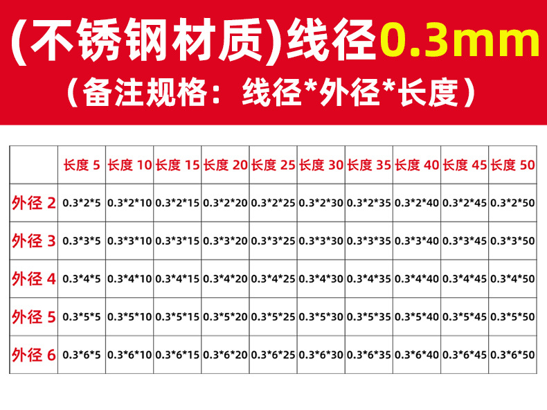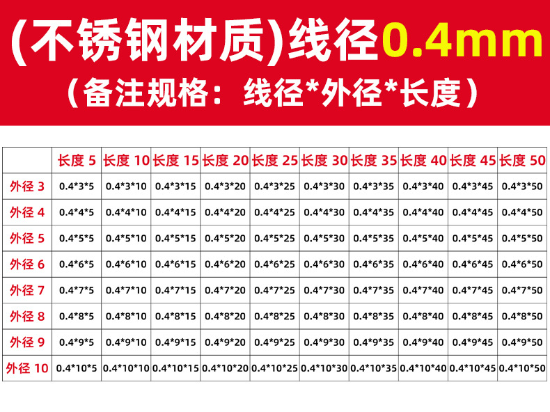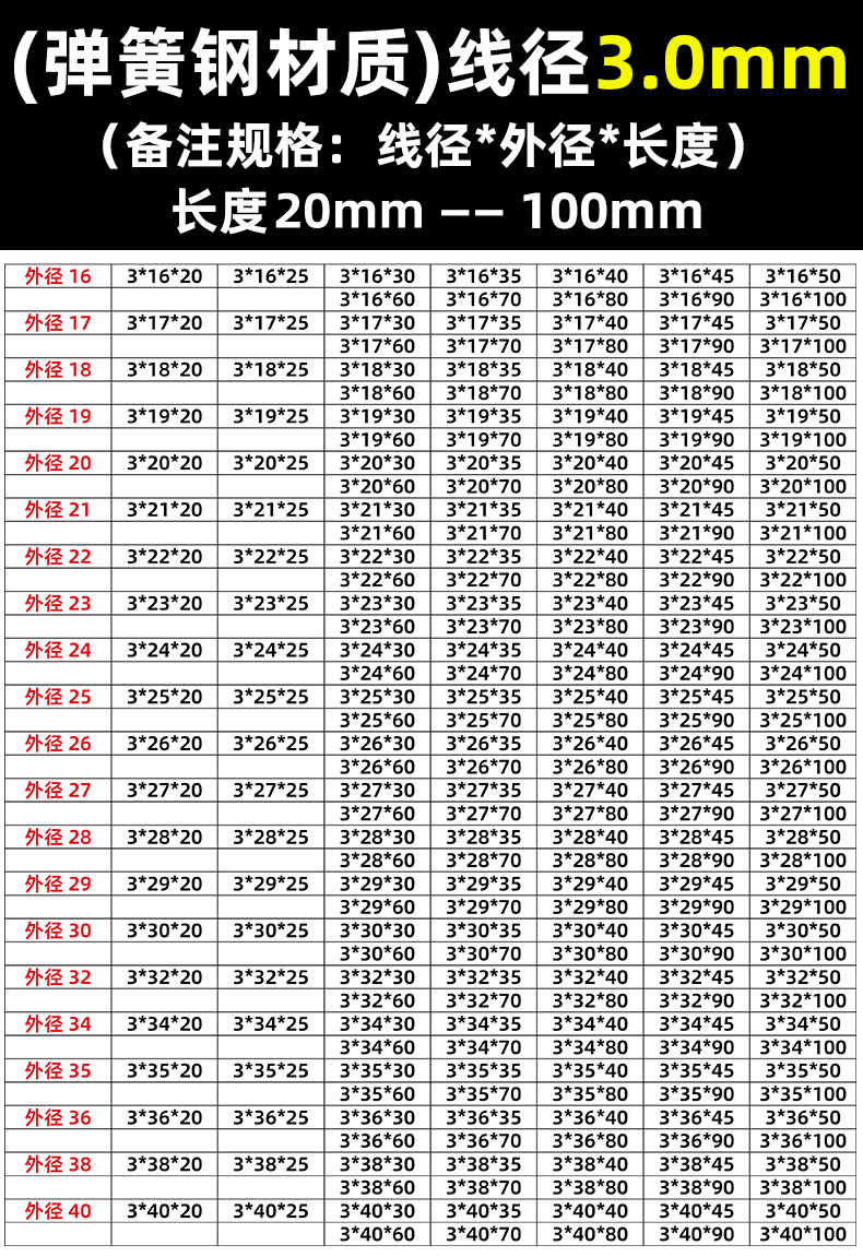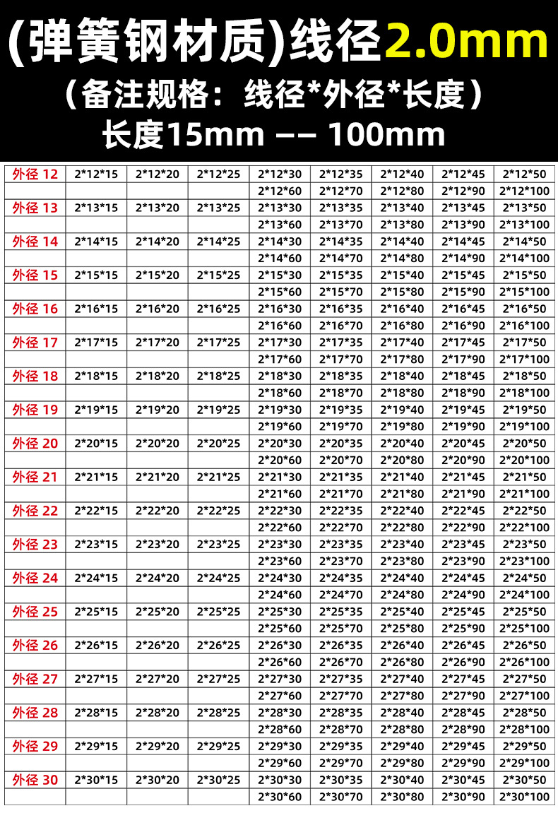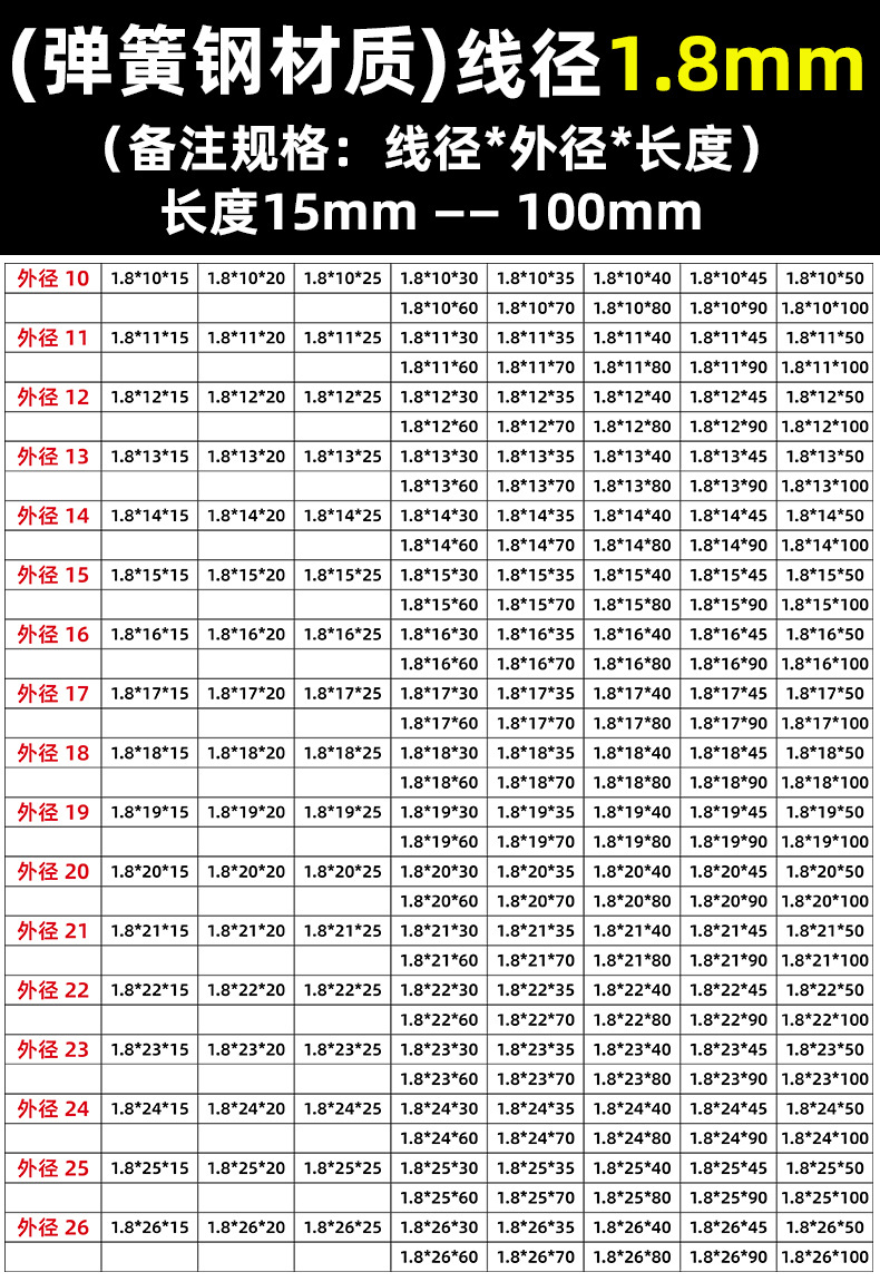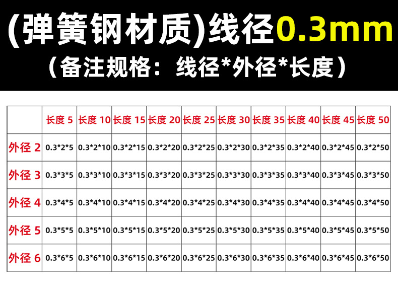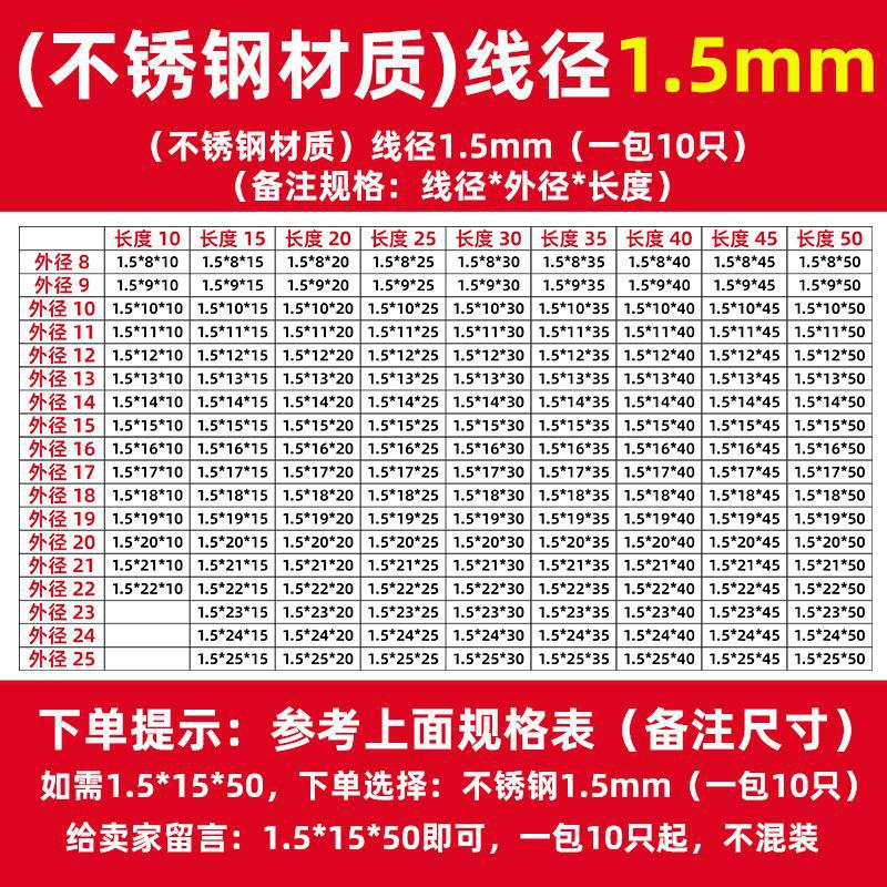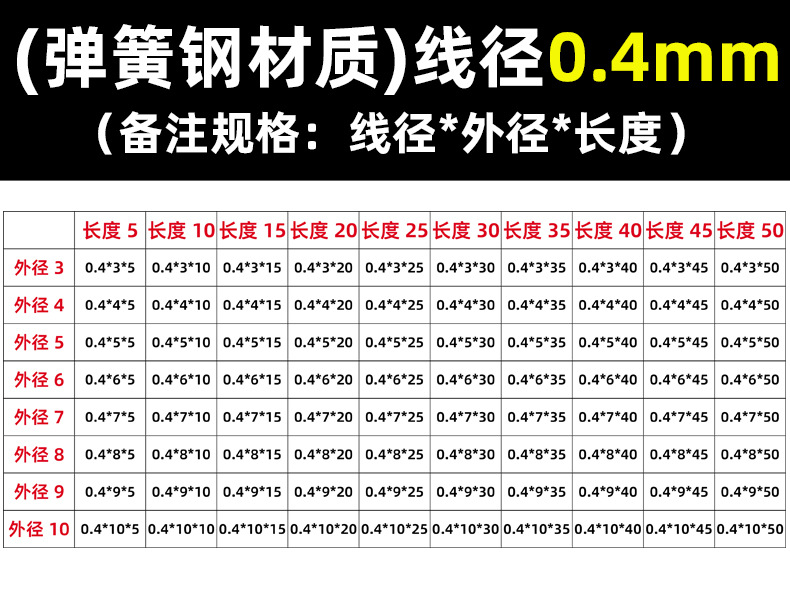 • 치수는 와이어 직경 * 외경 * 길이(밀리미터 단위)입니다.