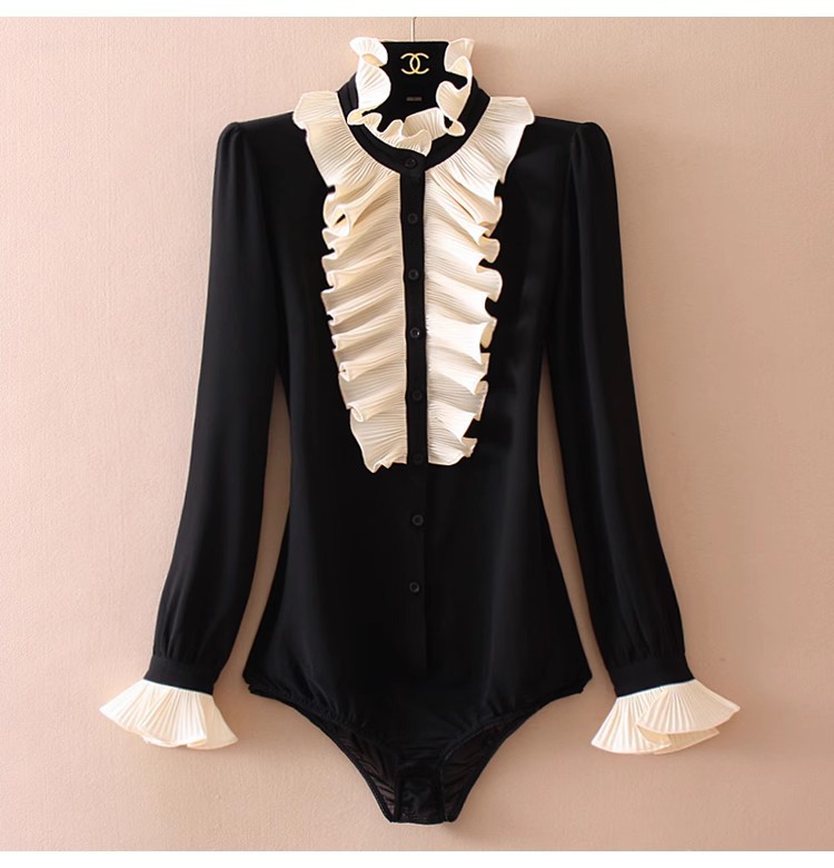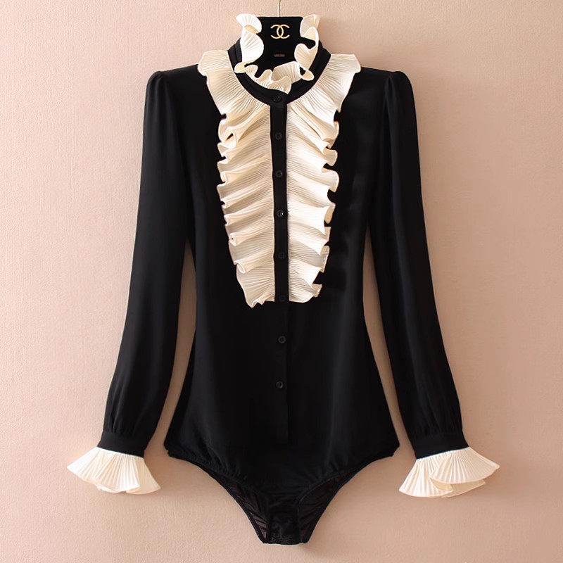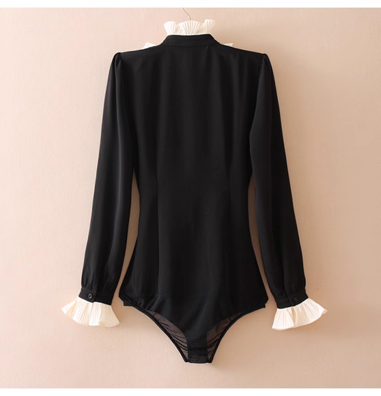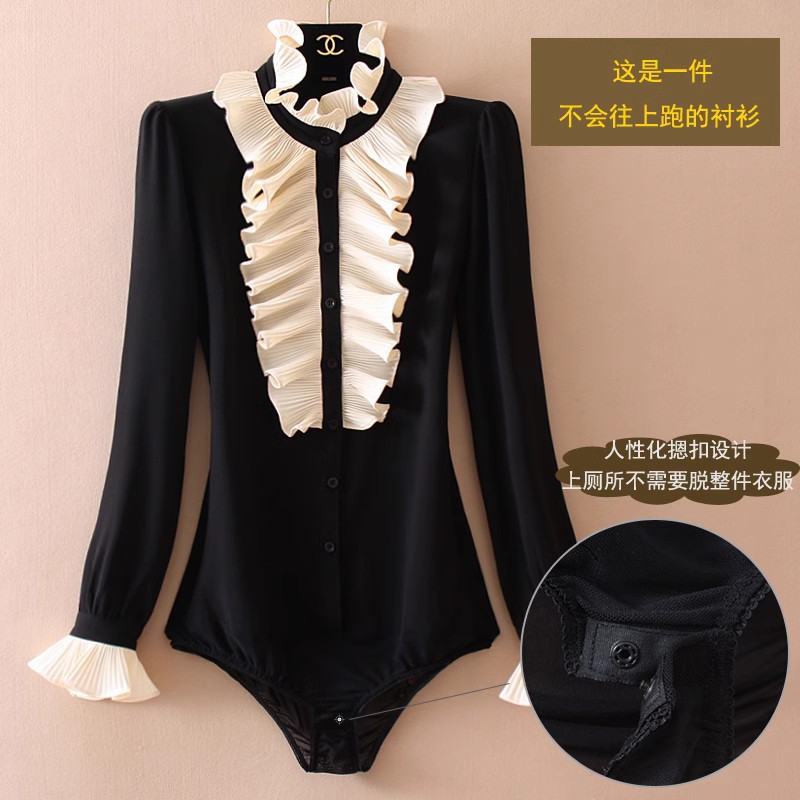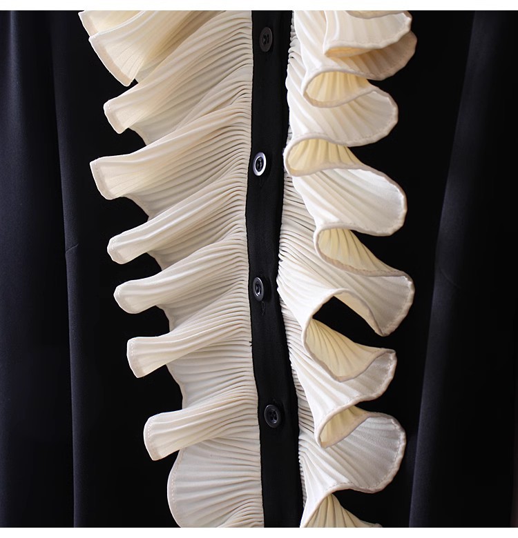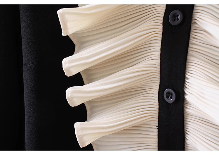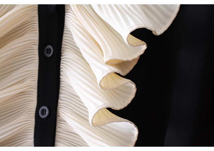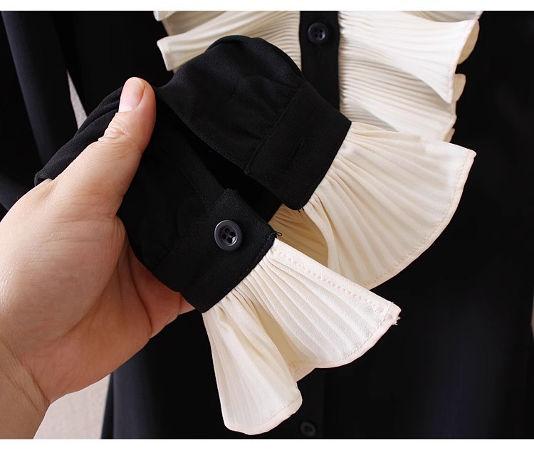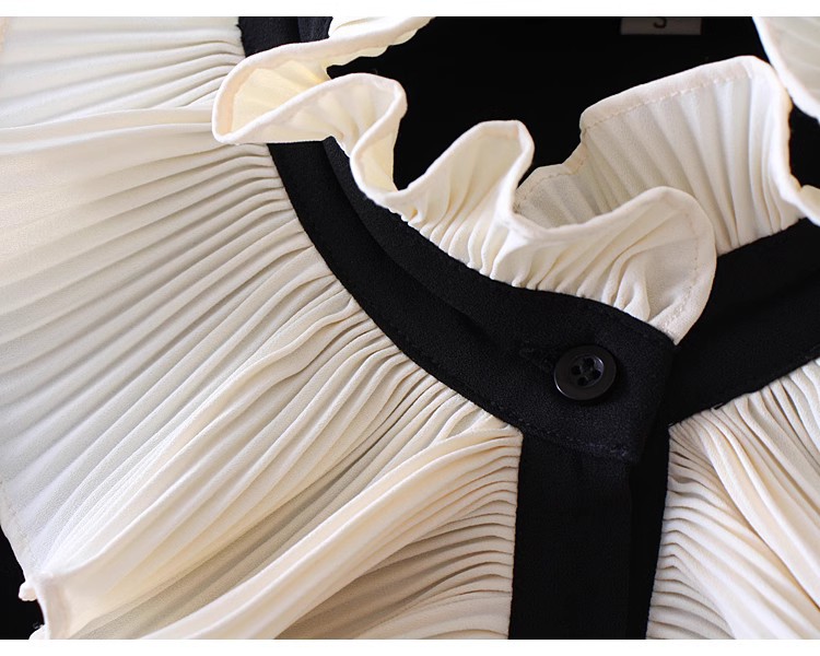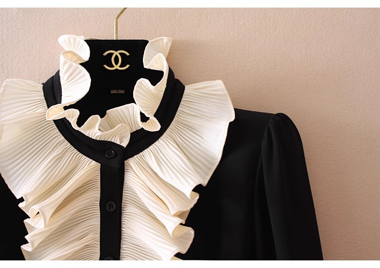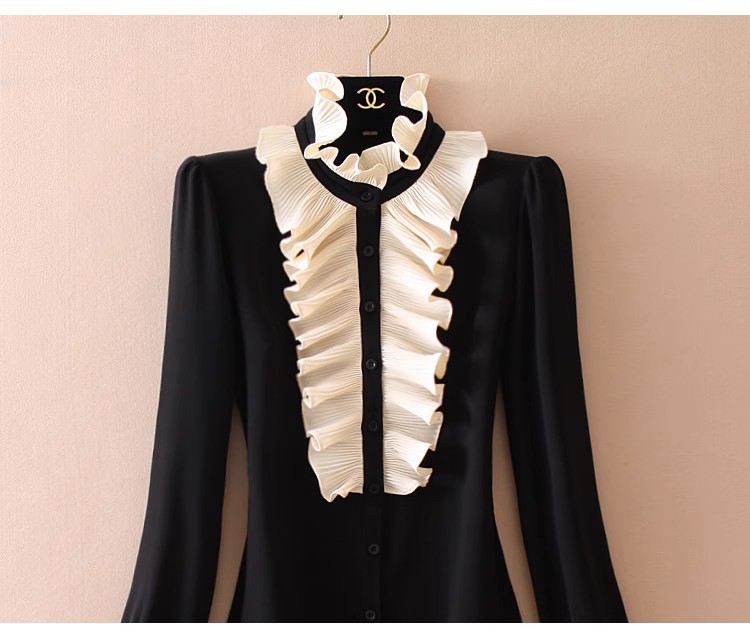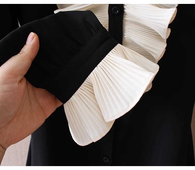 브랜드 우아한 러플 오르간 플리트 유행 우아한 콘트라스트 쉬폰 셔츠 블랙 결합 셔츠 여성용 크로트스토어 가기