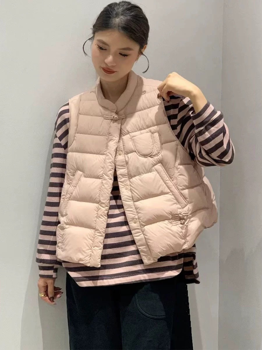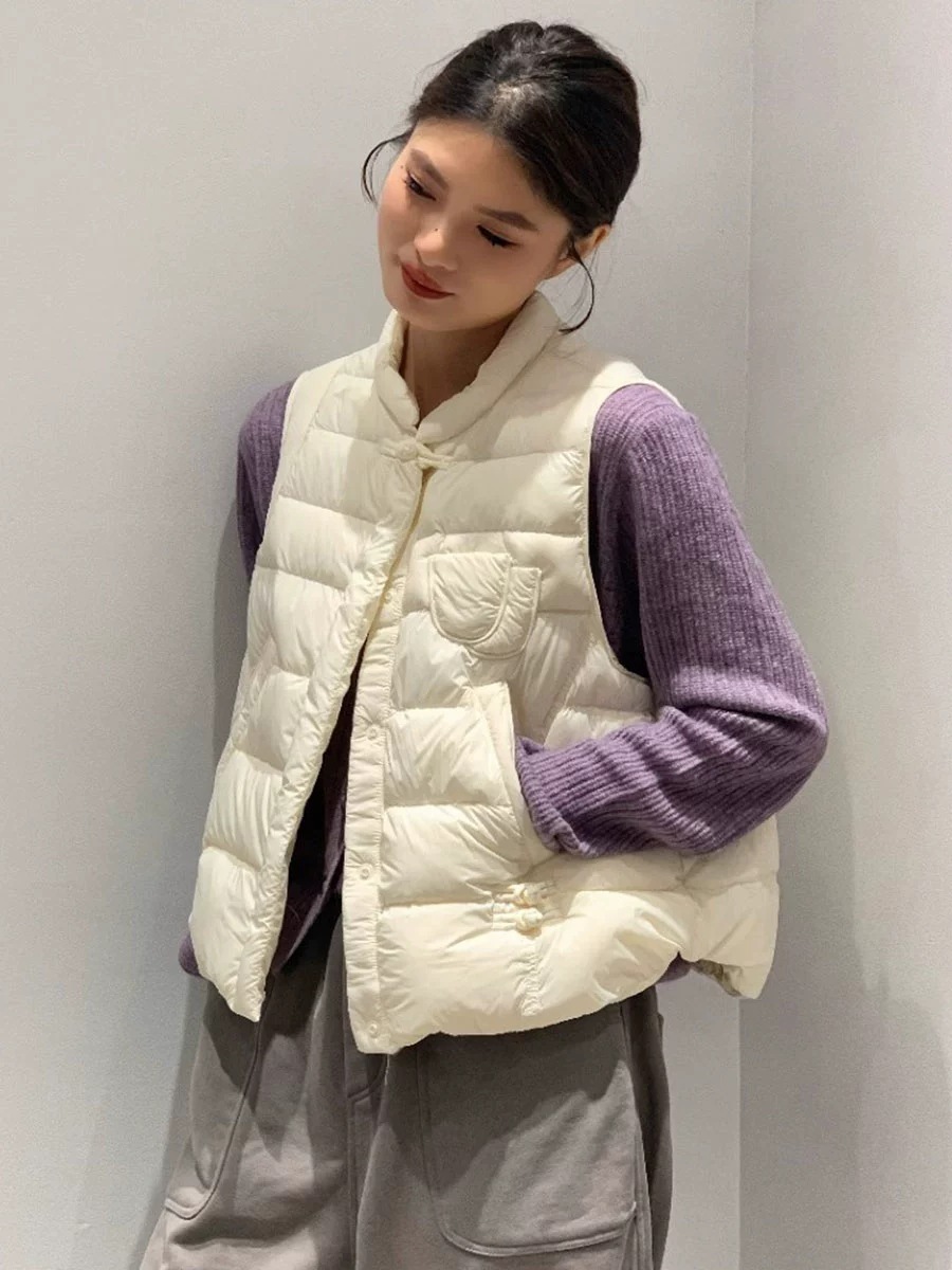 2025 겨울 평후 경량 다운 조끼 여성용 스탠드 칼라 단추 90% 백오리털 조끼 자켓