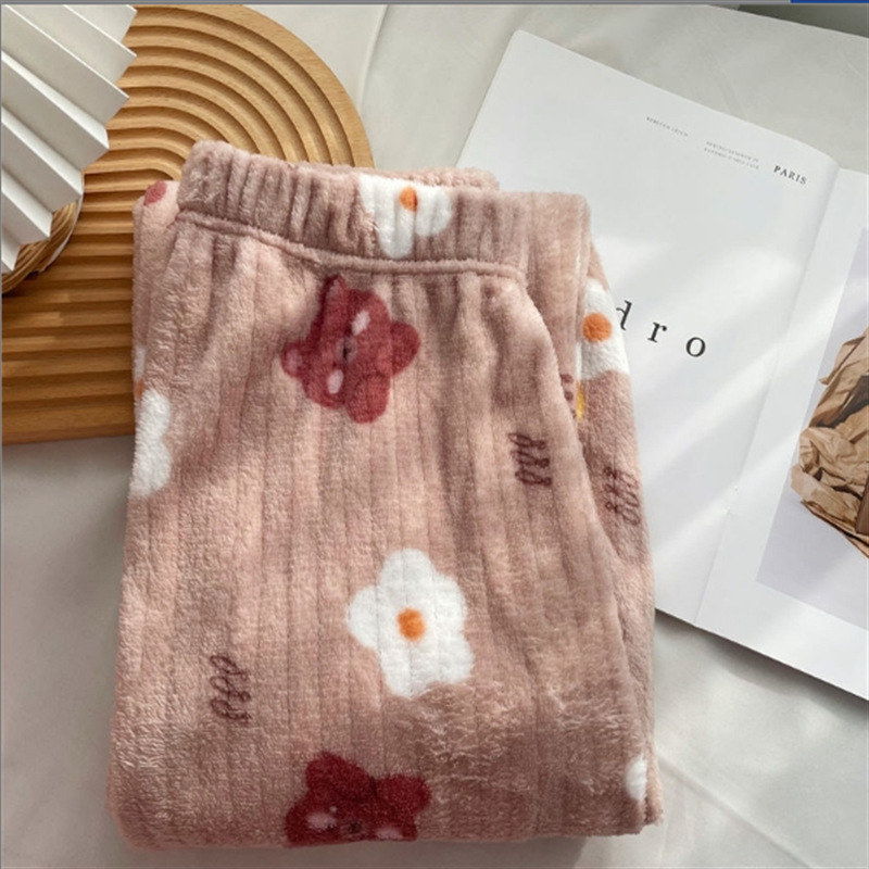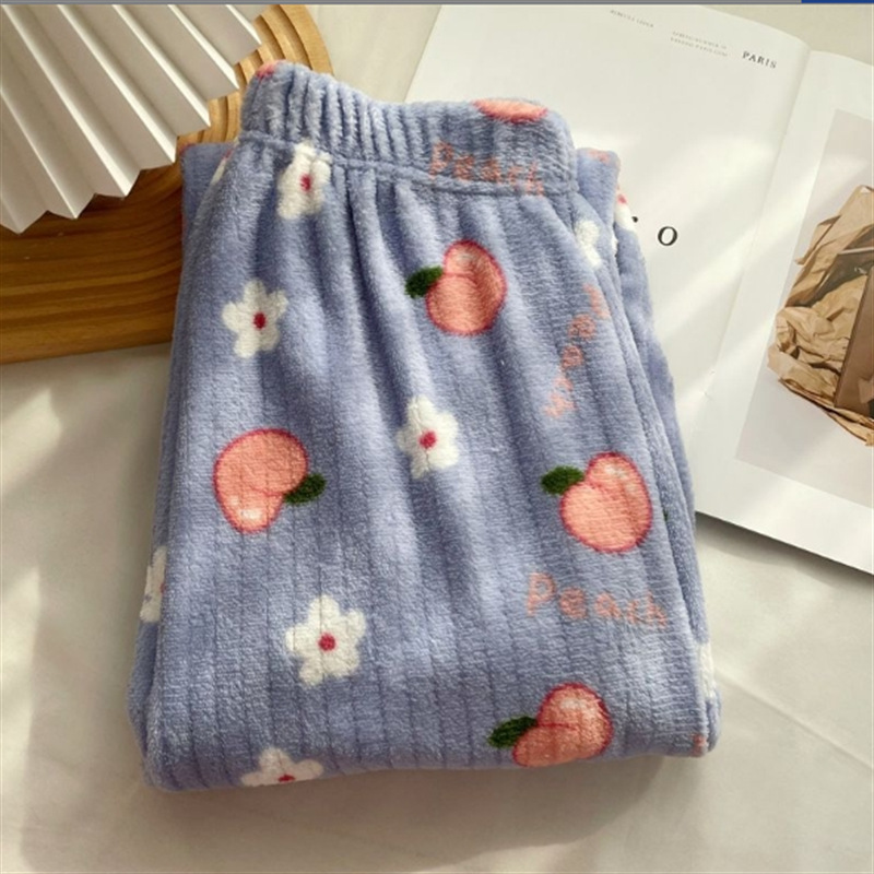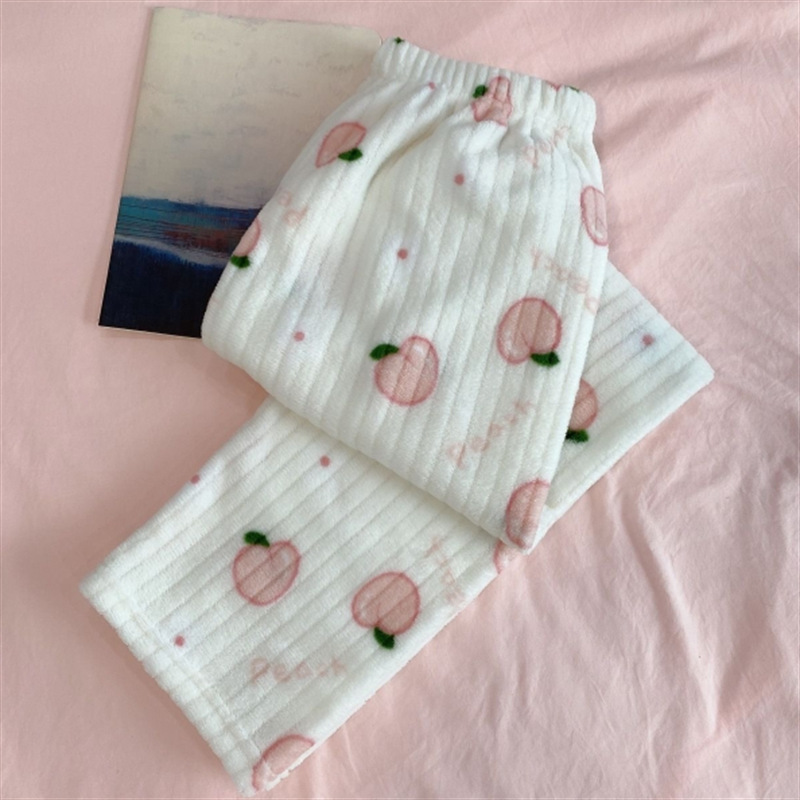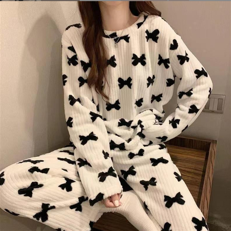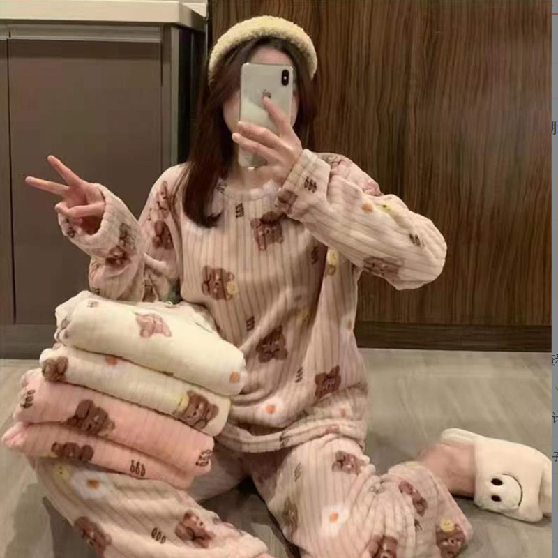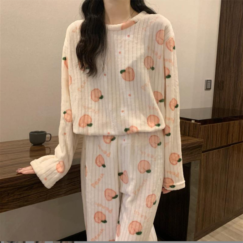 두꺼운 복숭아 따뜻한 세트 여성의 2024 가을과 겨울 만화 달콤한 산호 양털 잠옷 둥근 목 홈스토어 가기