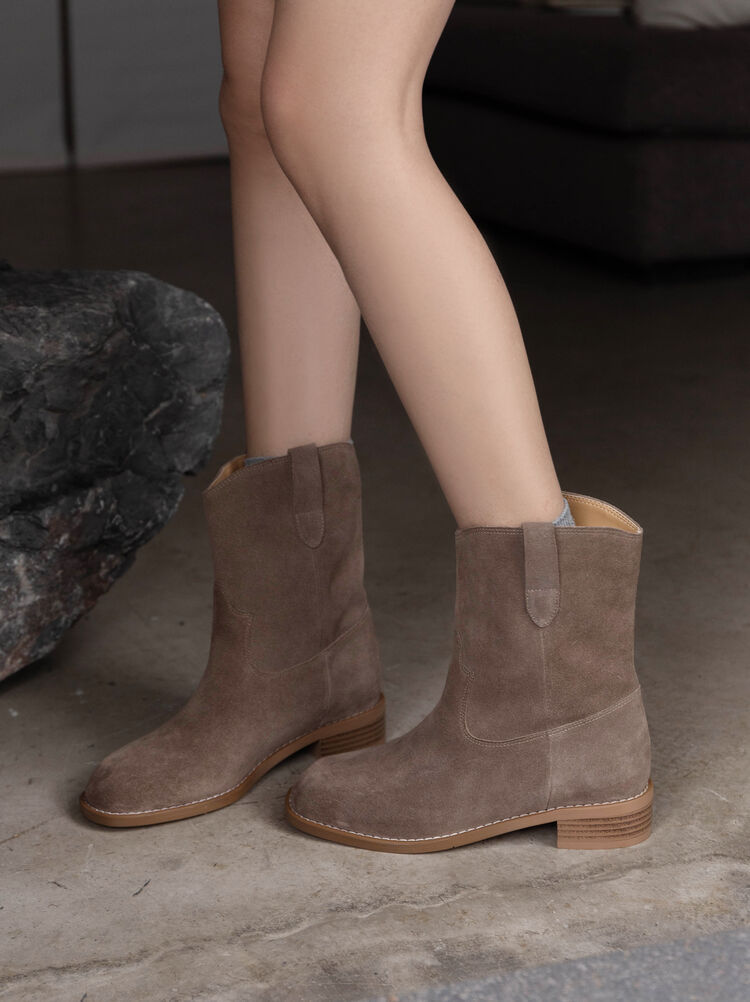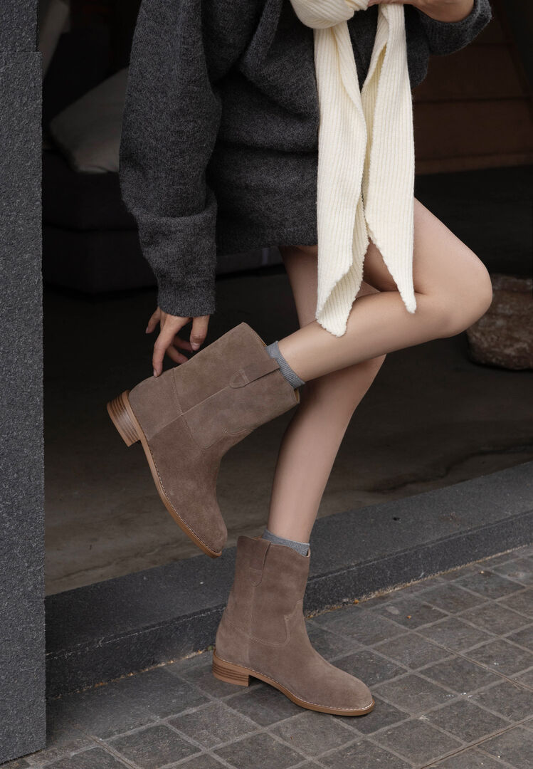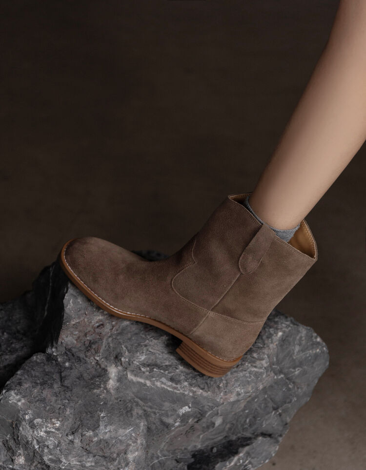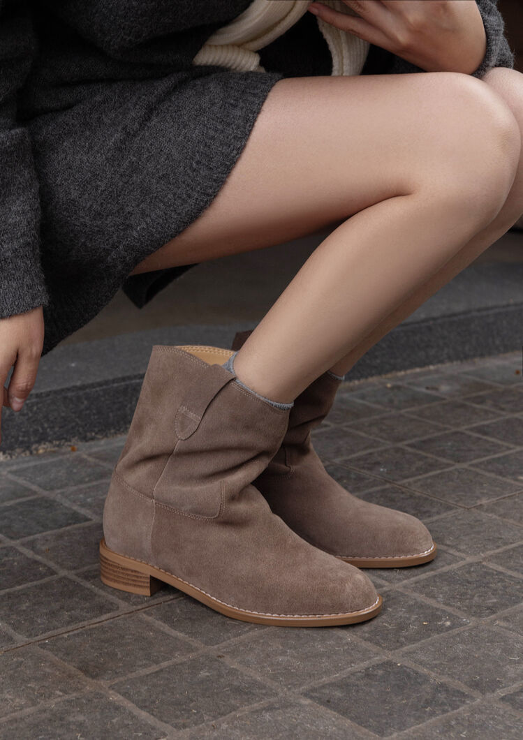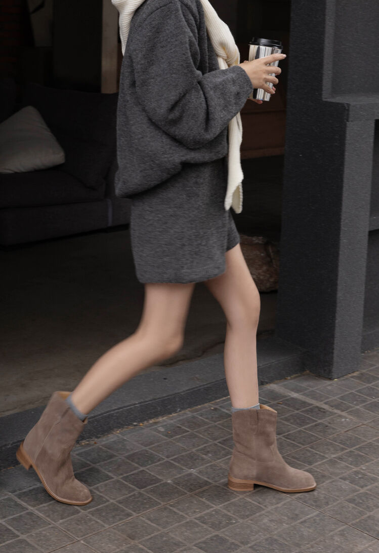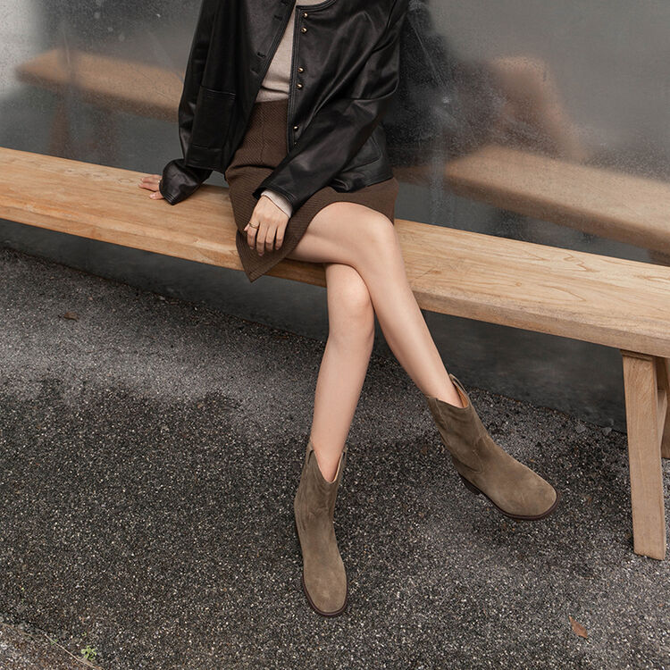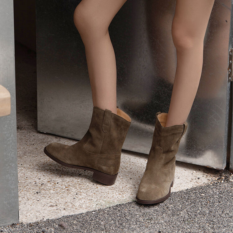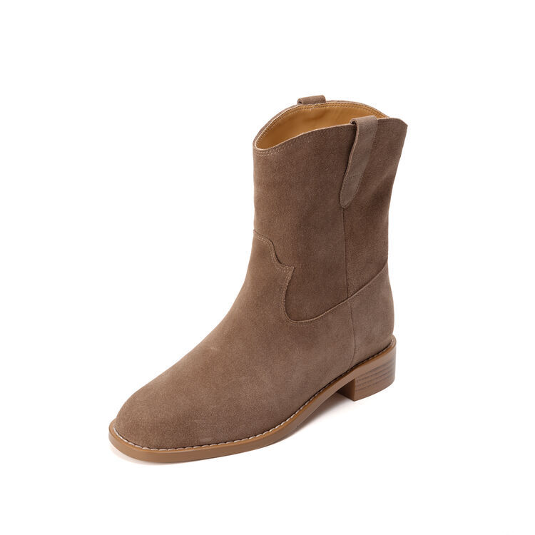 쇼트 부츠 여성용 라운드 헤드 두꺼운 미드 힐 와이드 부츠 가을 뉴 슬리브 솔리드 컬러 소 플립 가죽 한국 스타일 쇼트 부츠 여성 싱글 부츠