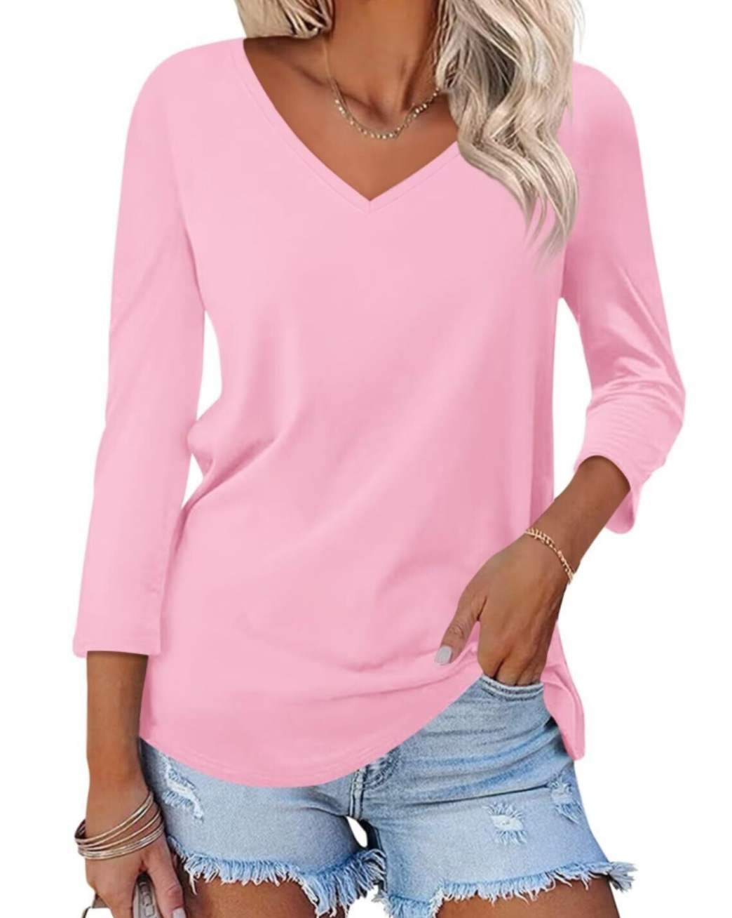유럽과 미국 여성의 브이넥 슬림 긴팔 셔츠 7부 5부 반팔 티셔츠 3D 프린트 탑