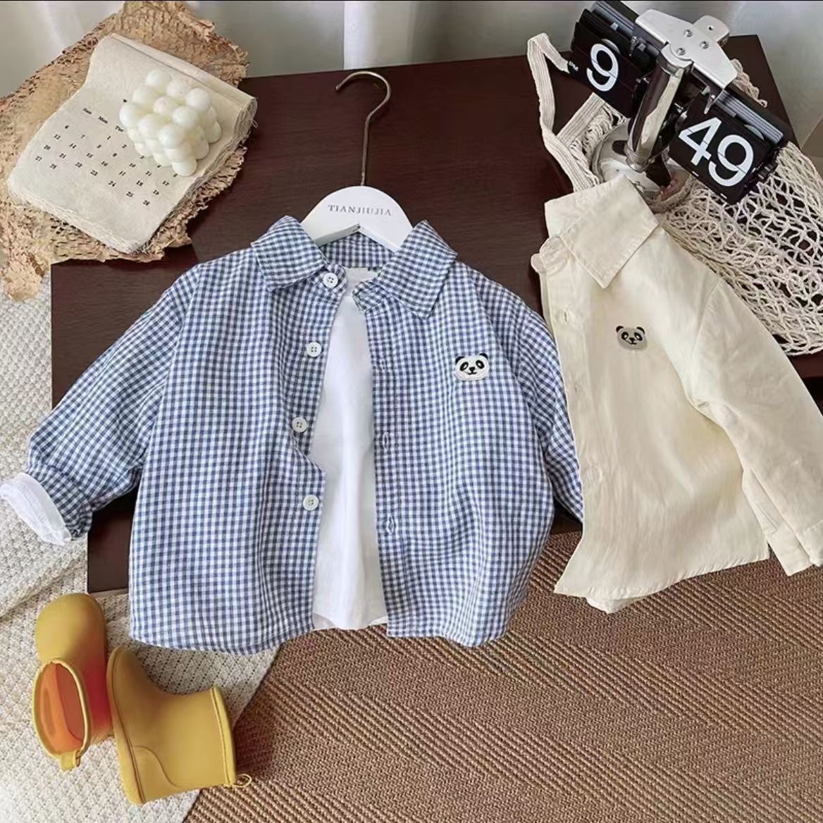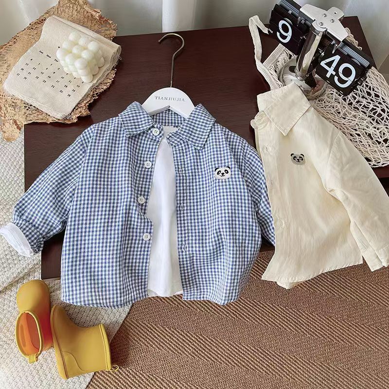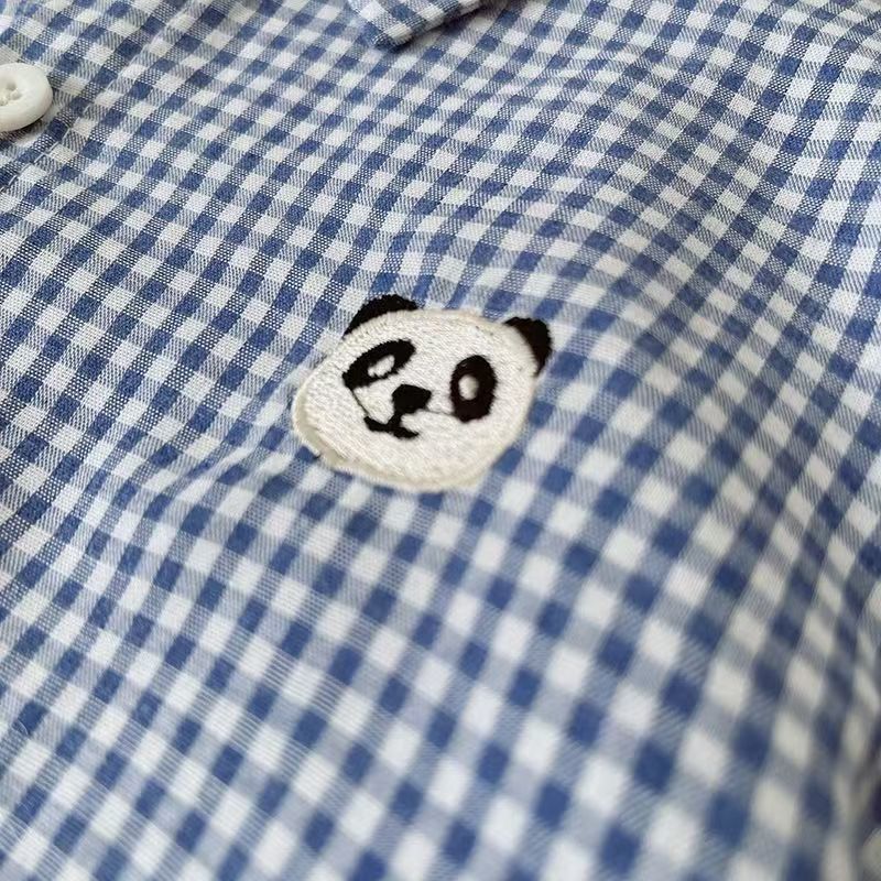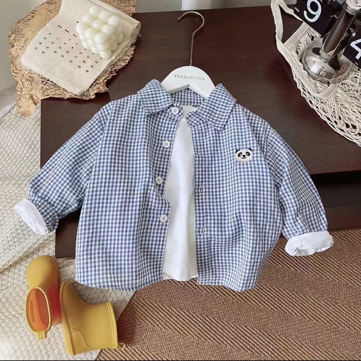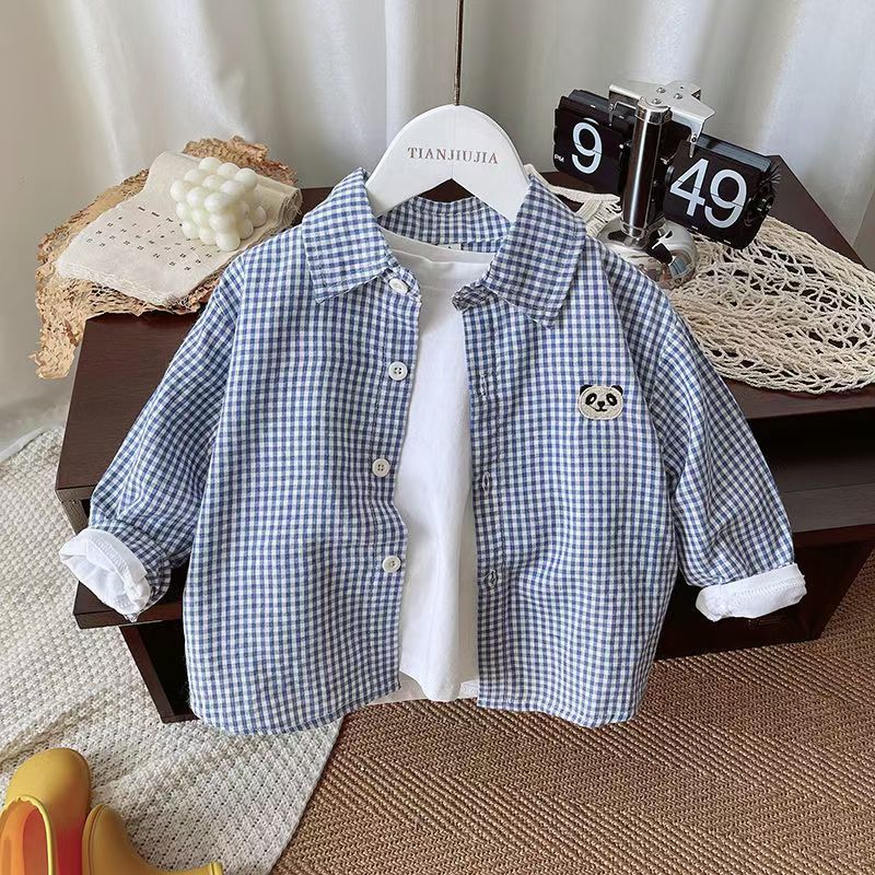 어린이 캐주얼 긴 소매 셔츠 캐주얼 귀여운 팬더 셔츠 블루 격자 무늬 소년 가을 원피스 어린이 원피스 소녀상스토어 가기