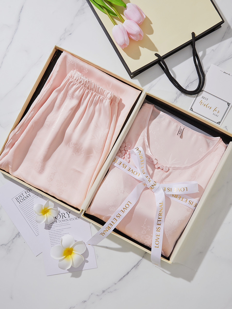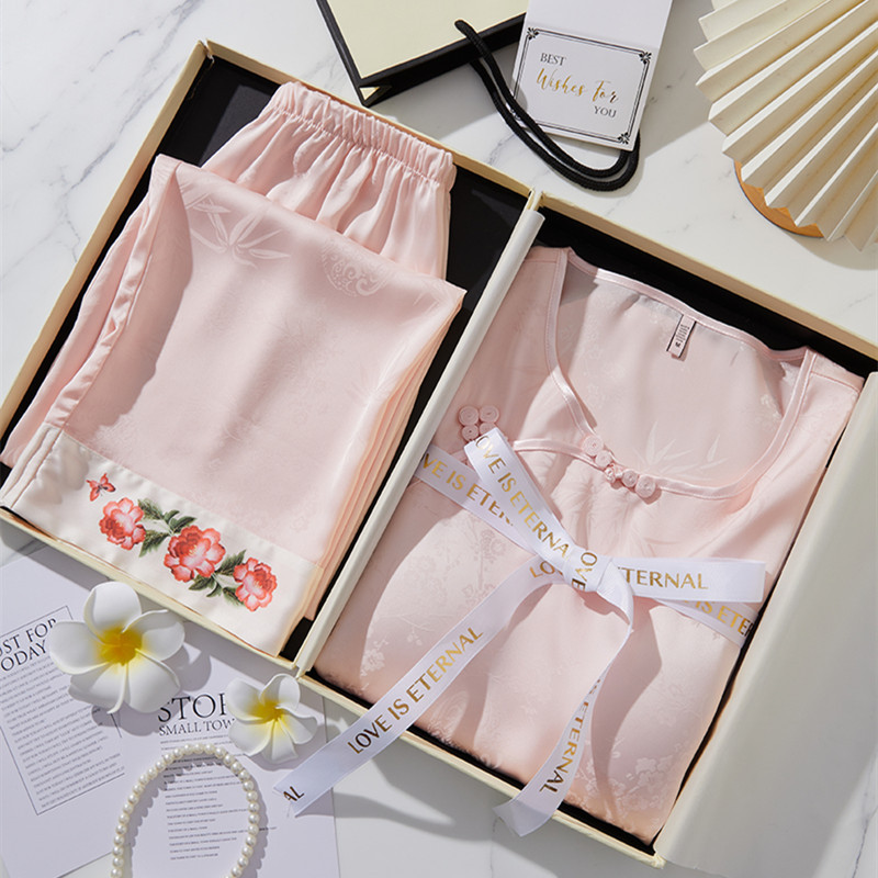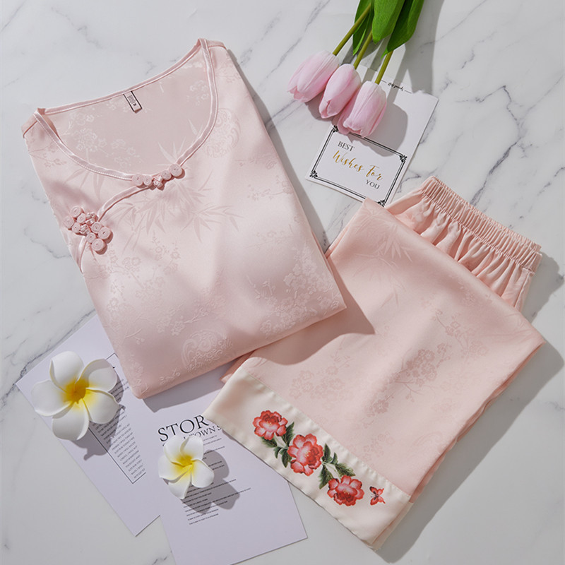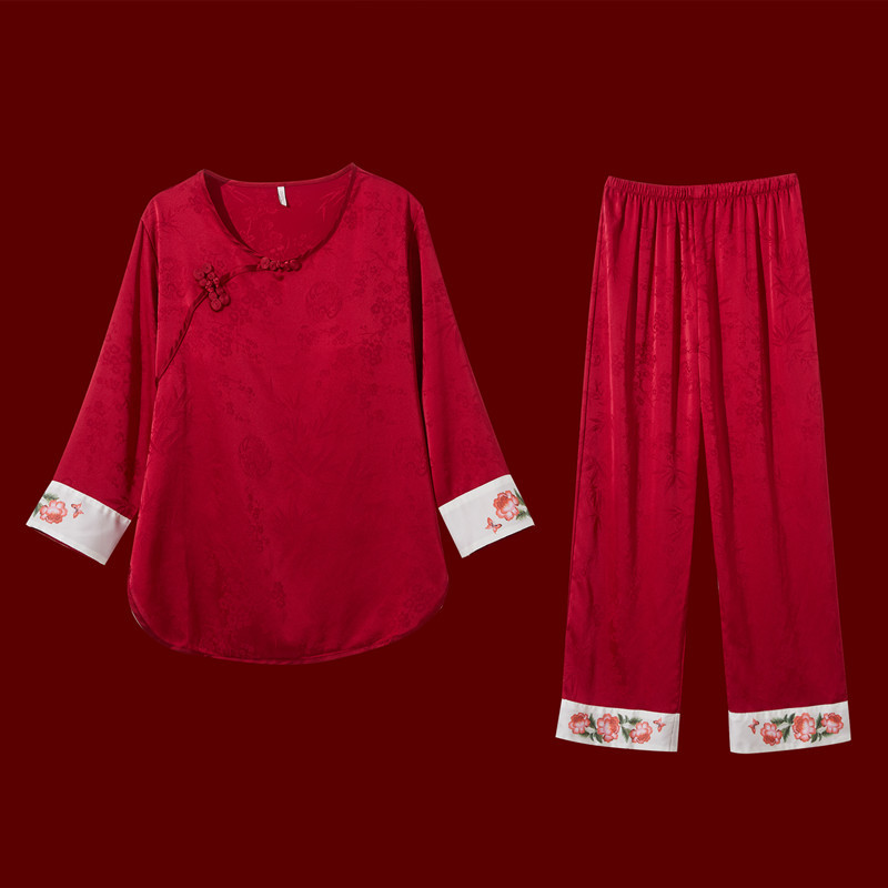 빨간 얼음 실크 파자마 여성의 새로운 중국 스타일 외부 가슴 패드로 국가 스타일을 입고 홈 옷 세트 어머니의 생일 선물