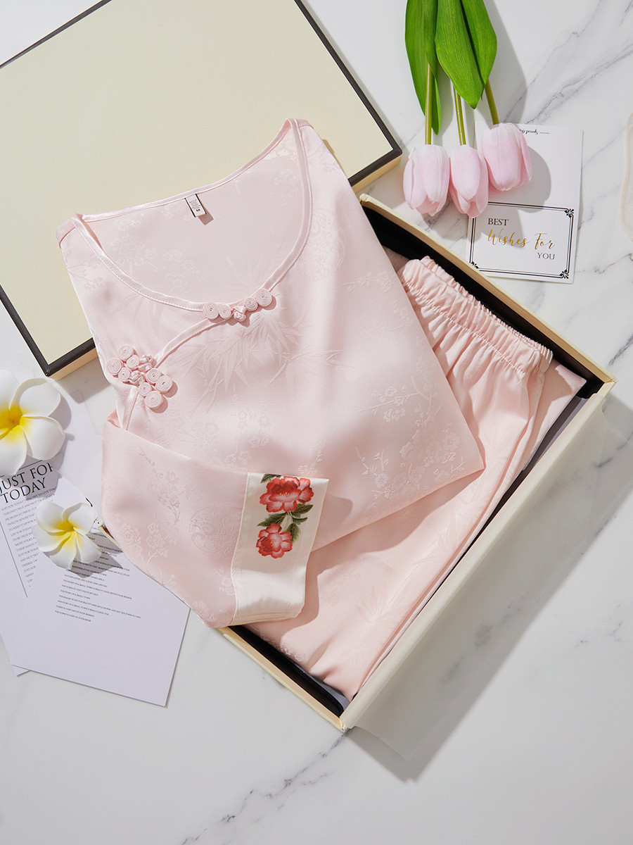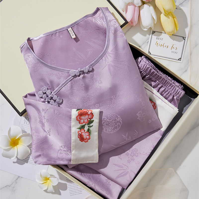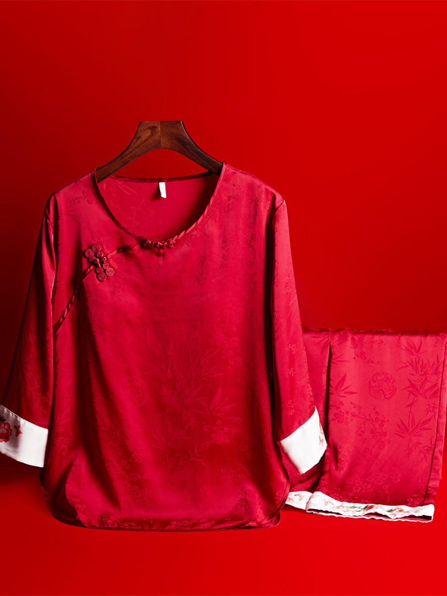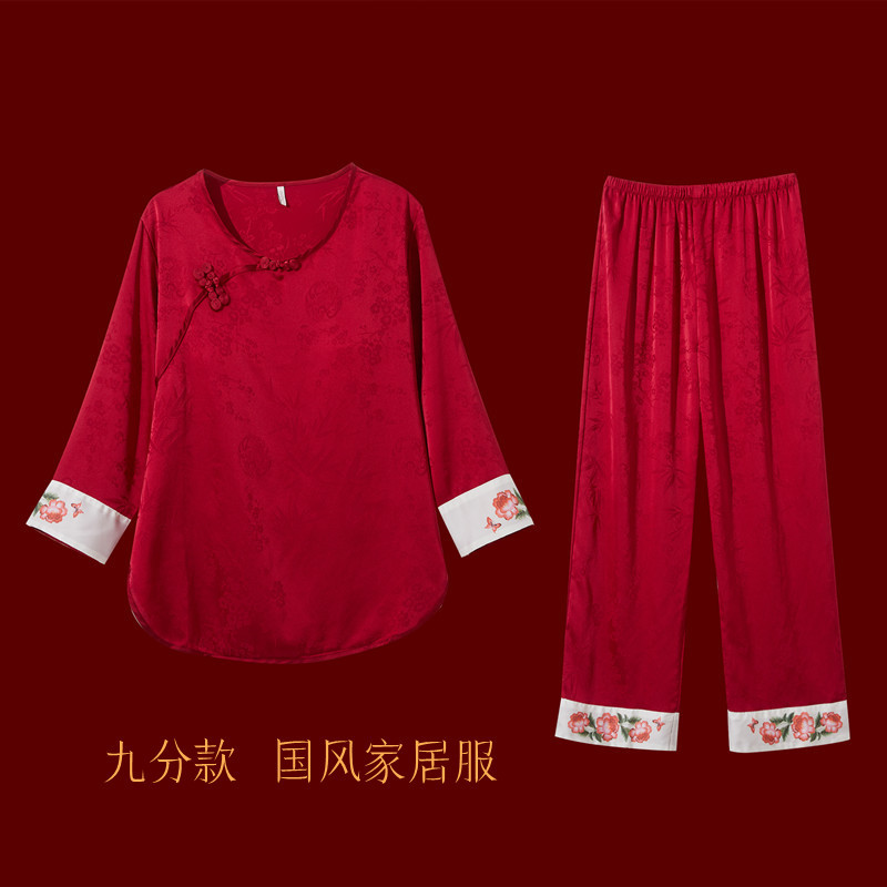 빨간 얼음 실크 파자마 여성의 새로운 중국 스타일 외부 가슴 패드로 국가 스타일을 입고 홈 옷 세트 어머니의 생일 선물스토어 가기
