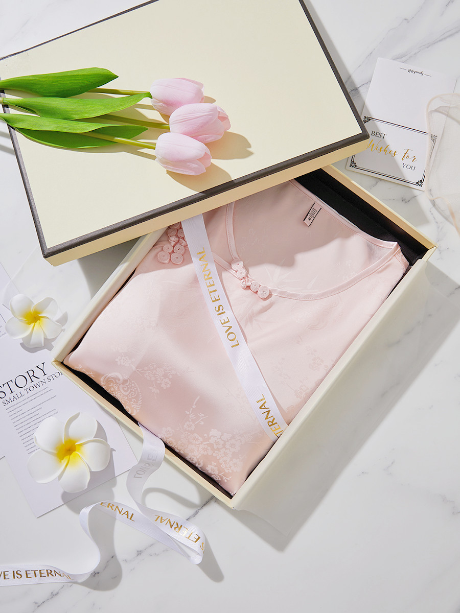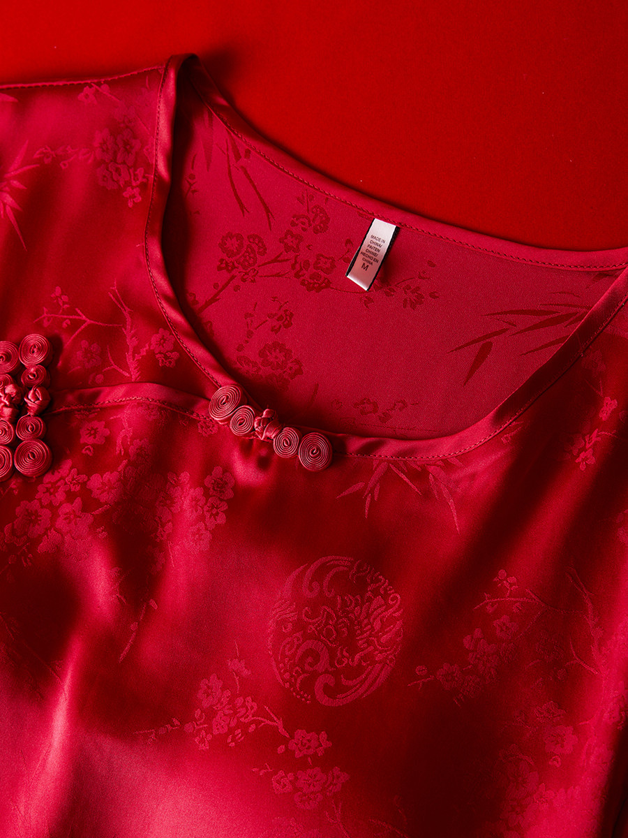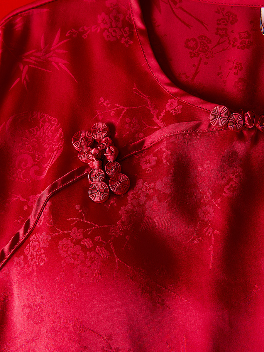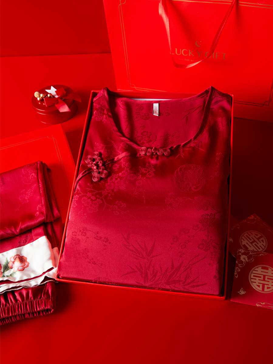 빨간 얼음 실크 파자마 여성의 새로운 중국 스타일 외부 가슴 패드로 국가 스타일을 입고 홈 옷 세트 어머니의 생일 선물스토어 가기