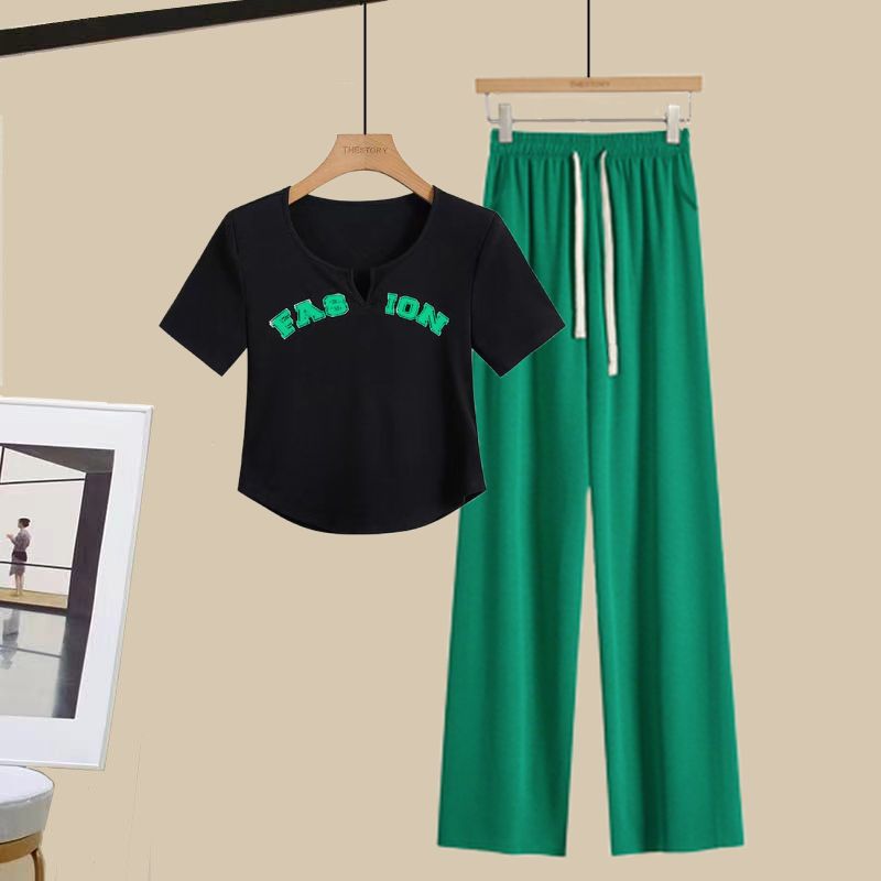싱글/여름 새로운 패션 세트 여성 디자인 센스 짧은 최고 짧은 소매 티셔츠 아이스 실크 넓은 다리 바지스토어 가기