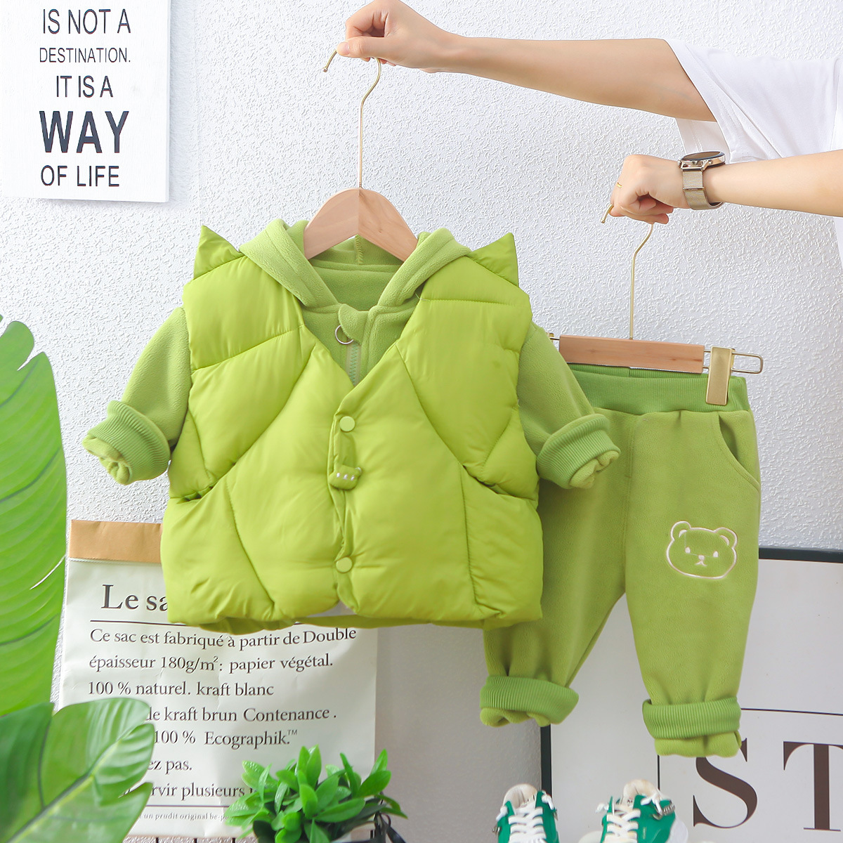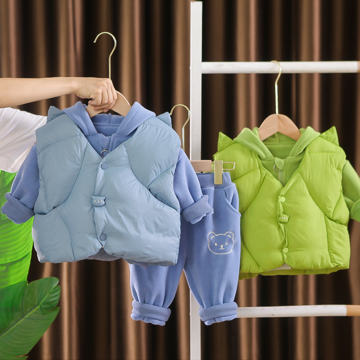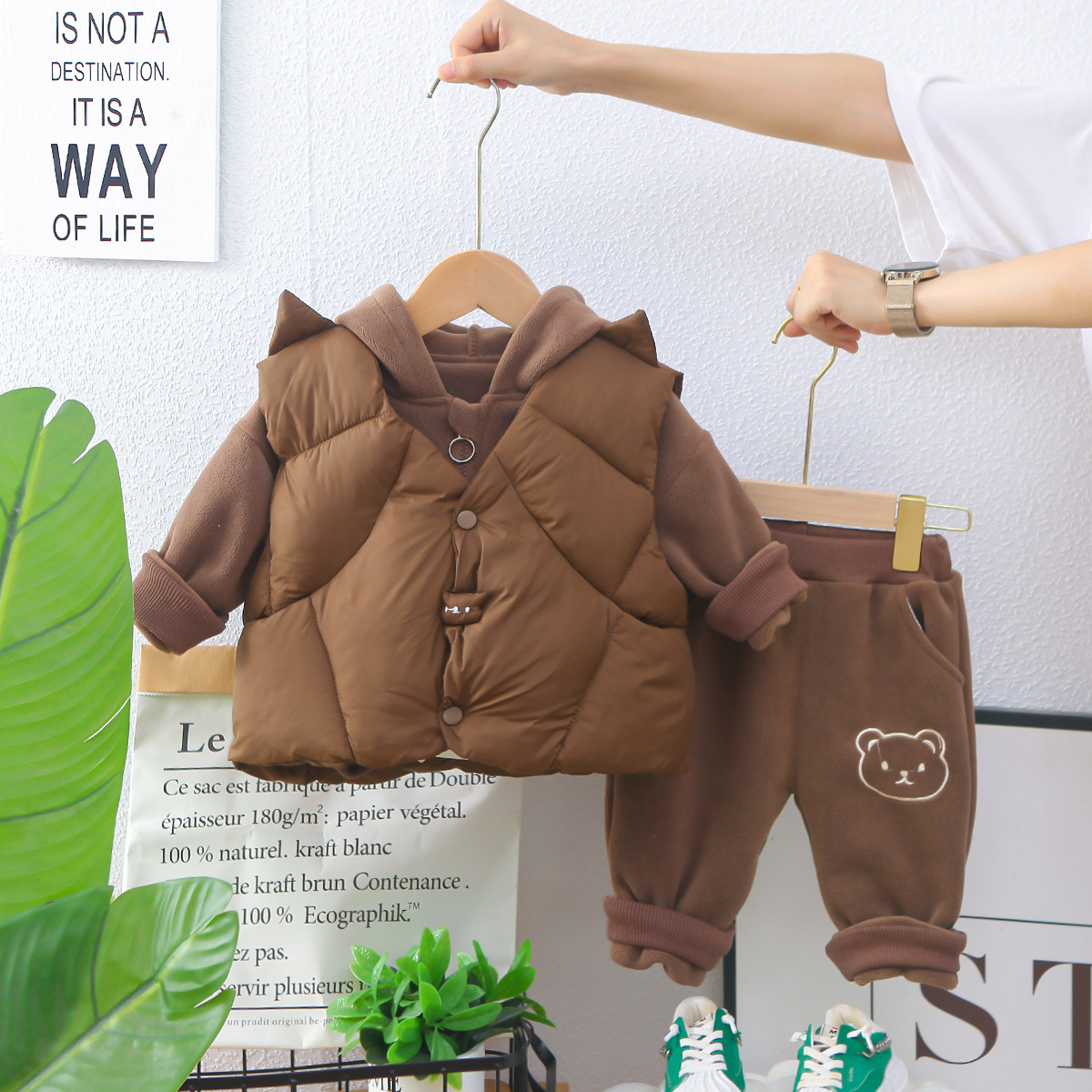 소년 겨울 옷 기모 두꺼운 3 조각 세트 2024 새로운 어린이 가을과 겨울 아기 조끼 땀 세트