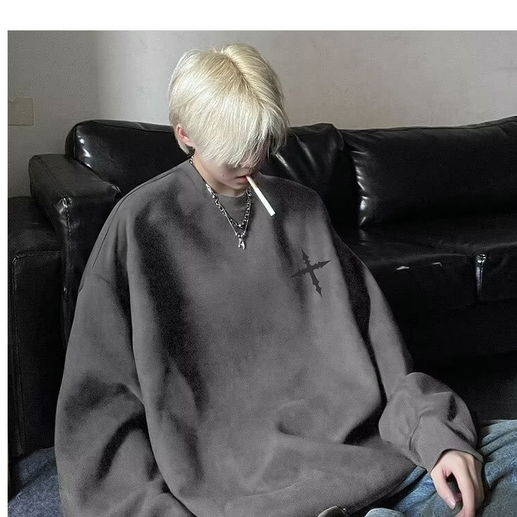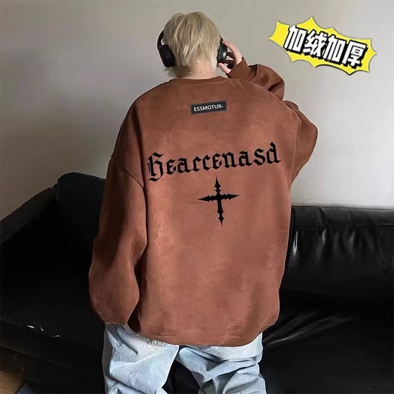 Deerskin 양털 겨울 스웨트 셔츠 남성용 아메리칸 스타일 기모 두꺼운 느슨한 탑 하이 스트리트 트렌디 브랜드 빈티지 라운드 넥 재킷