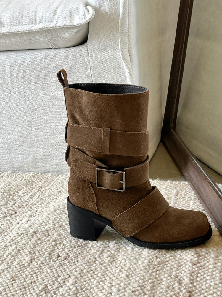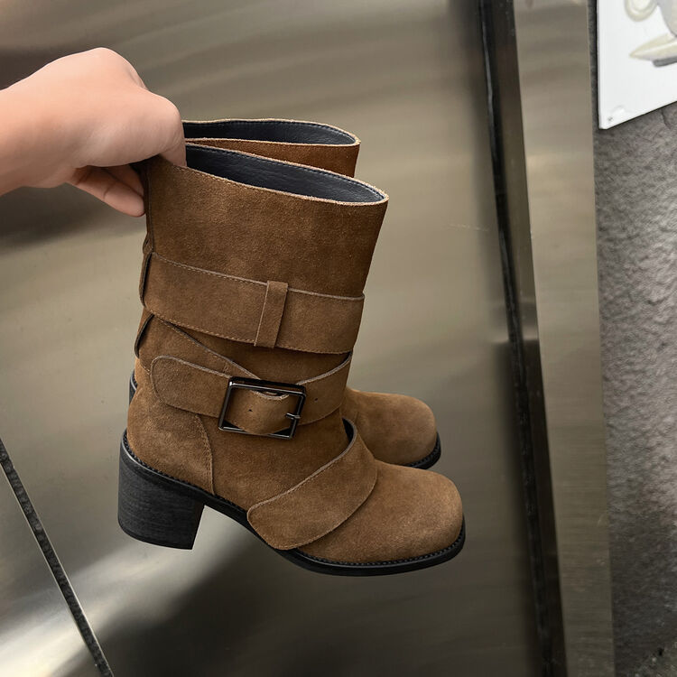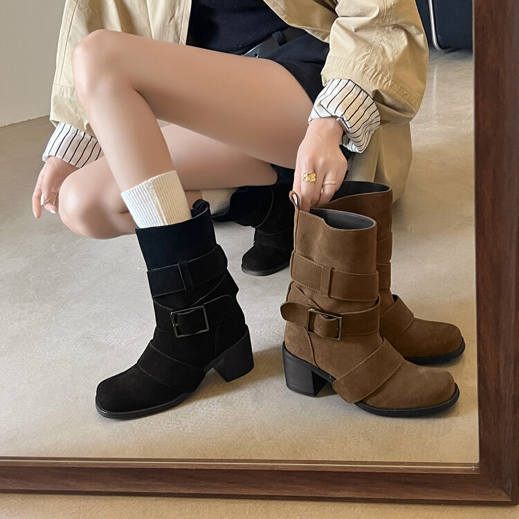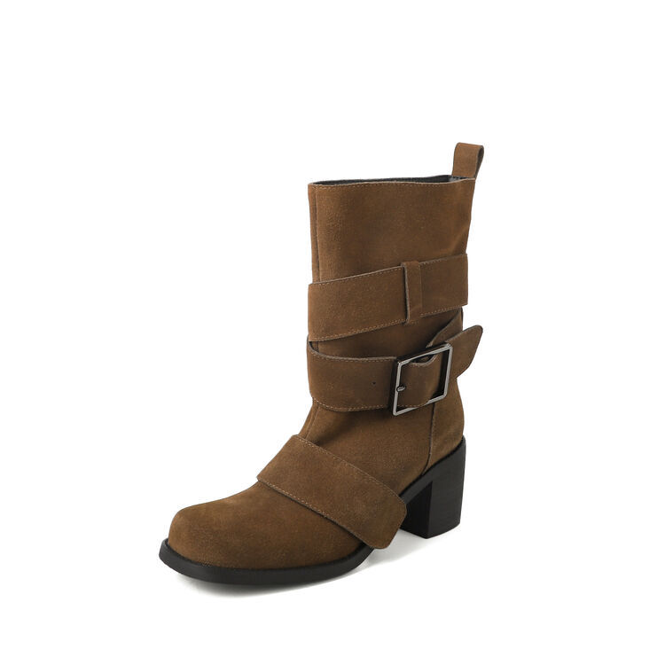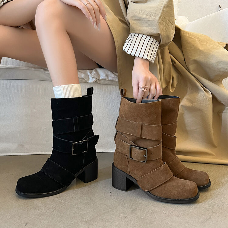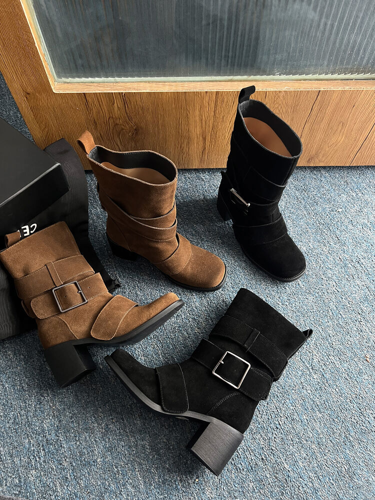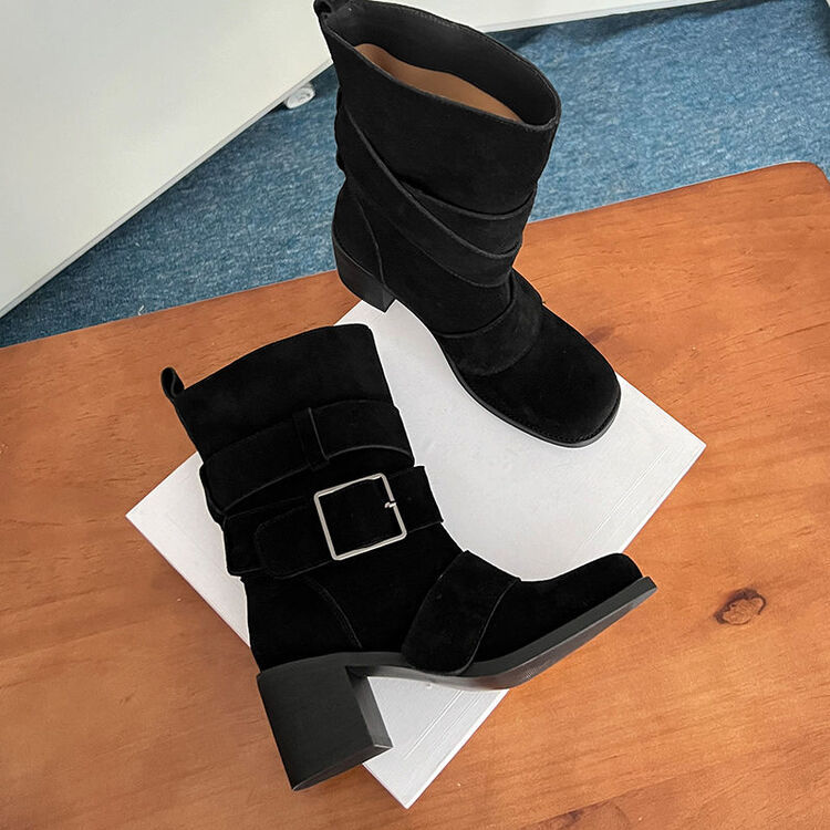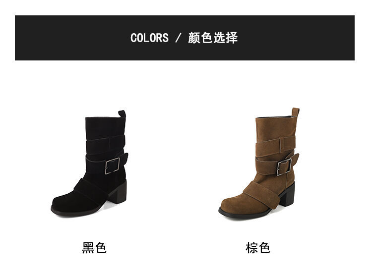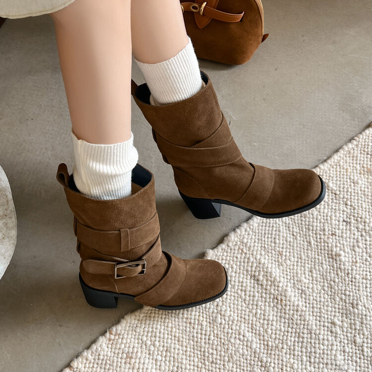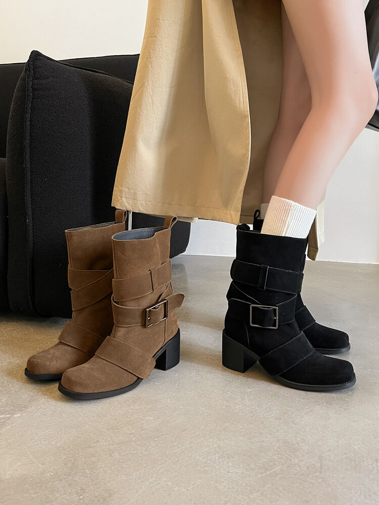 소 턴 업 가죽 부츠 여성 벨트 버클 싱글 부츠 가을과 겨울 새로운 라운드 헤드 두꺼운 힐 하이힐 여성용 짧은 부츠 부츠스토어 가기