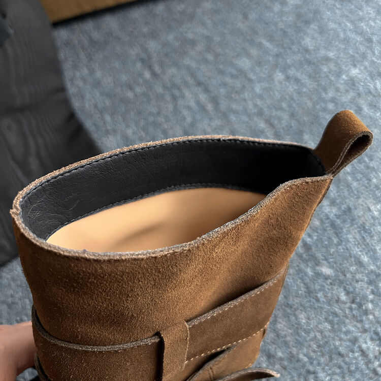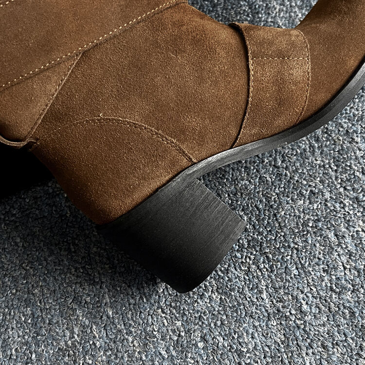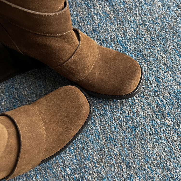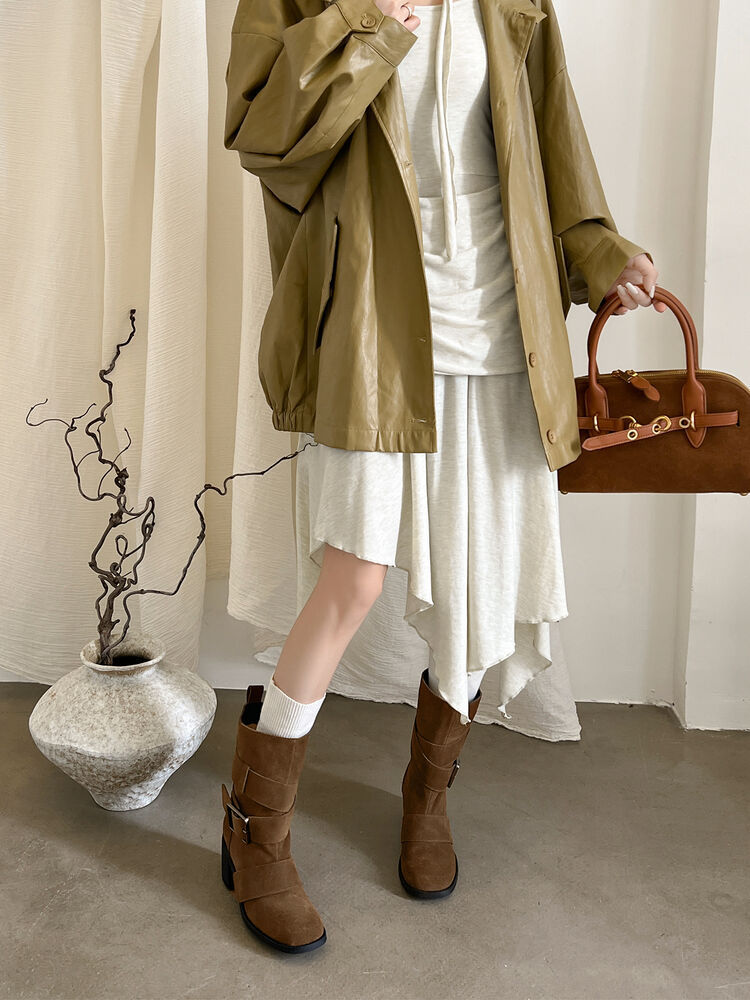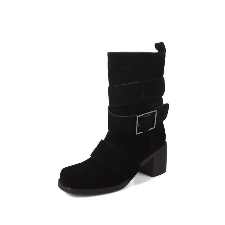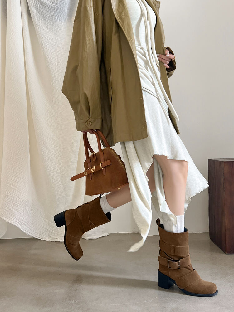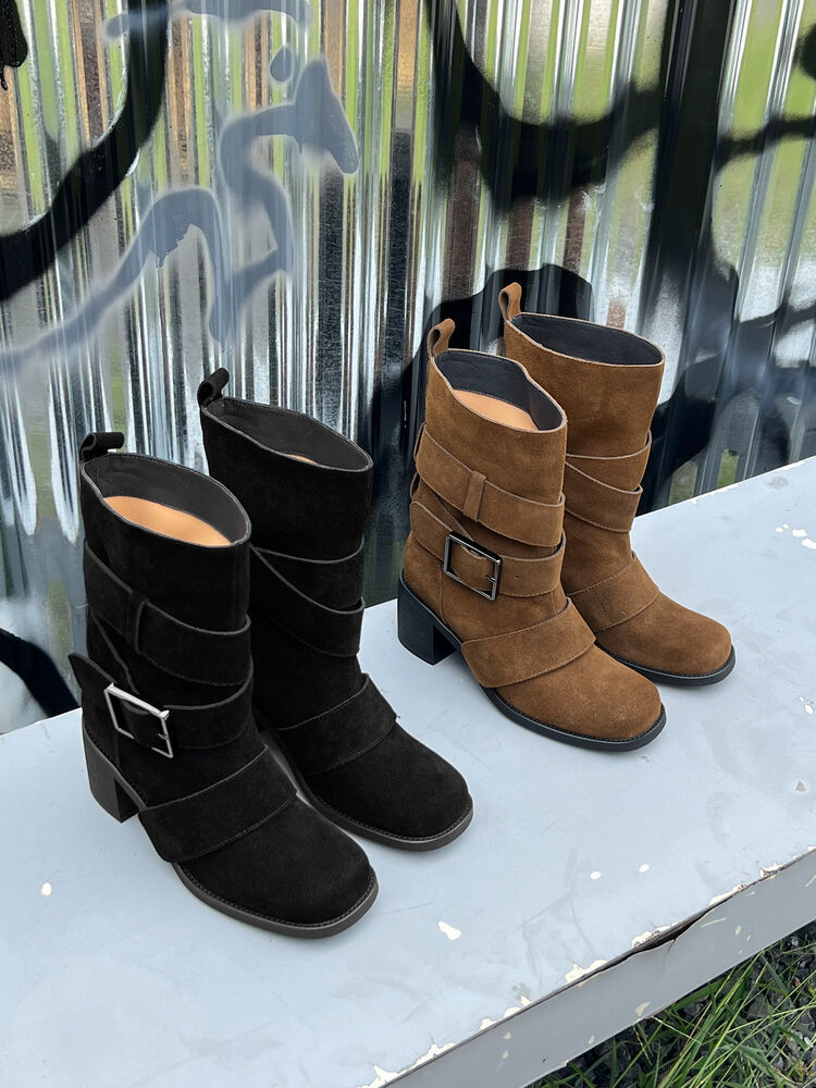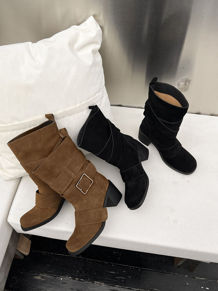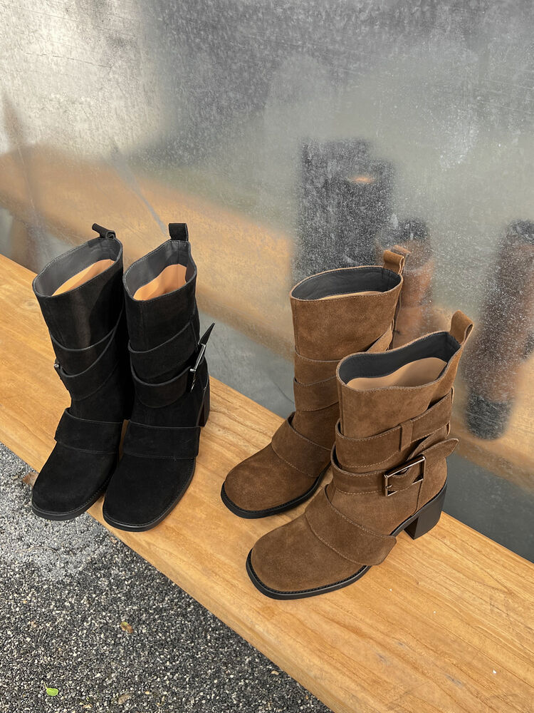 소 턴 업 가죽 부츠 여성 벨트 버클 싱글 부츠 가을과 겨울 새로운 라운드 헤드 두꺼운 힐 하이힐 여성용 짧은 부츠 부츠스토어 가기