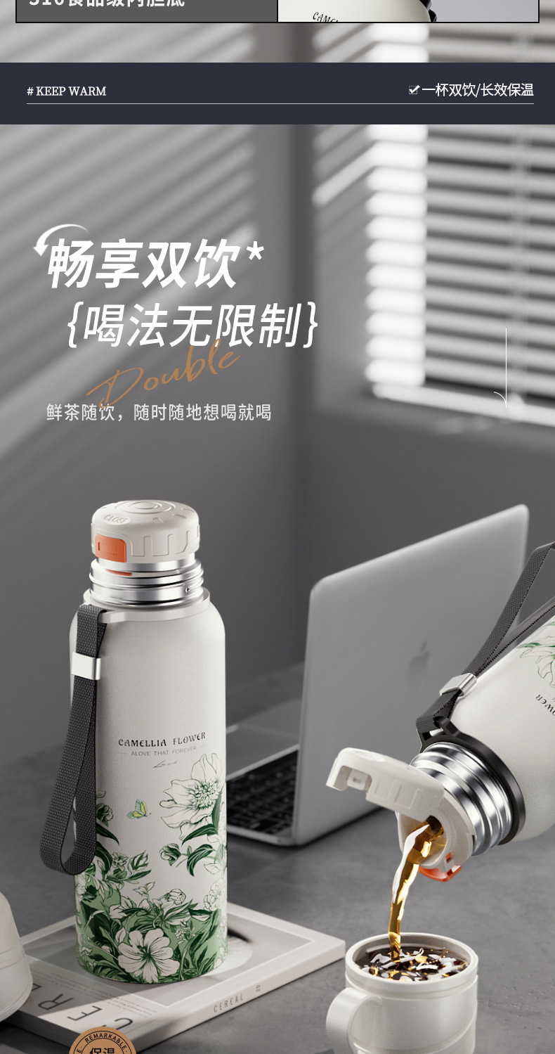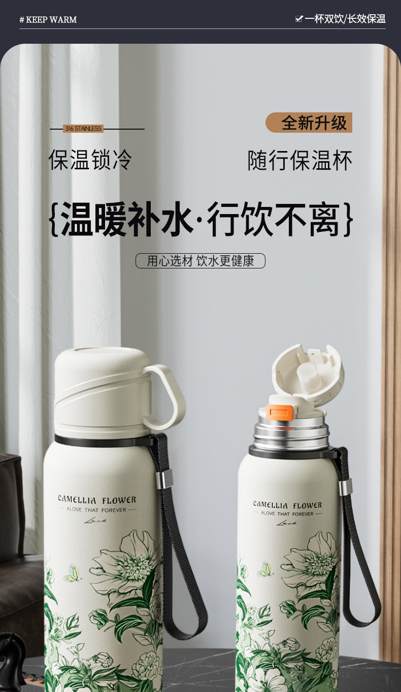 하오디 316 스테인리스 대용량 동백꽃 보온병 여성용 고급스러운 디자인 야외용 가정용 휴대용 보온병