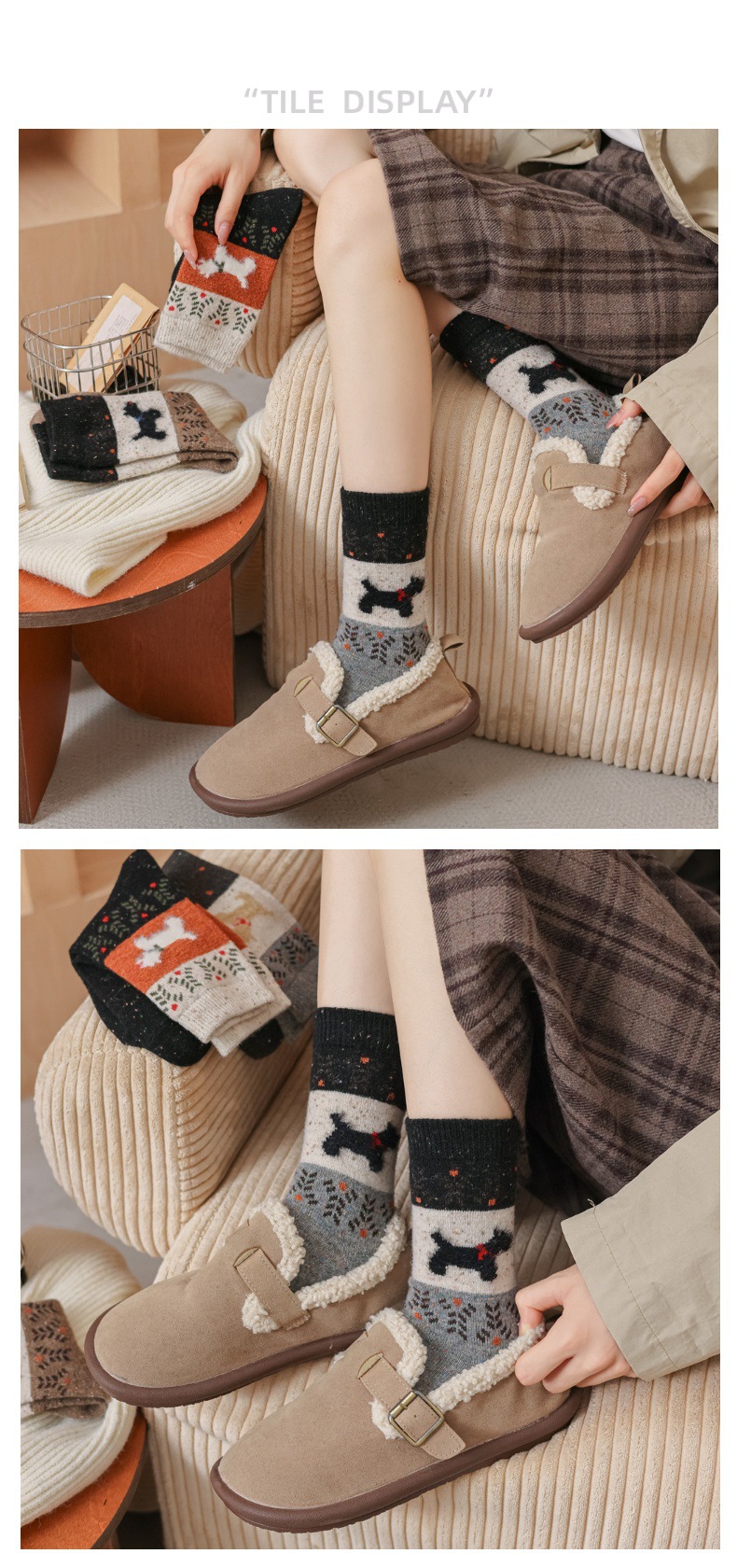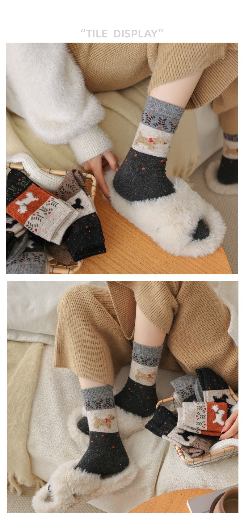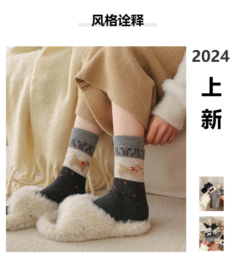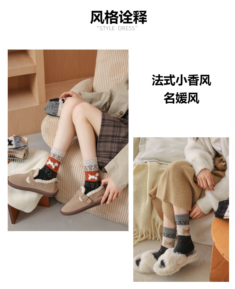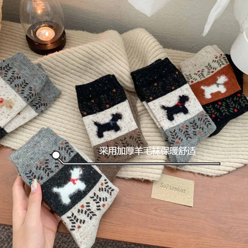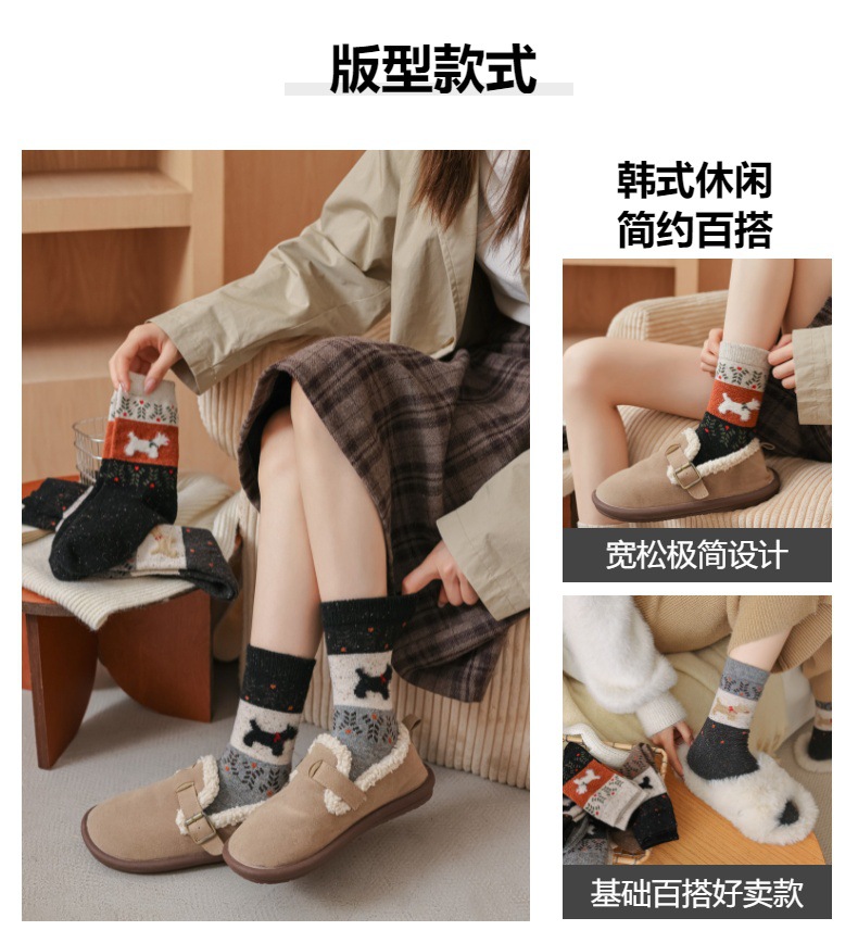 여성용 두꺼운 양말 가을 겨울용 플리스 안감 두꺼운 울 중목 양말 레트로 페어 아일 강아지 무늬 따뜻한 롱 양말스토어 가기